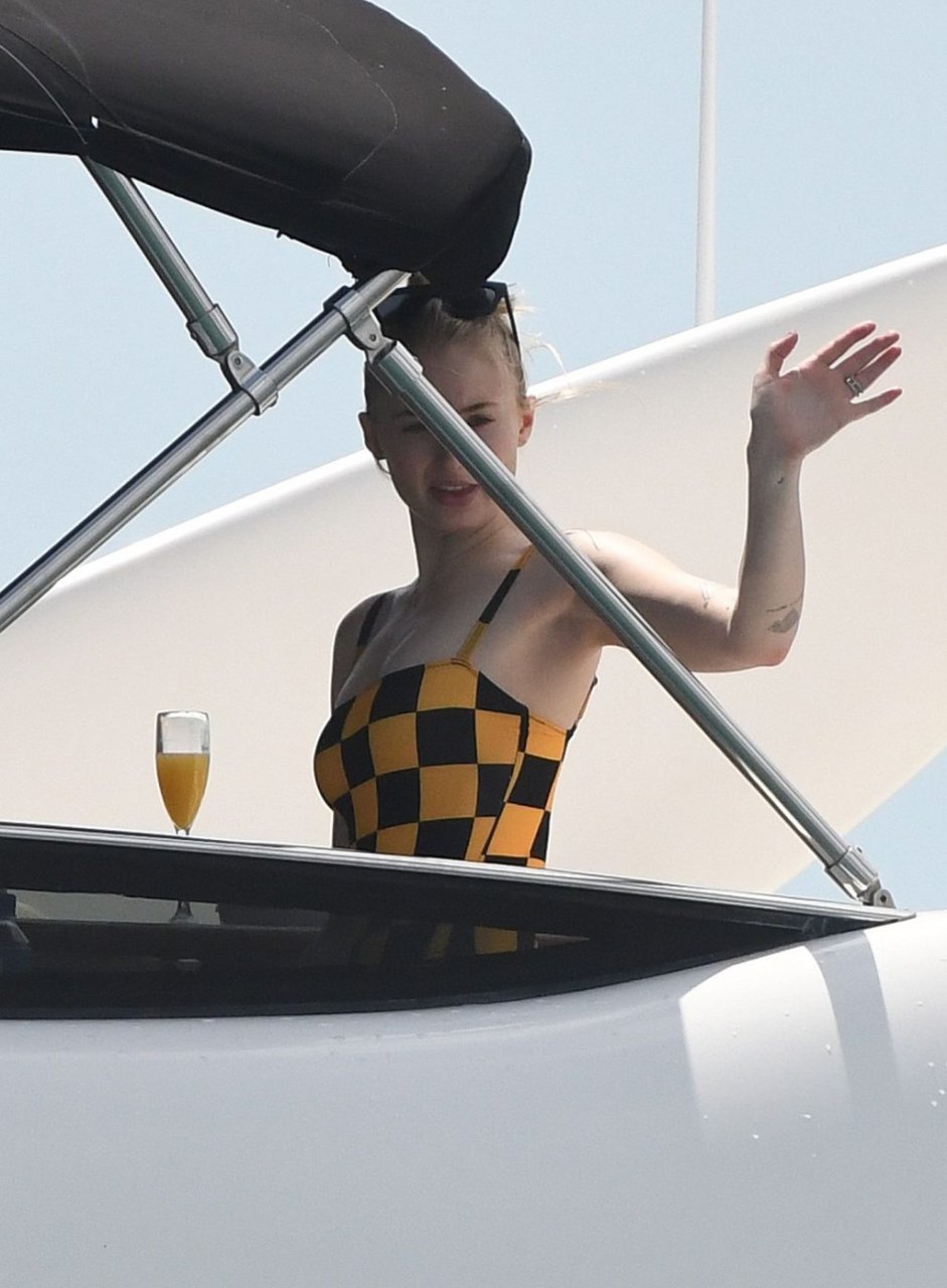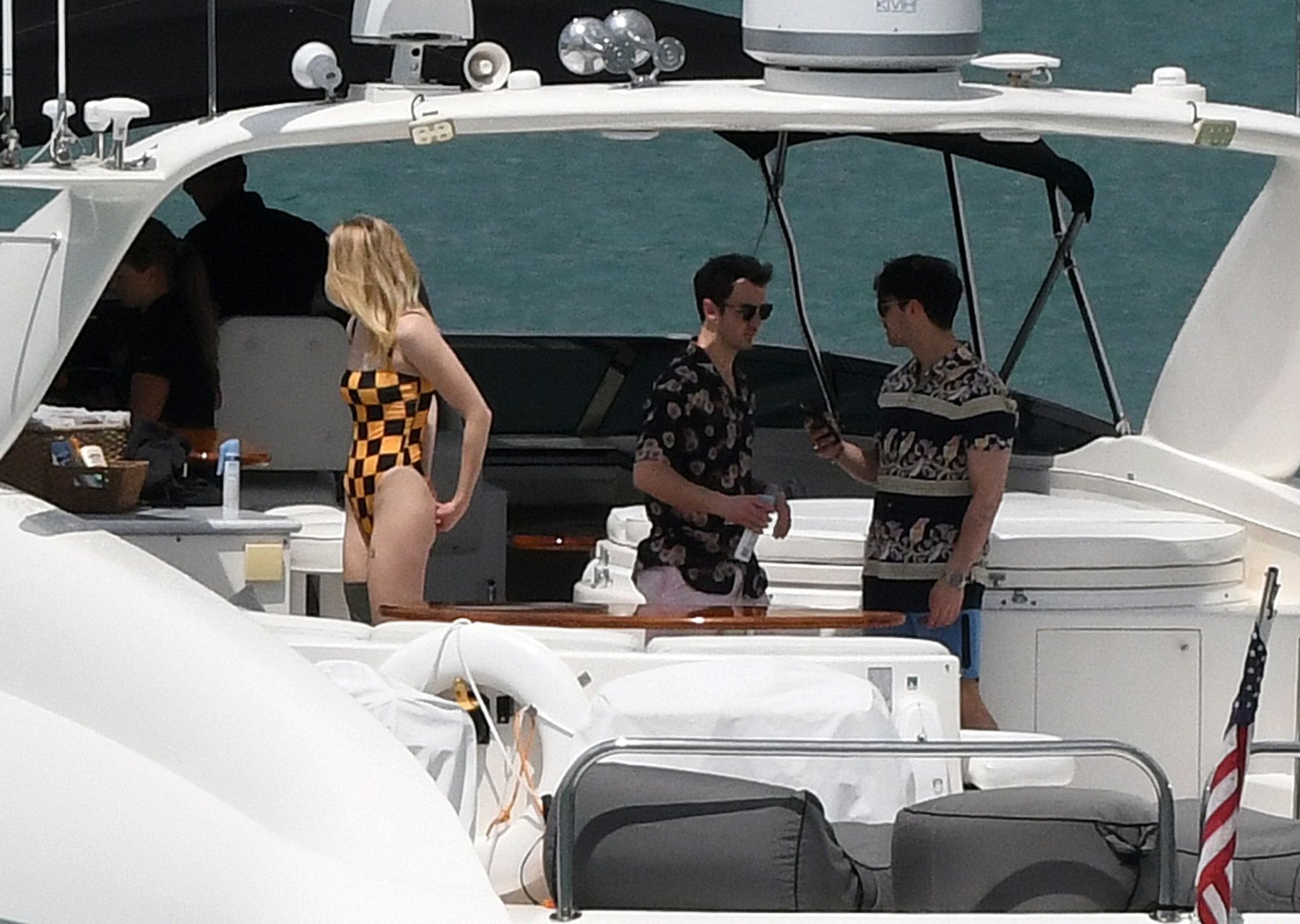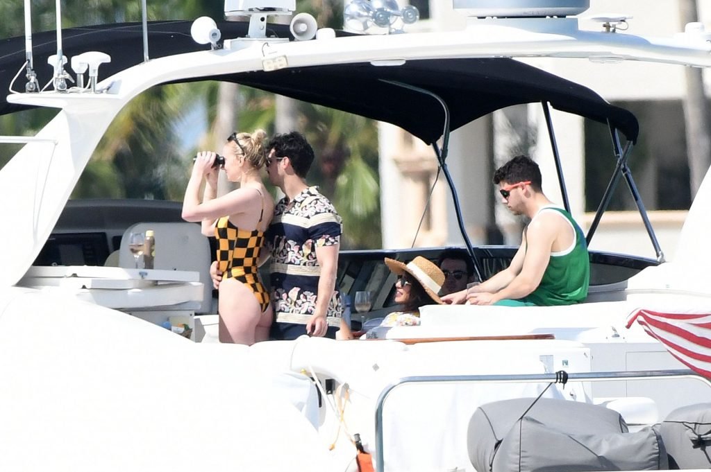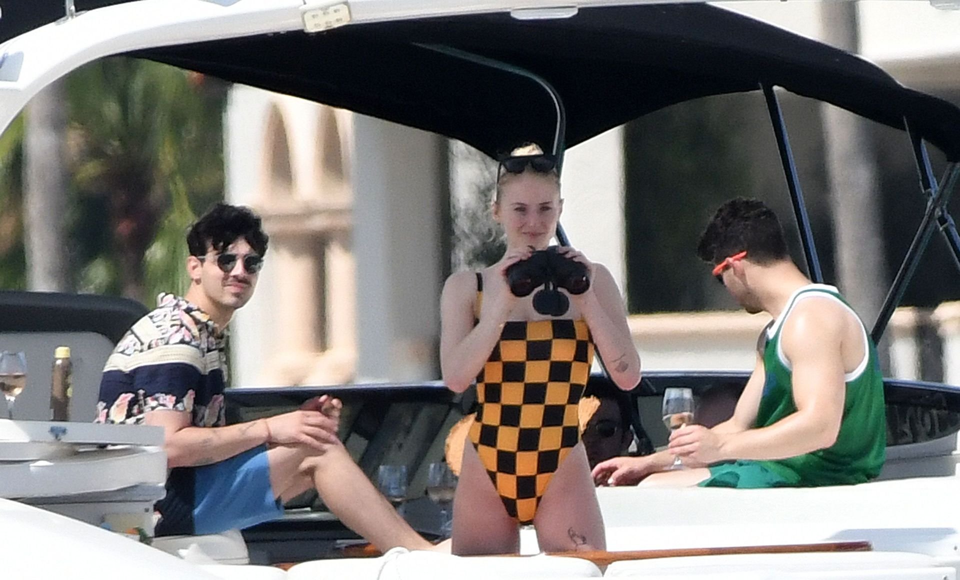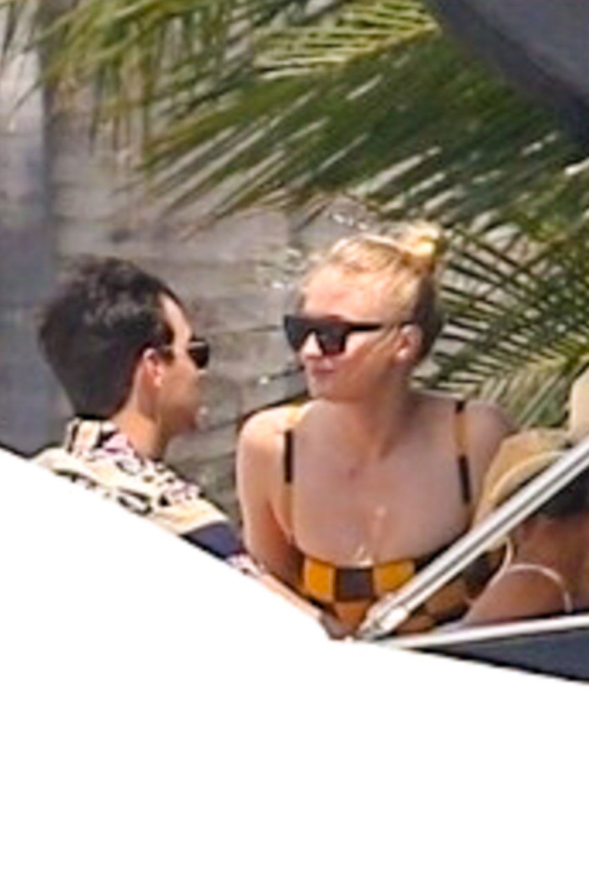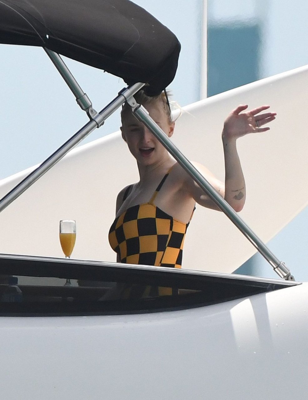 A estrela de “Game of Thrones” Sophie Turner usa um maiô xadrez enquanto curte com The Jonas Brothers e Priyanka Chopra em Miami, 25/03/2019.