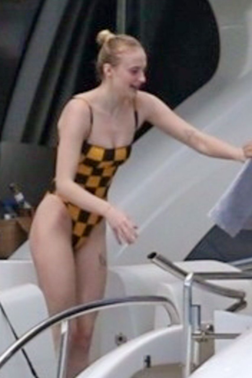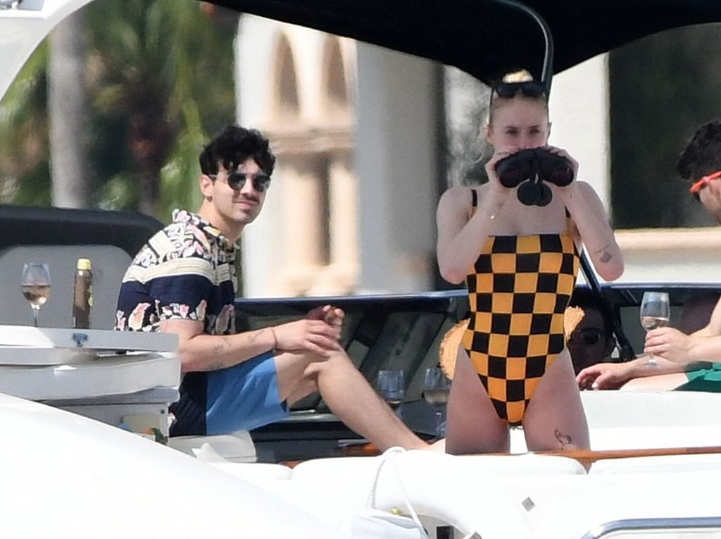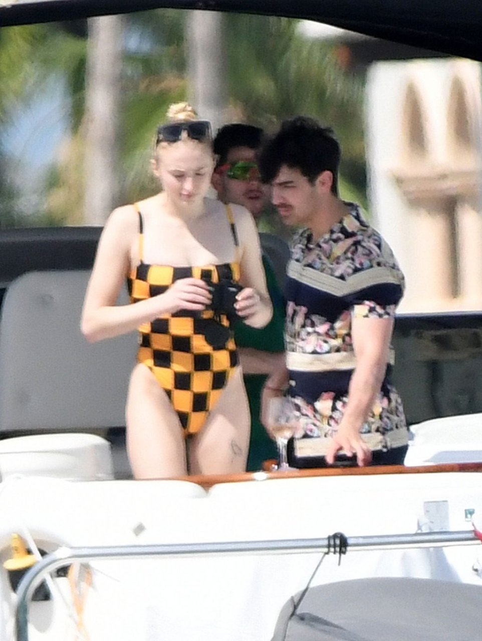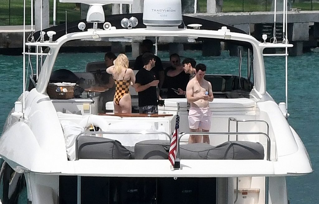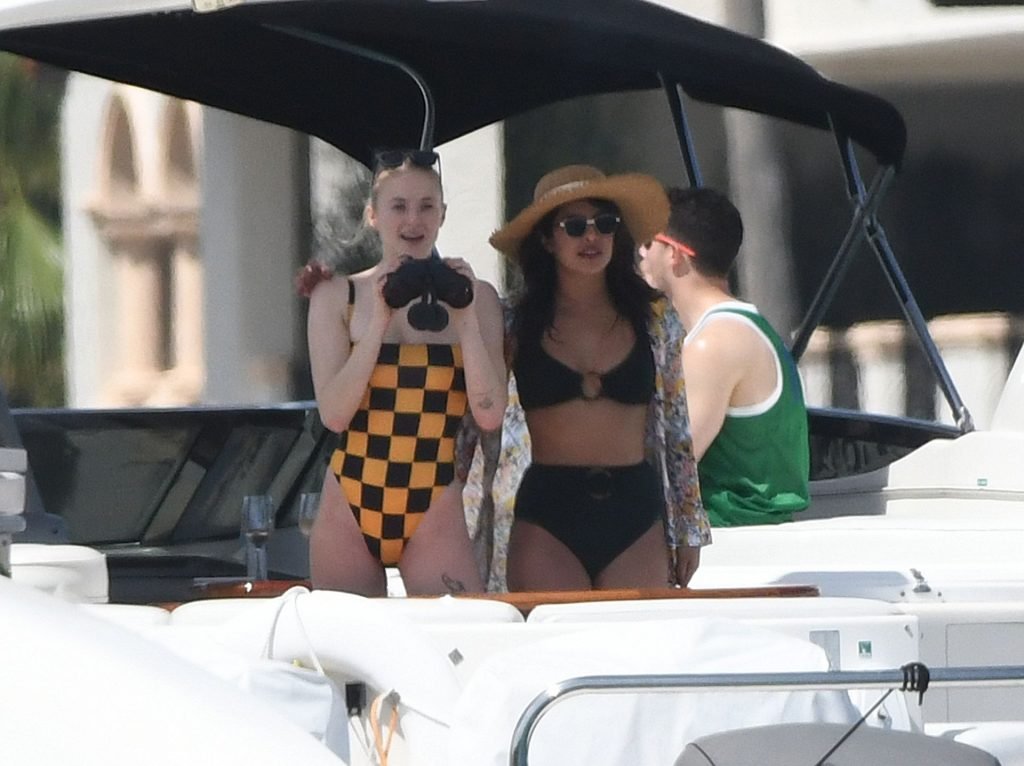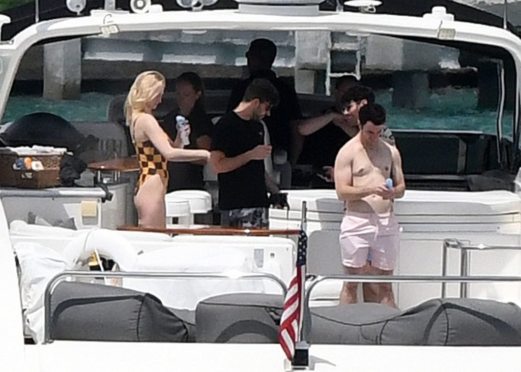 A estrela de “Game of Thrones” Sophie Turner usa um maiô xadrez enquanto curte com The Jonas Brothers e Priyanka Chopra em Miami, 25/03/2019.