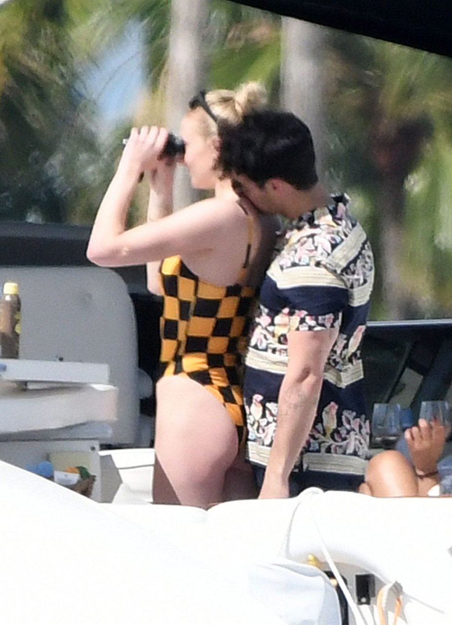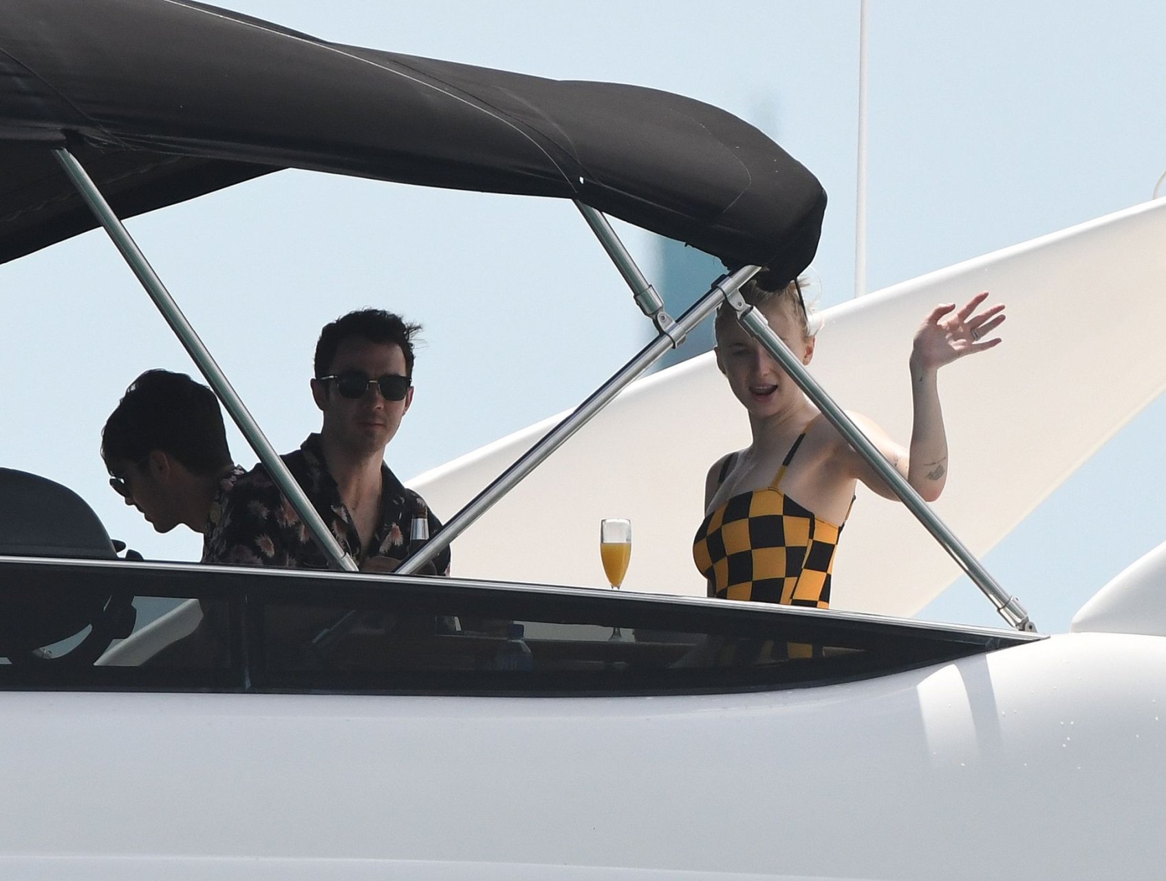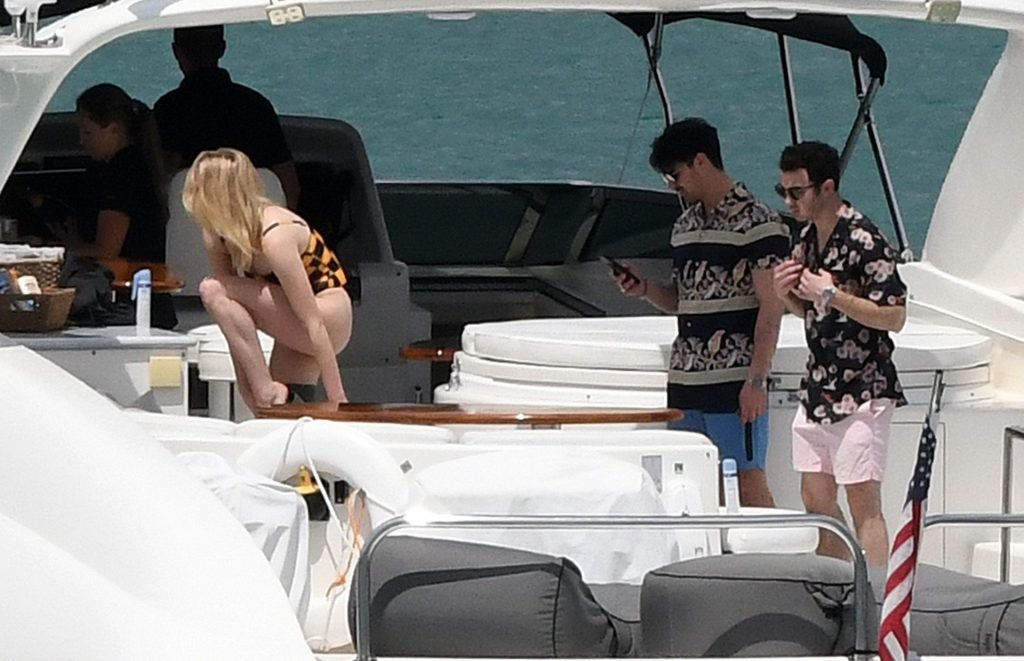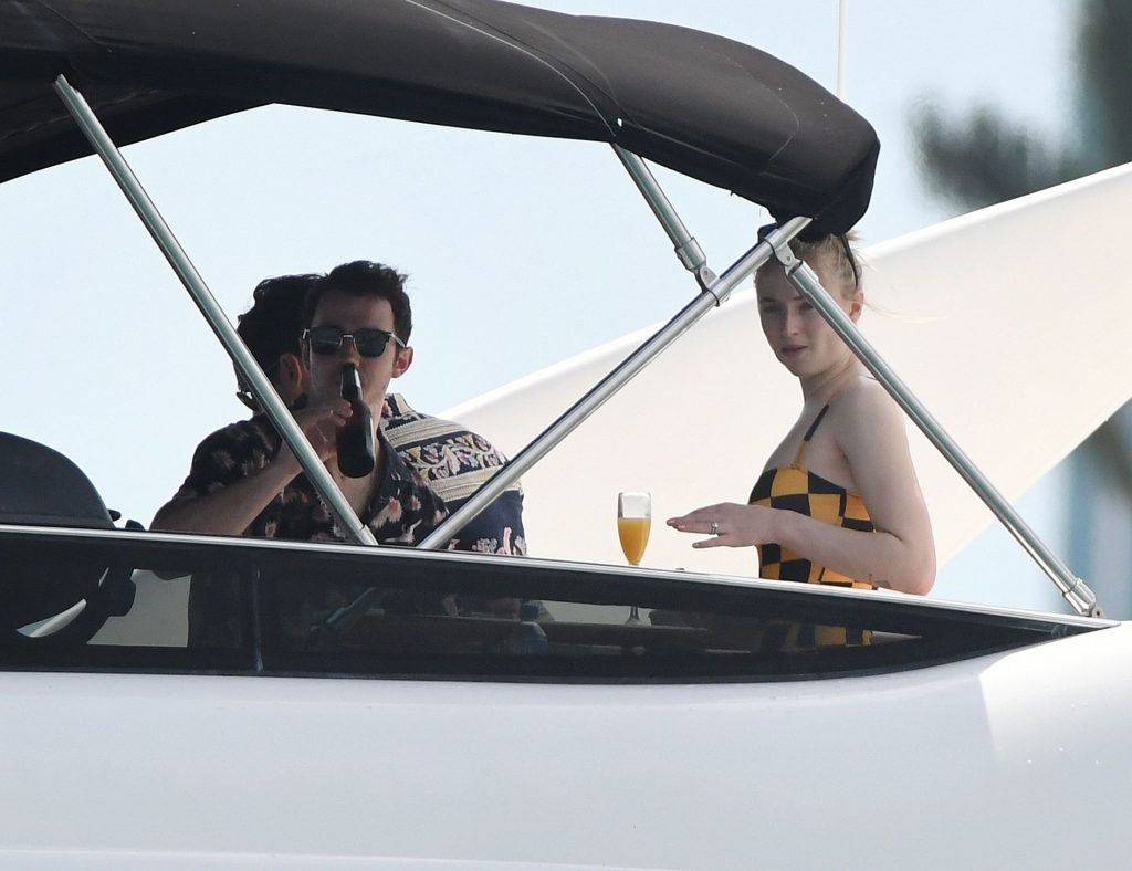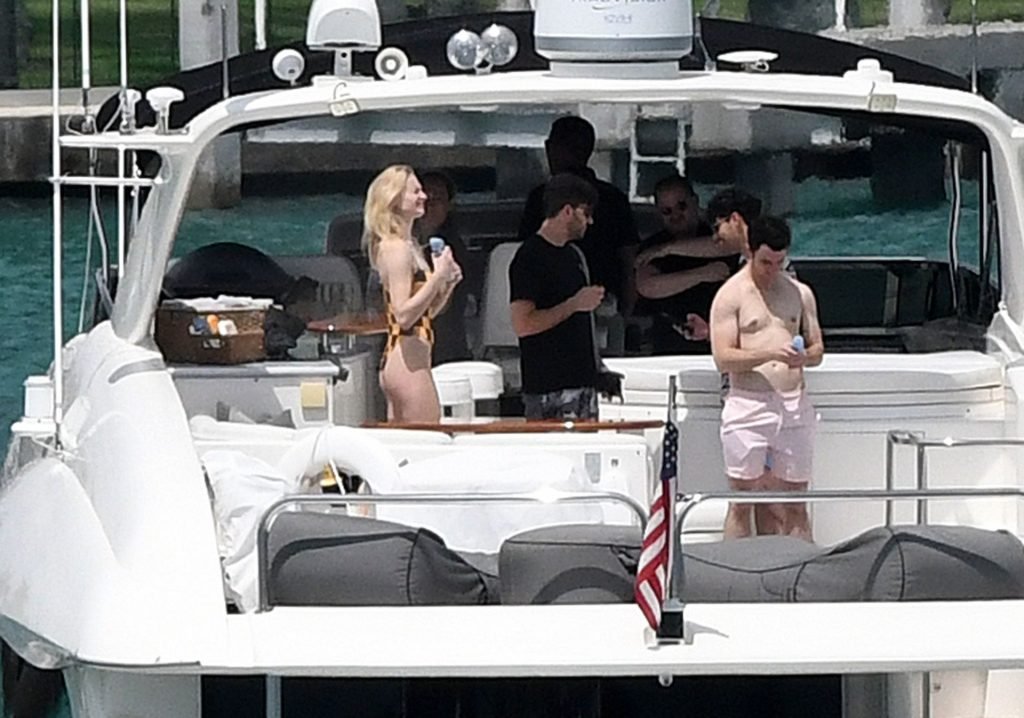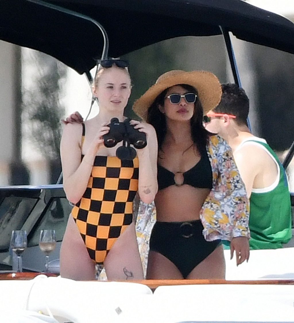 A estrela de “Game of Thrones” Sophie Turner usa um maiô xadrez enquanto curte com The Jonas Brothers e Priyanka Chopra em Miami, 25/03/2019.