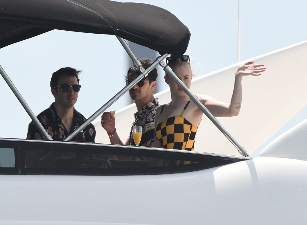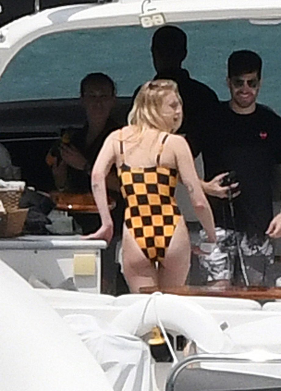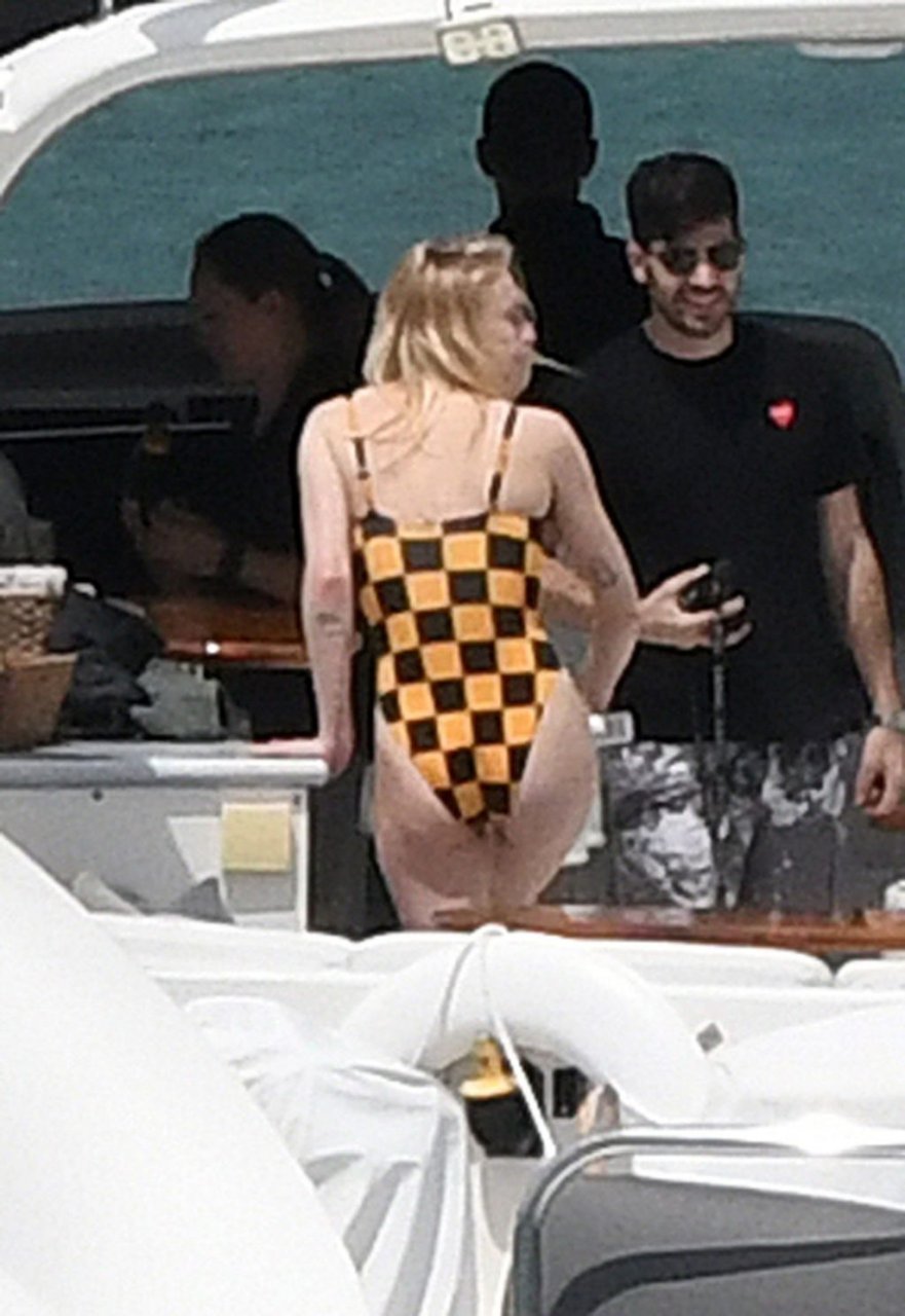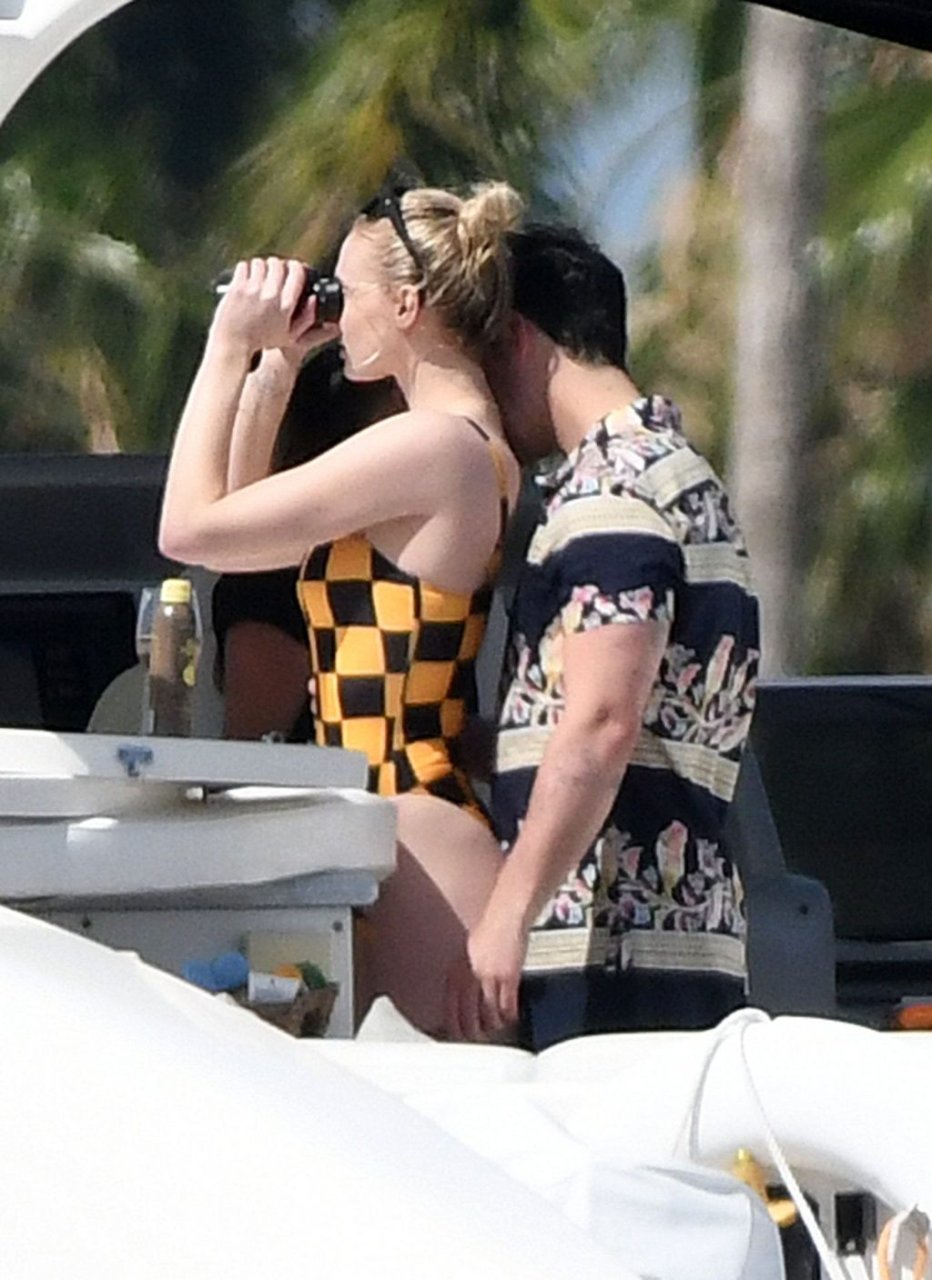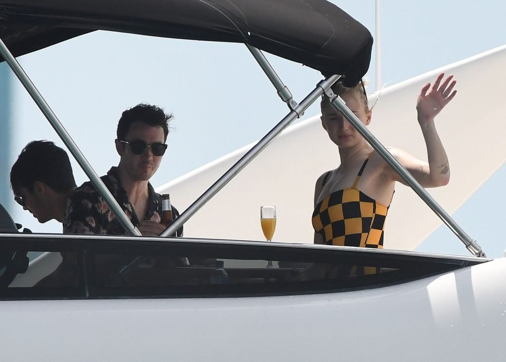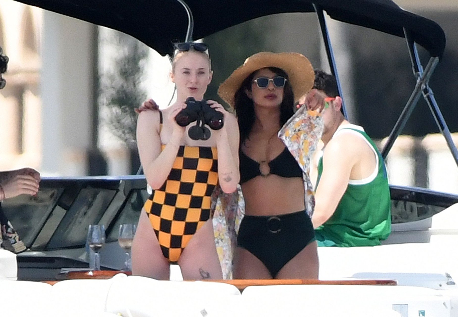A estrela de “Game of Thrones” Sophie Turner usa um maiô xadrez enquanto curte com The Jonas Brothers e Priyanka Chopra em Miami, 25/03/2019.