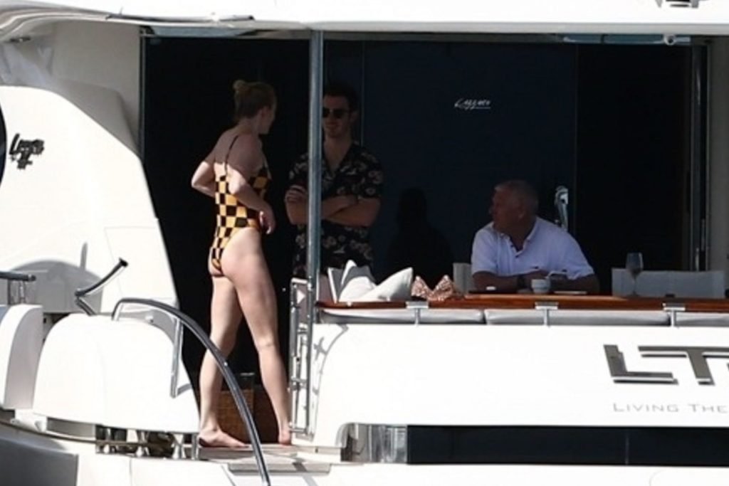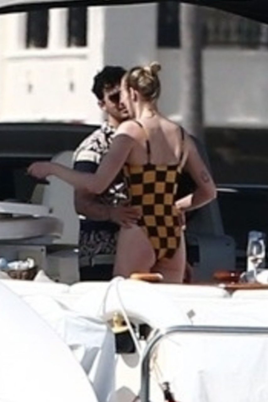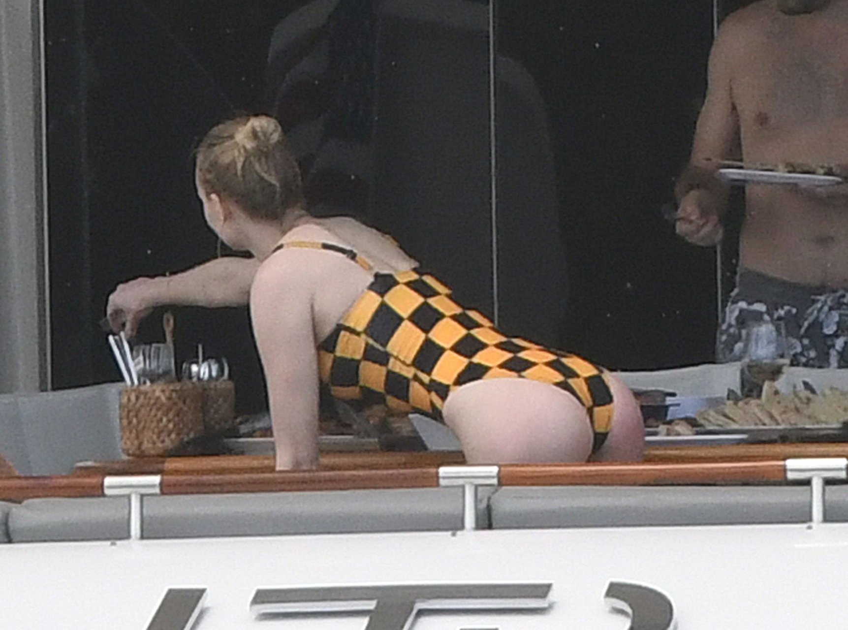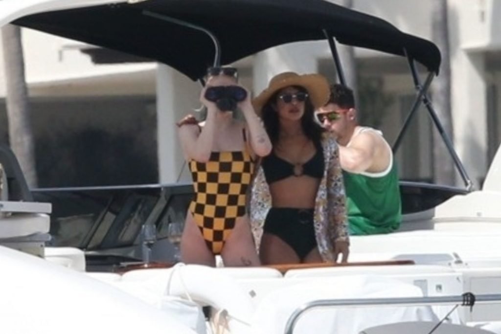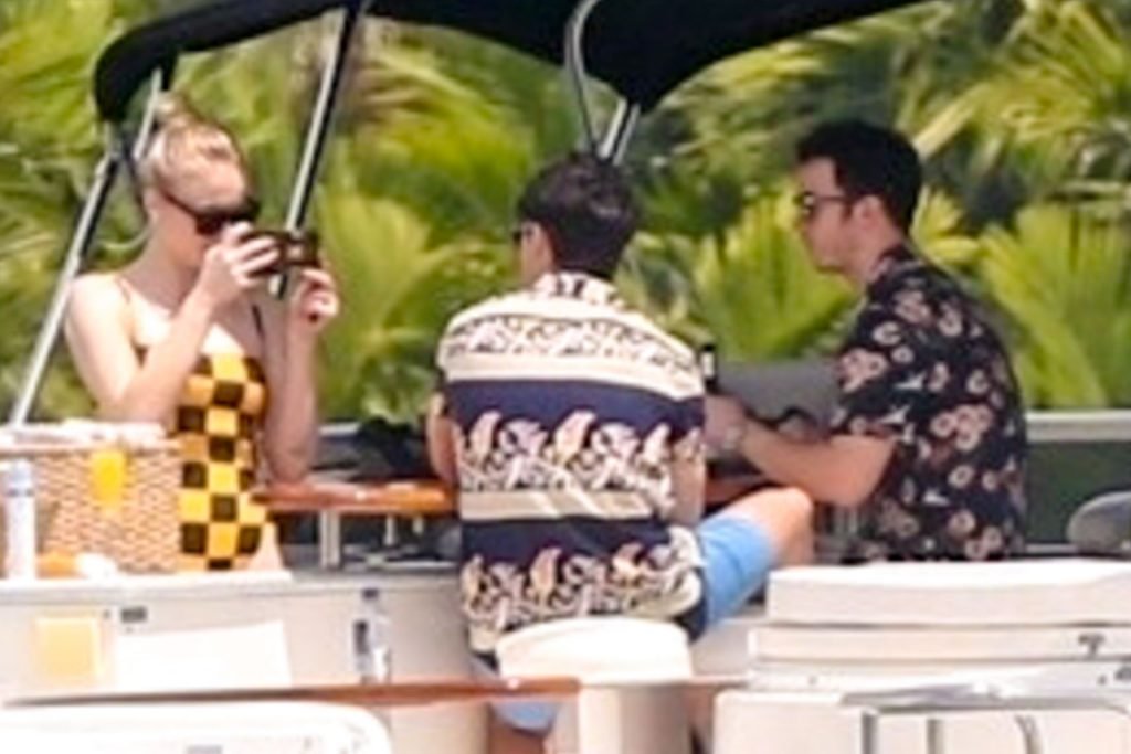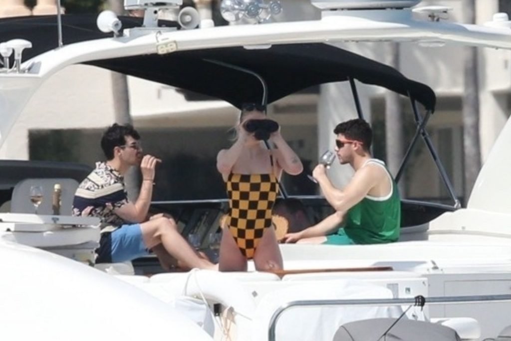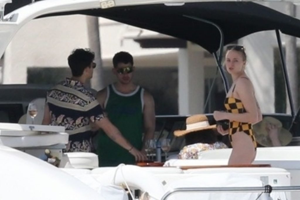 A estrela de “Game of Thrones” Sophie Turner usa um maiô xadrez enquanto curte com The Jonas Brothers e Priyanka Chopra em Miami, 25/03/2019.