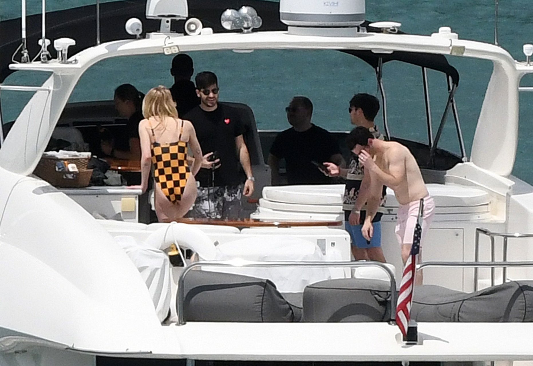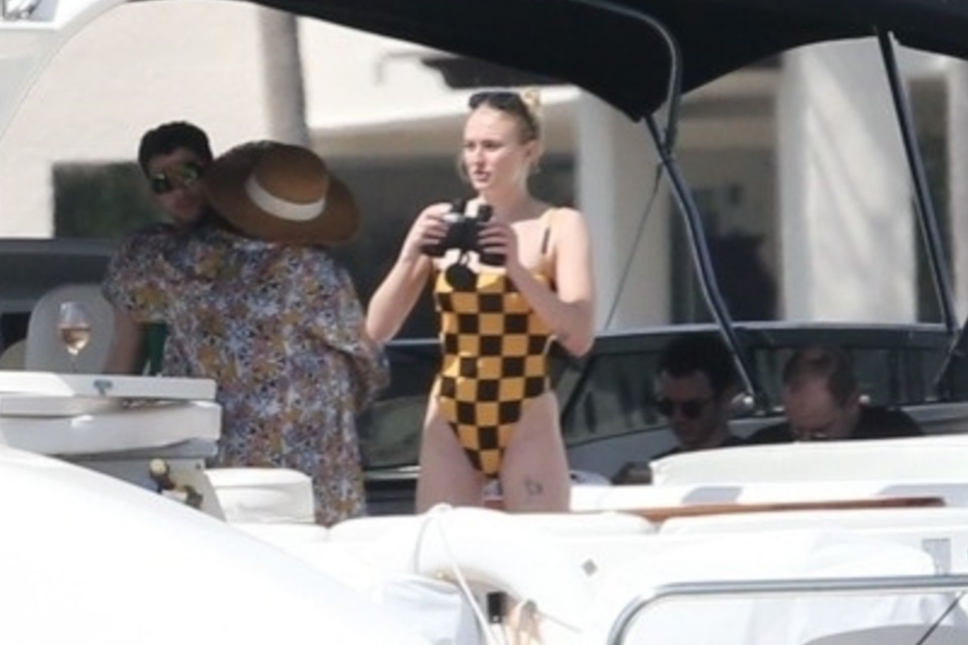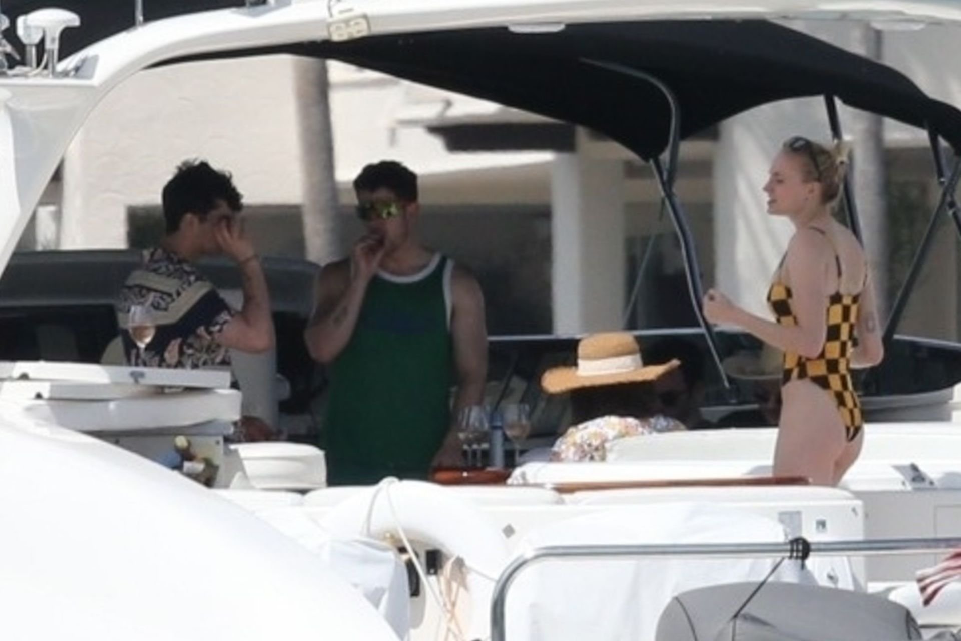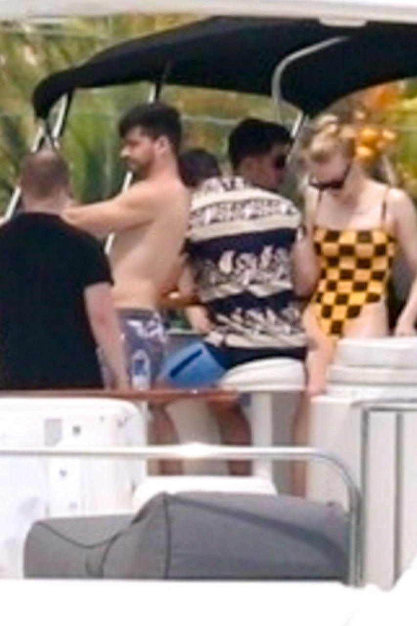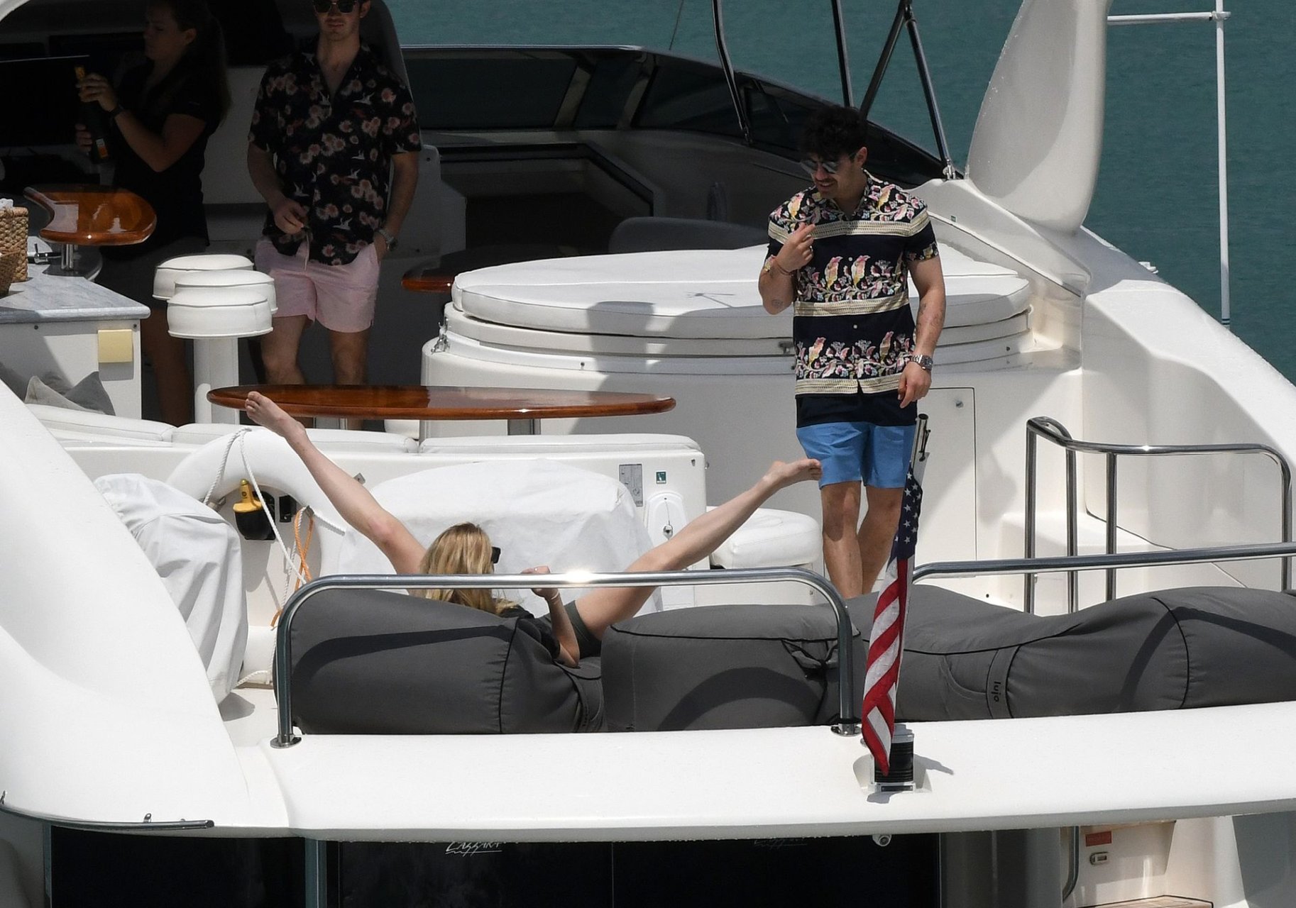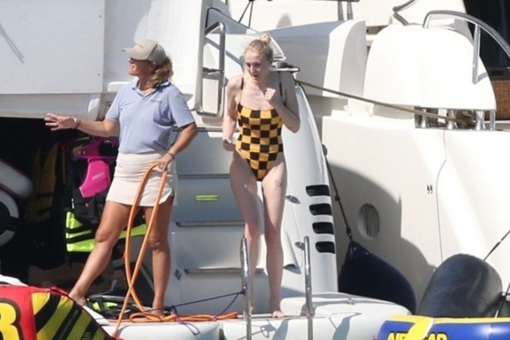 A estrela de “Game of Thrones” Sophie Turner usa um maiô xadrez enquanto curte com The Jonas Brothers e Priyanka Chopra em Miami, 25/03/2019.
