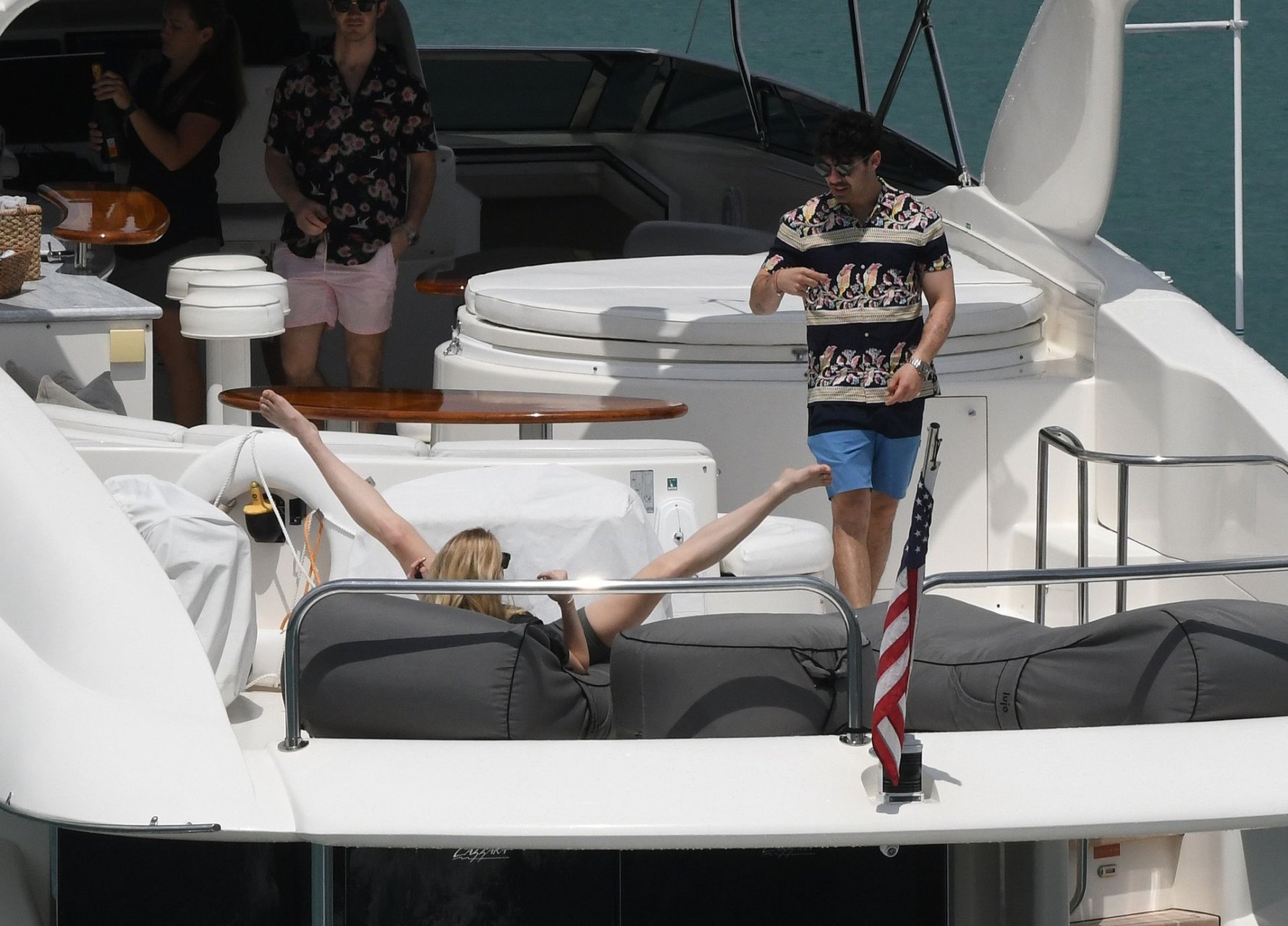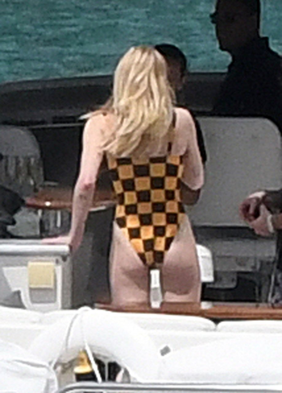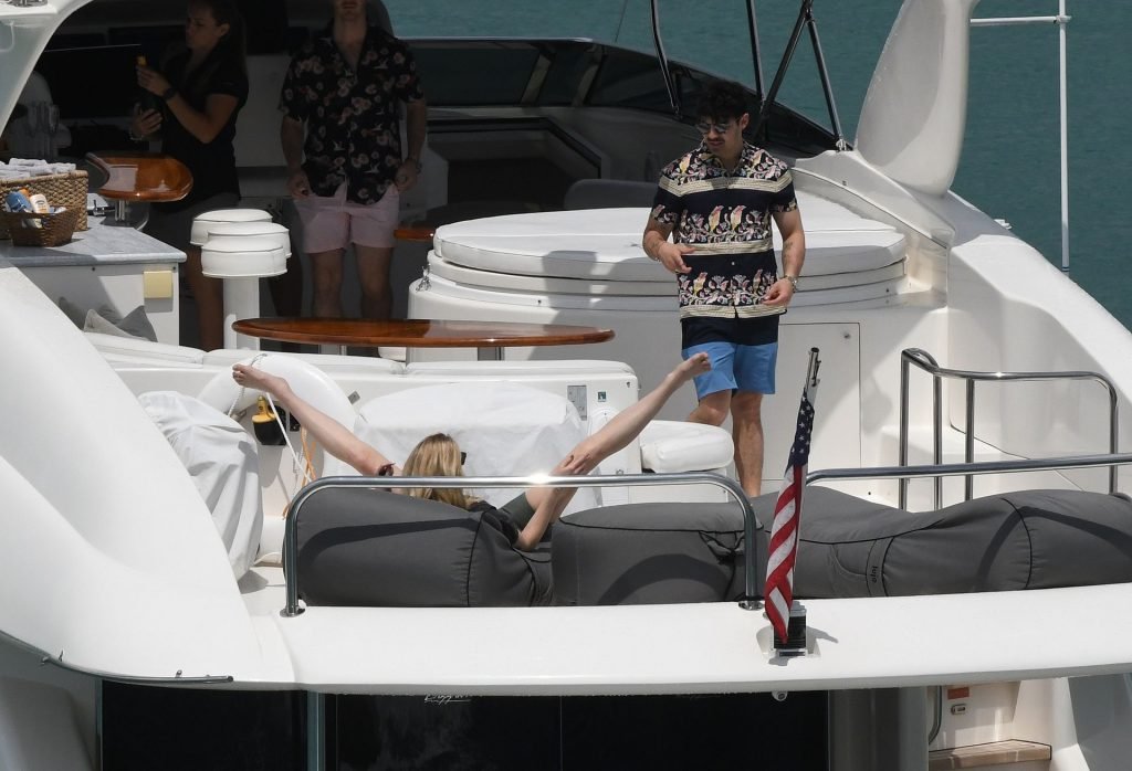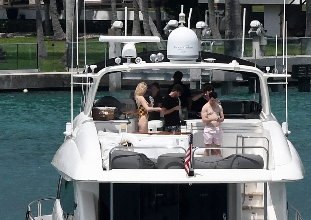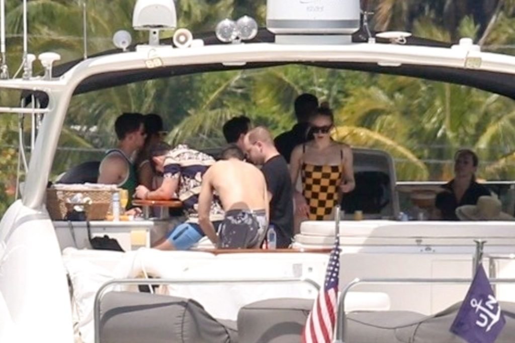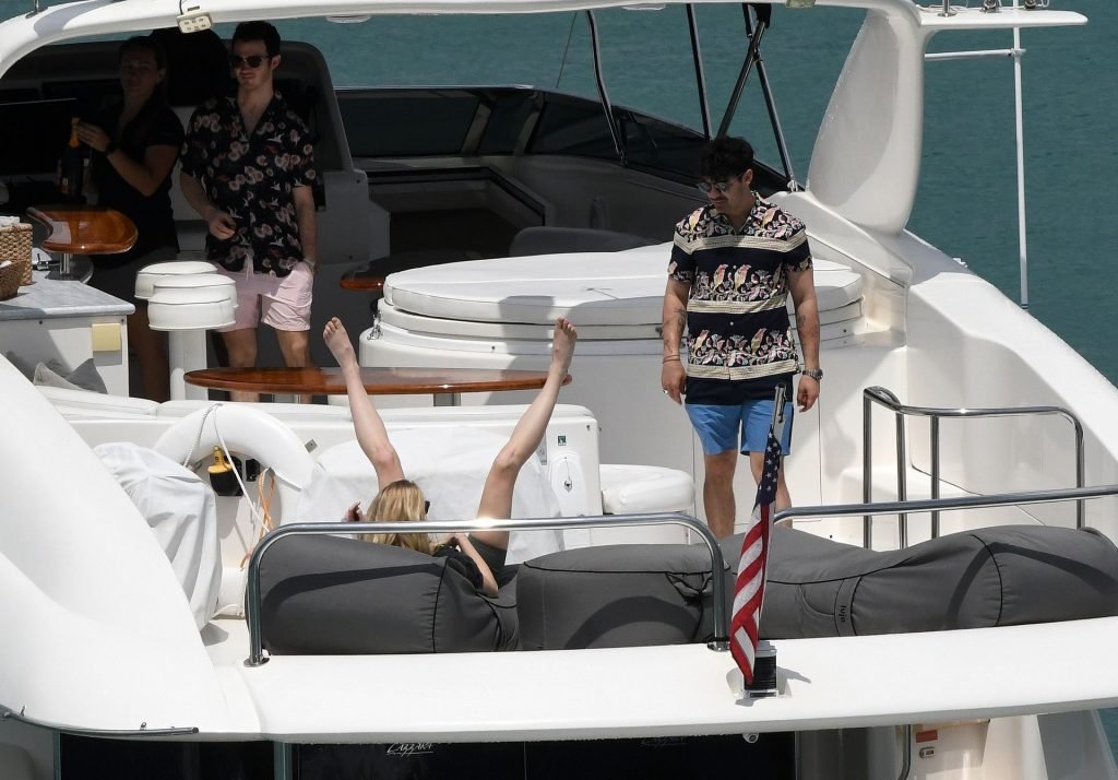 A estrela de “Game of Thrones” Sophie Turner usa um maiô xadrez enquanto curte com The Jonas Brothers e Priyanka Chopra em Miami, 25/03/2019.