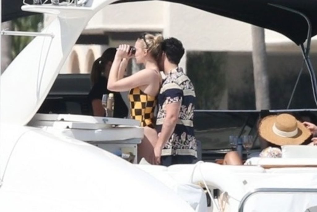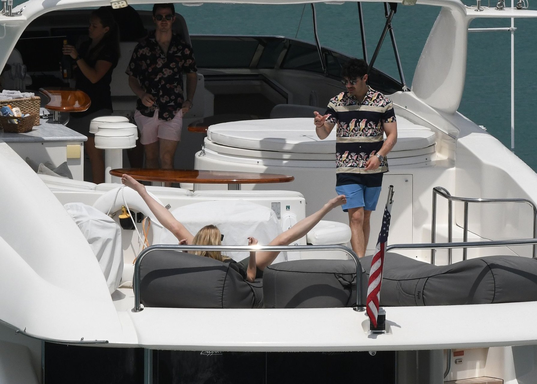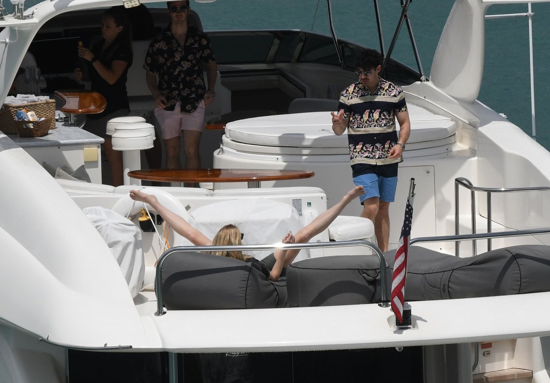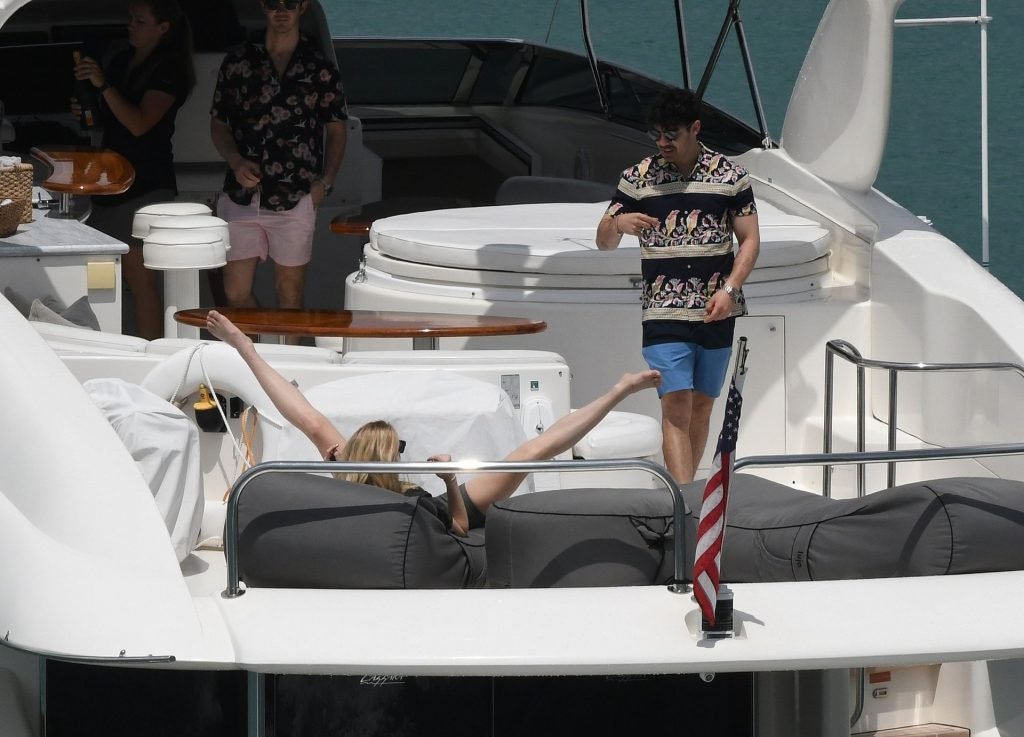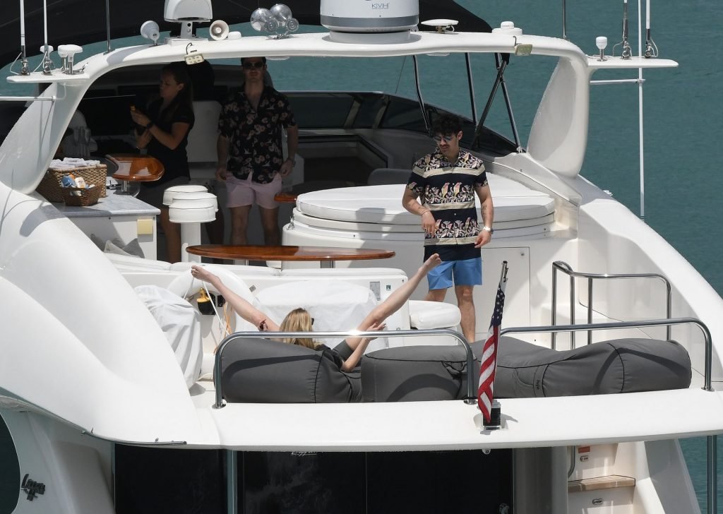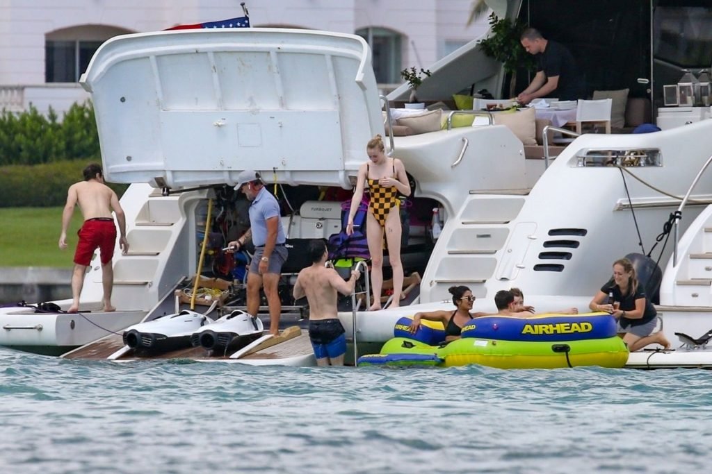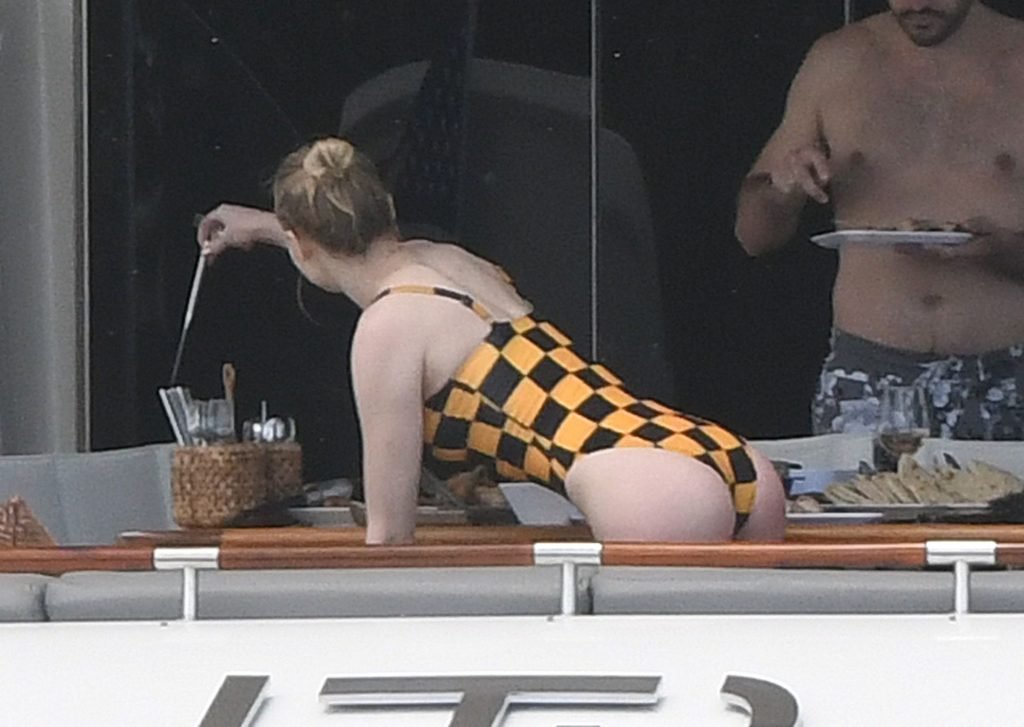 A estrela de “Game of Thrones” Sophie Turner usa um maiô xadrez enquanto curte com The Jonas Brothers e Priyanka Chopra em Miami, 25/03/2019.