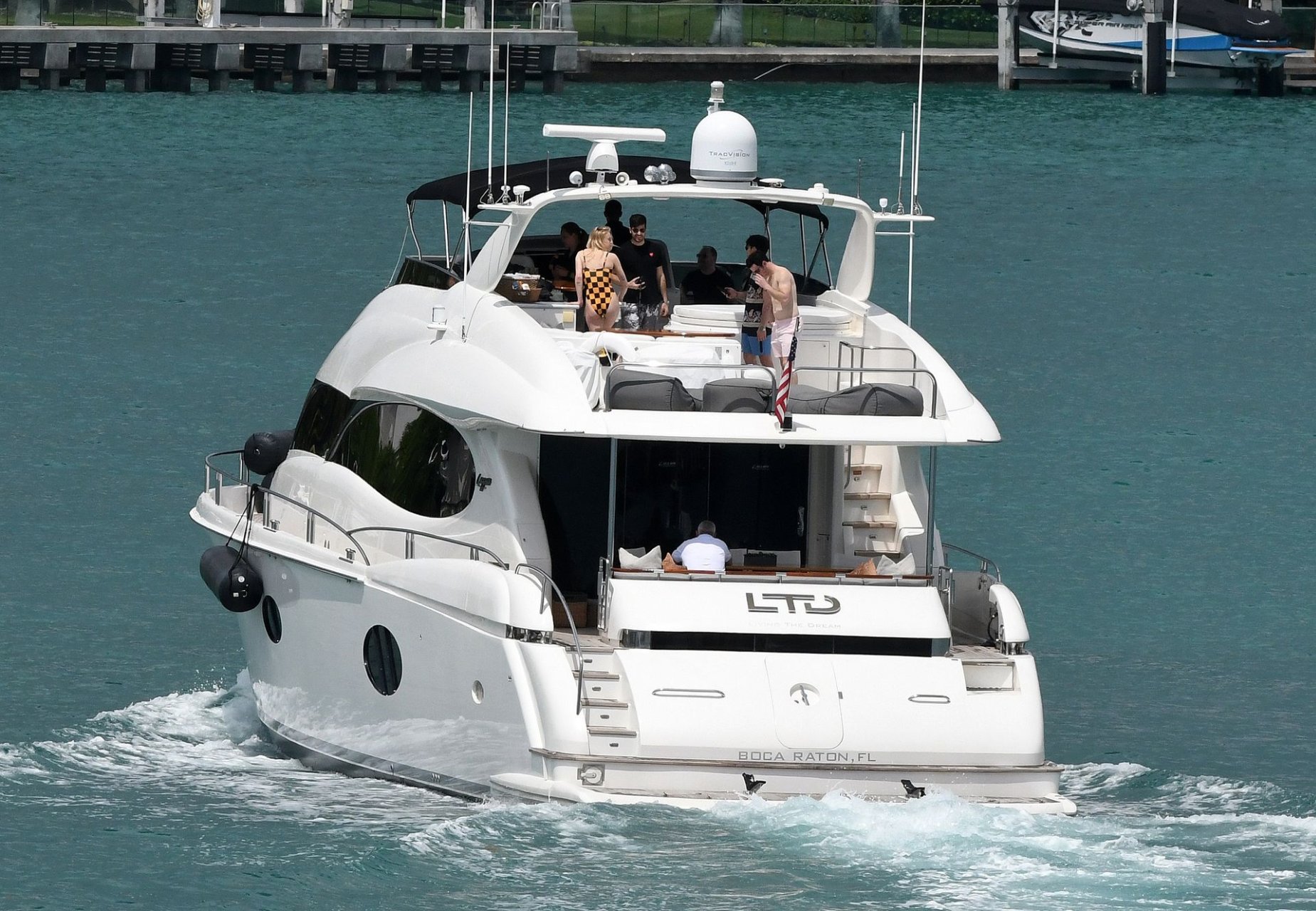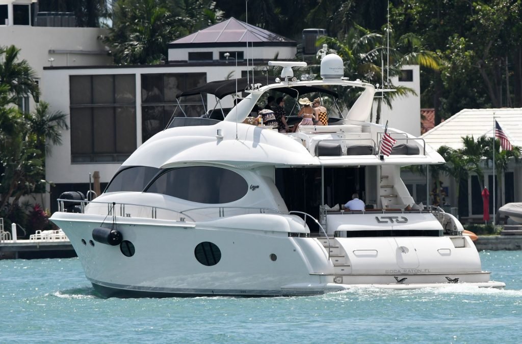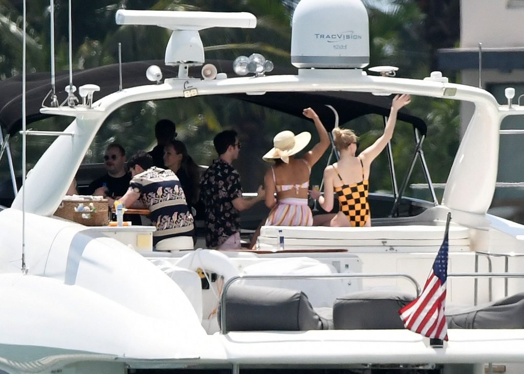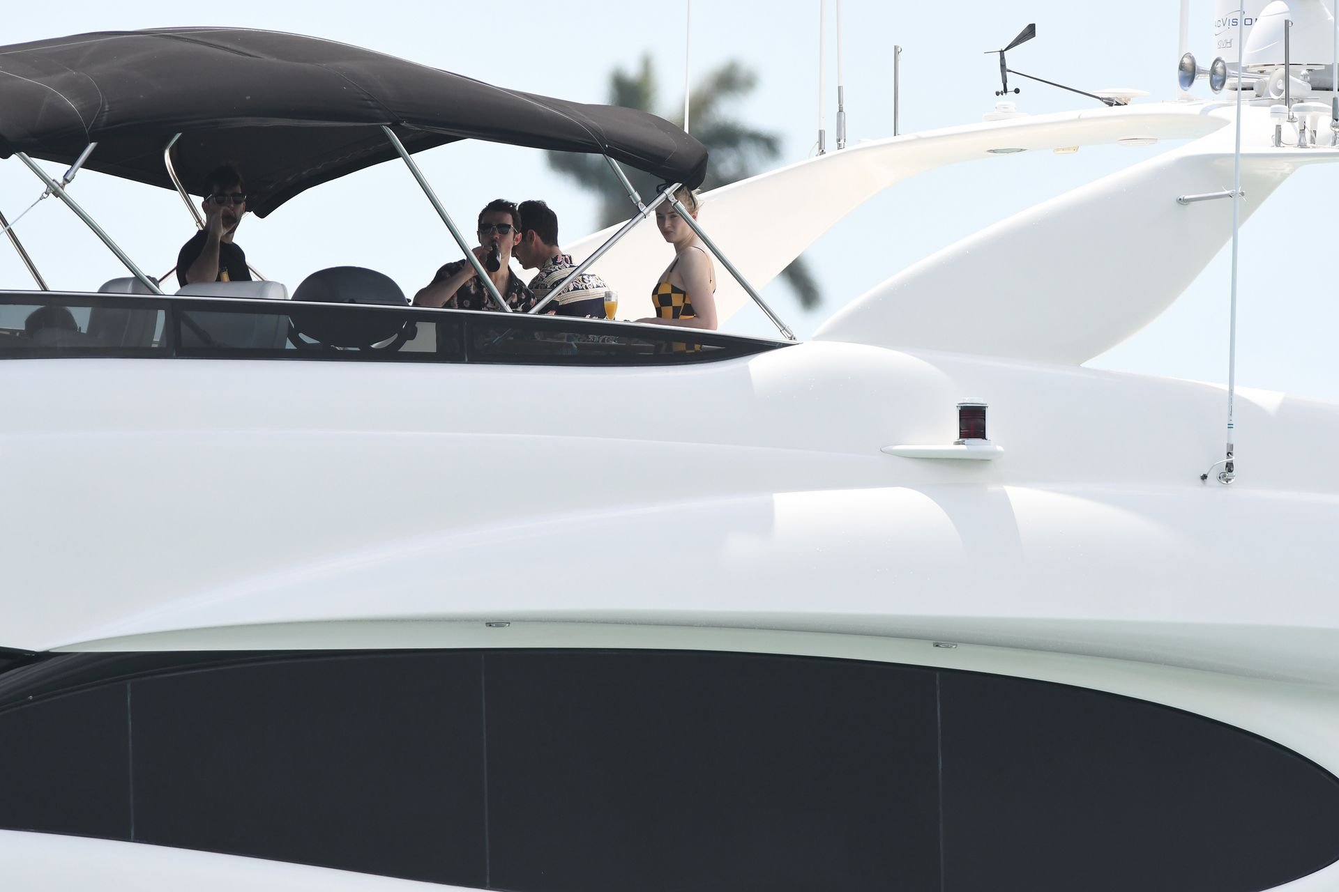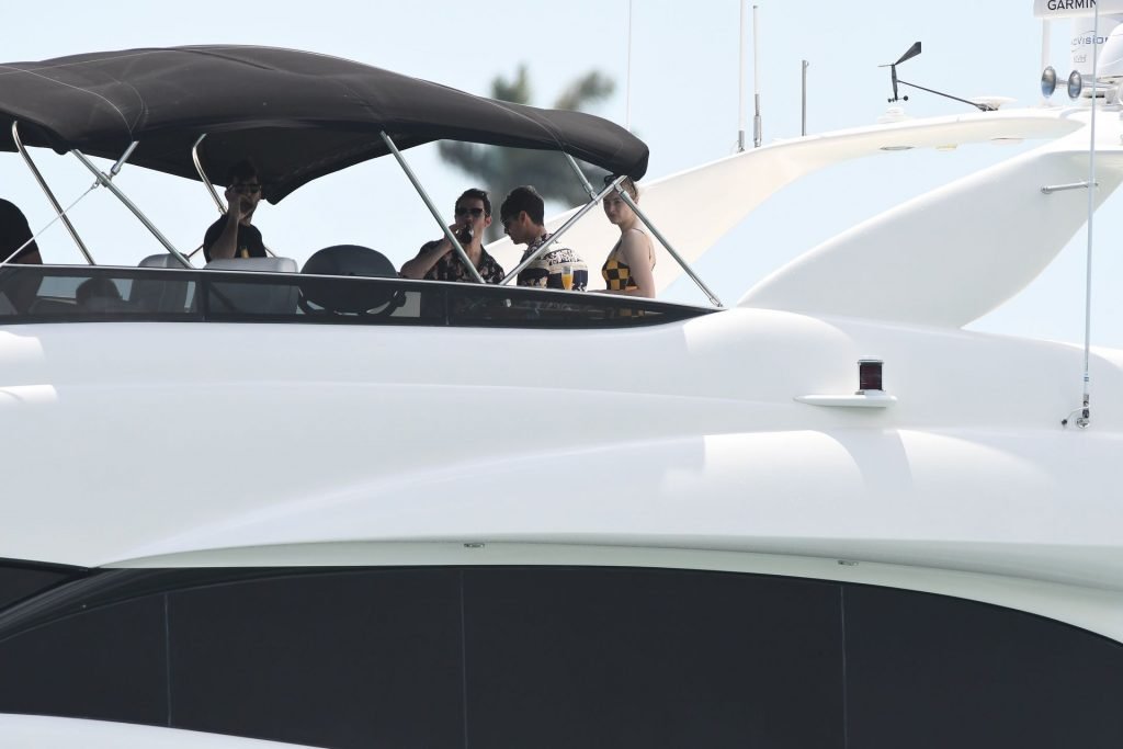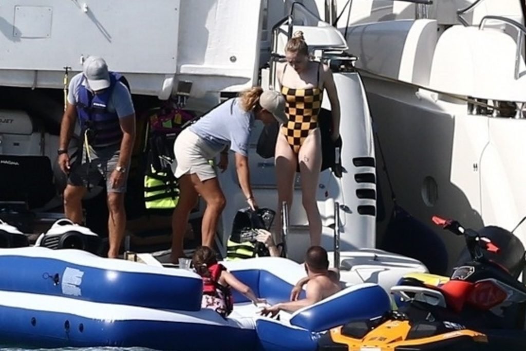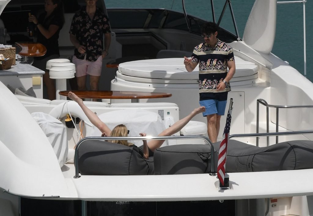 A estrela de “Game of Thrones” Sophie Turner usa um maiô xadrez enquanto curte com The Jonas Brothers e Priyanka Chopra em Miami, 25/03/2019.