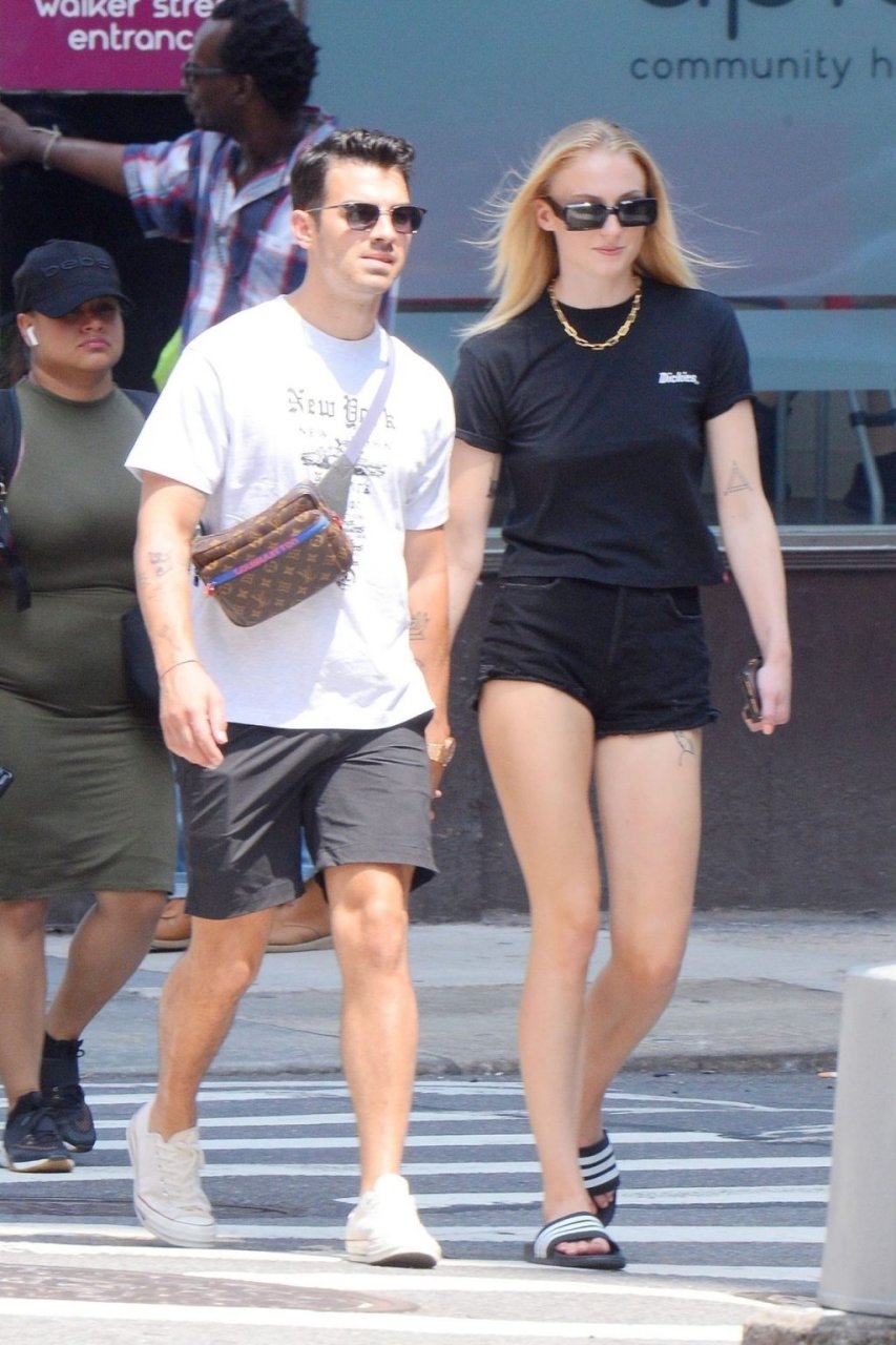 Sophie Turner e Joe Jonas de mãos dadas e parecem inseparáveis enquanto passeiam por NYC enfrentando as temperaturas crescentes com shorts e camisetas descontraídas, 30/07/2019.
