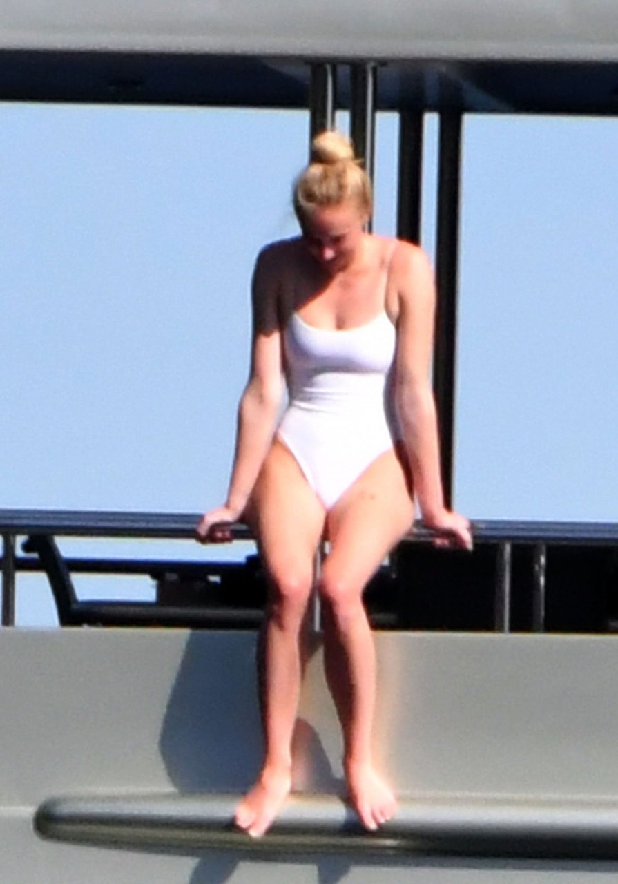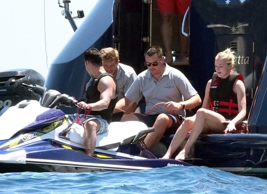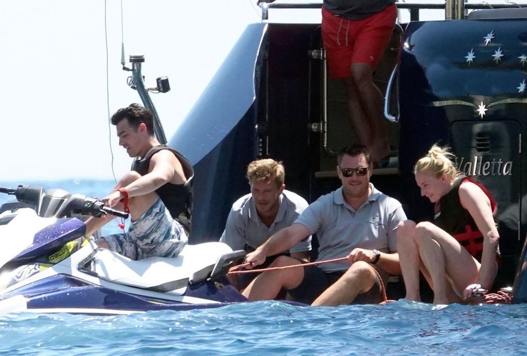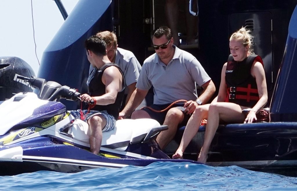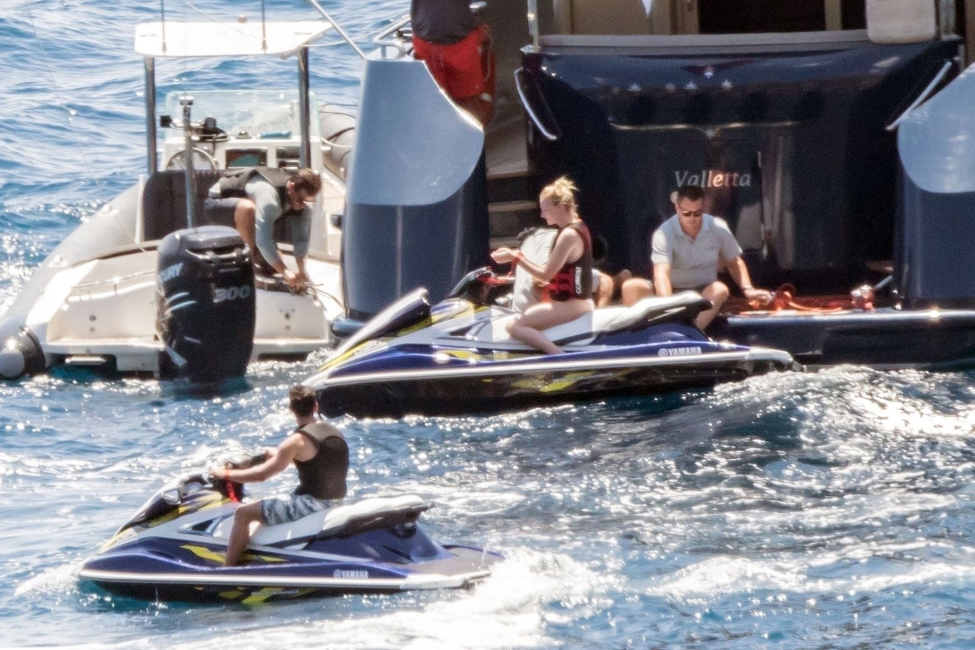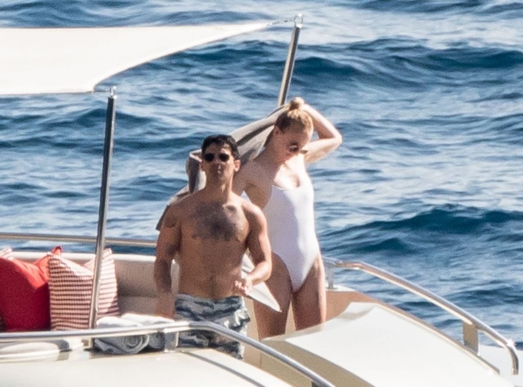 O casal passou o dia em seu iate luxuoso no mar e se divertiu ao mergulhar nas águas italianas, com Joe sem camisa e Sophie usando um maiô branco de noiva.