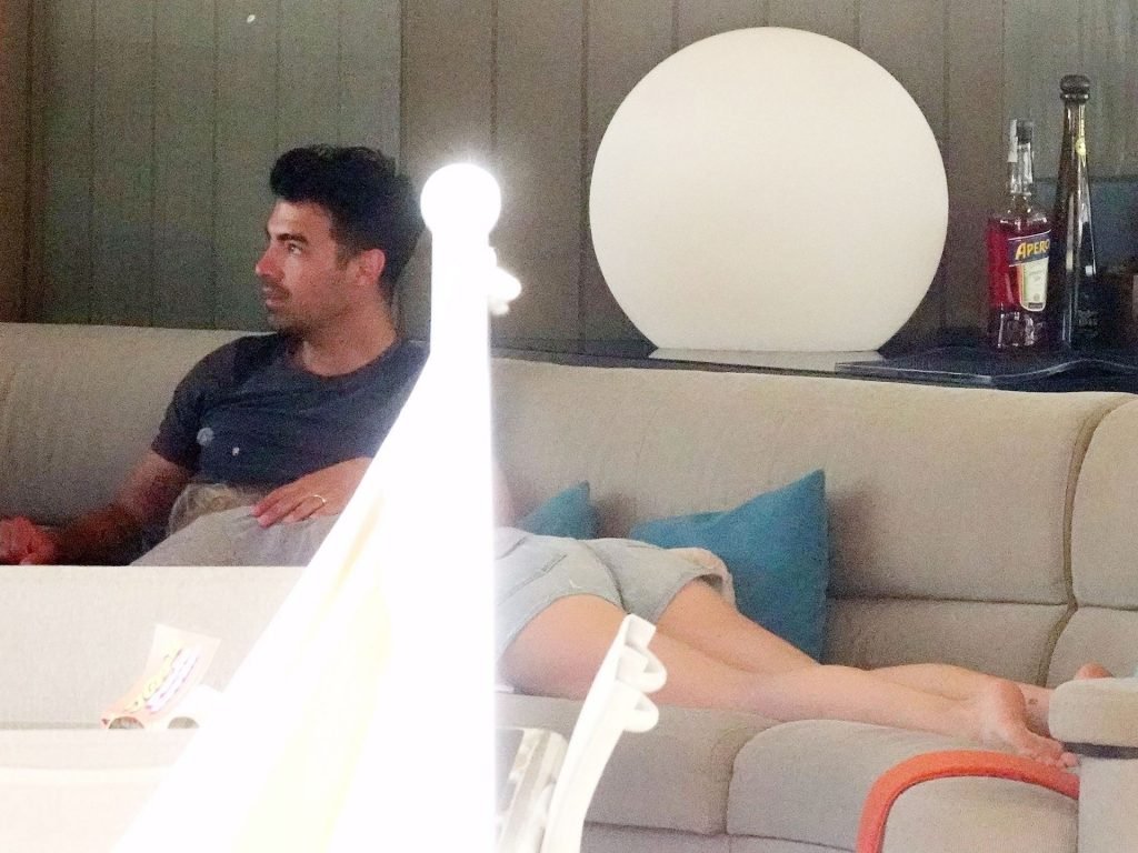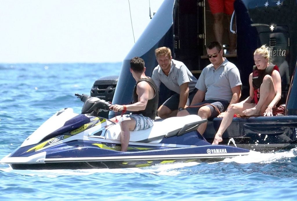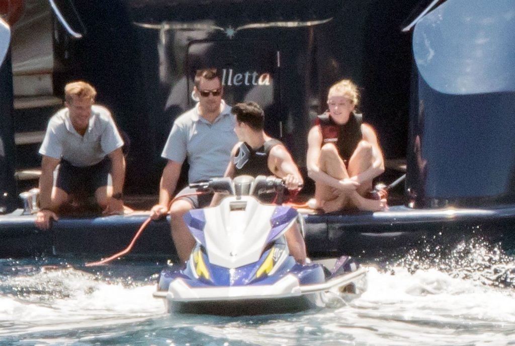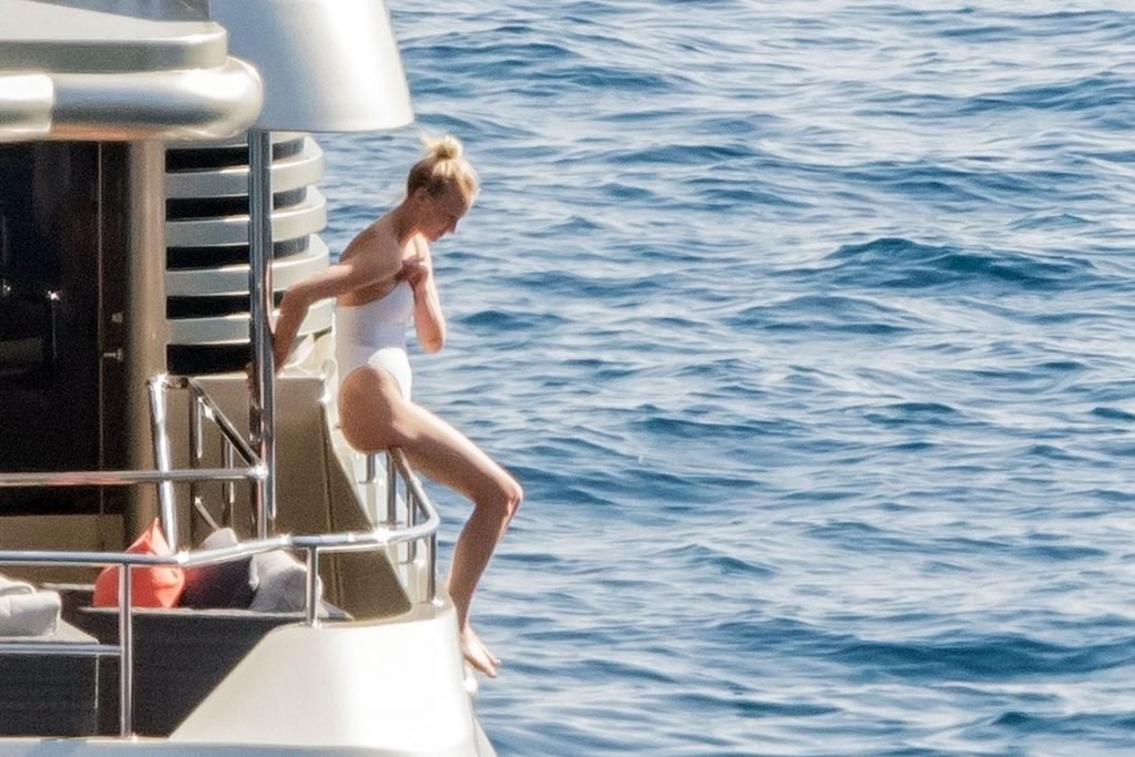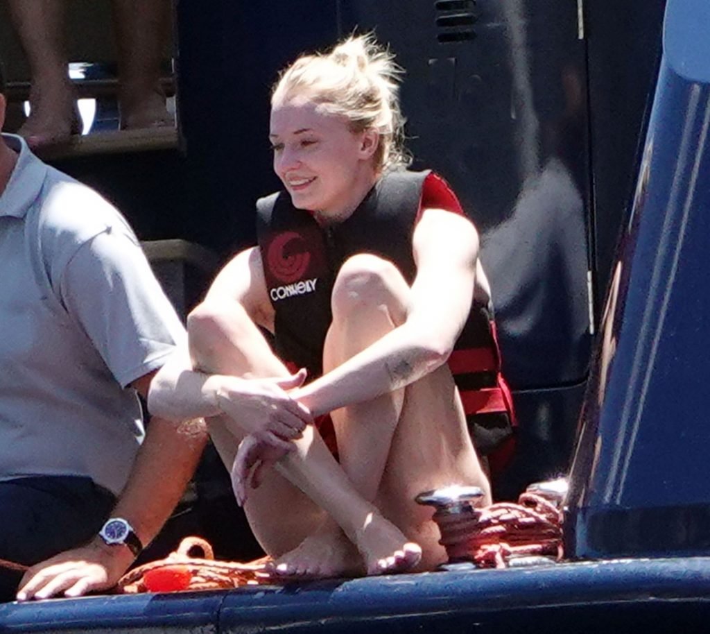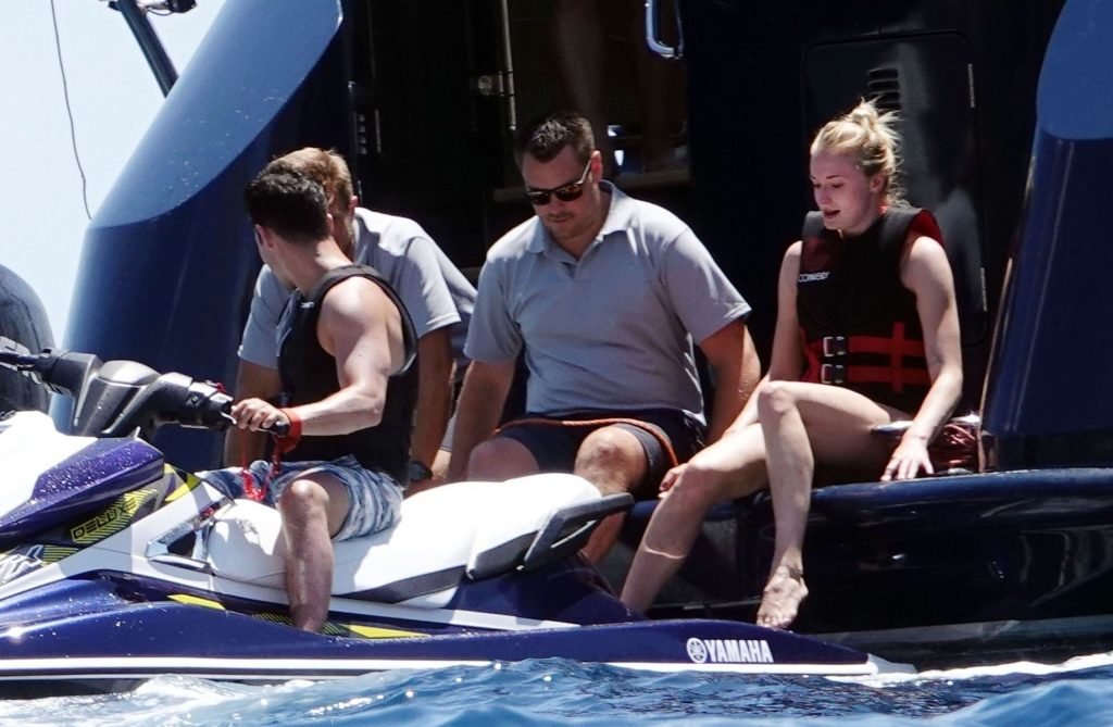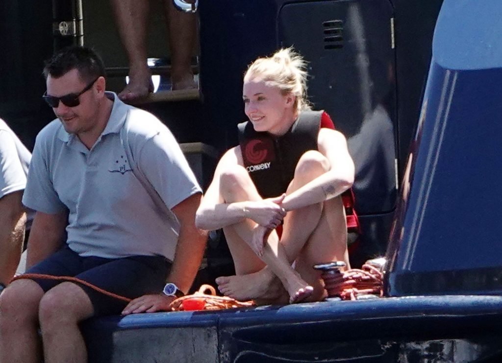 O casal passou o dia em seu iate luxuoso no mar e se divertiu ao mergulhar nas águas italianas, com Joe sem camisa e Sophie usando um maiô branco de noiva.