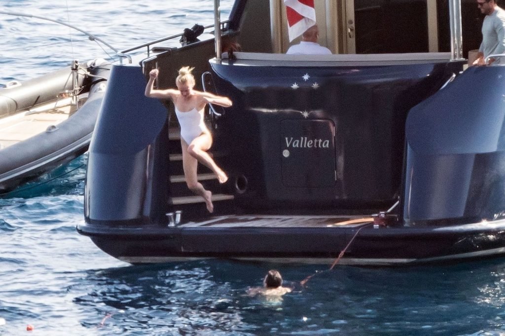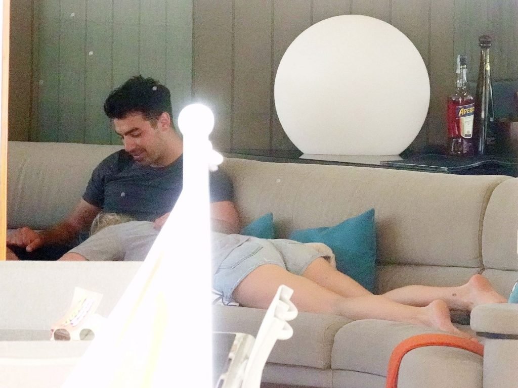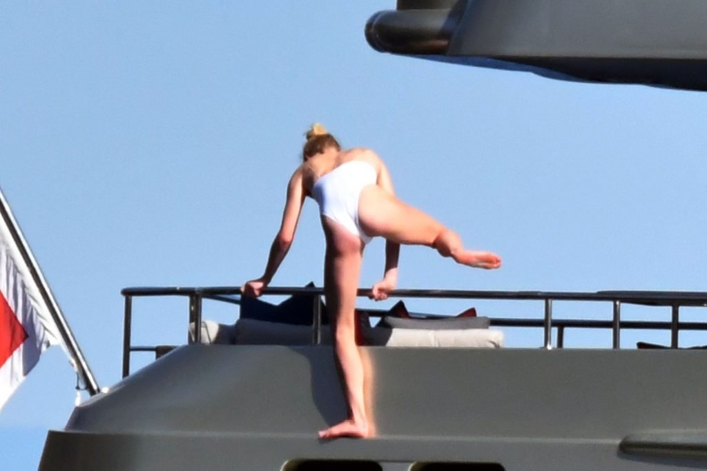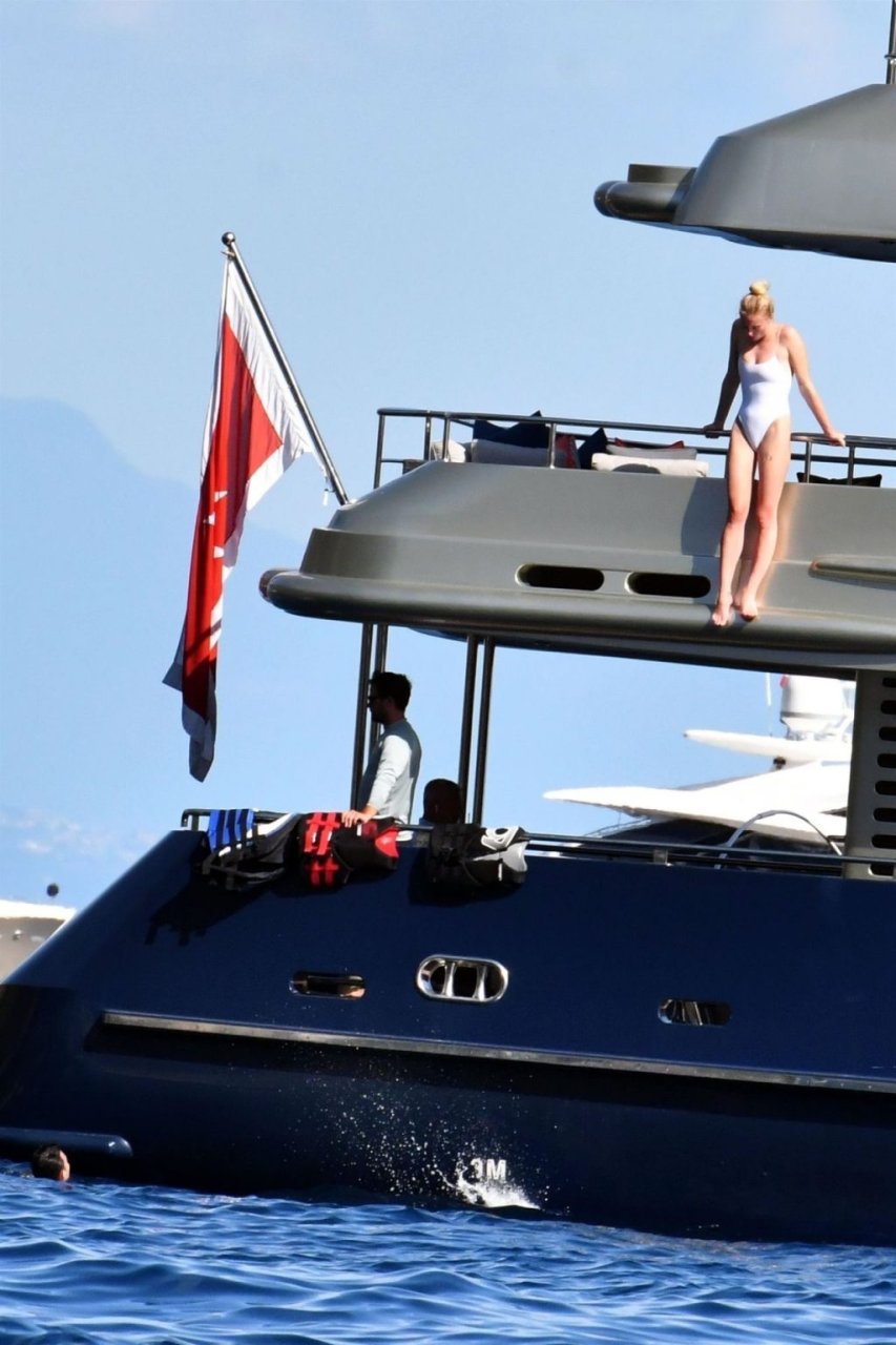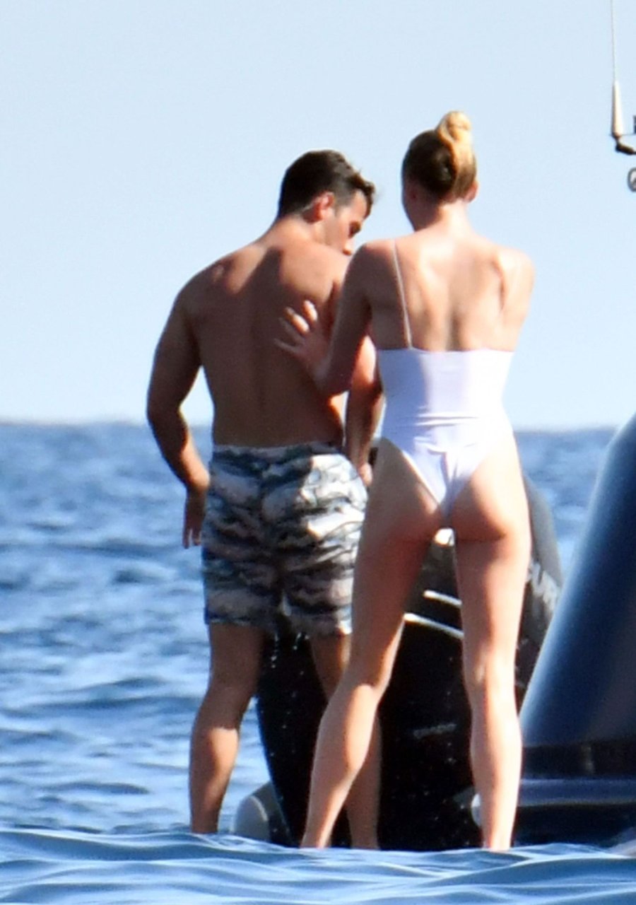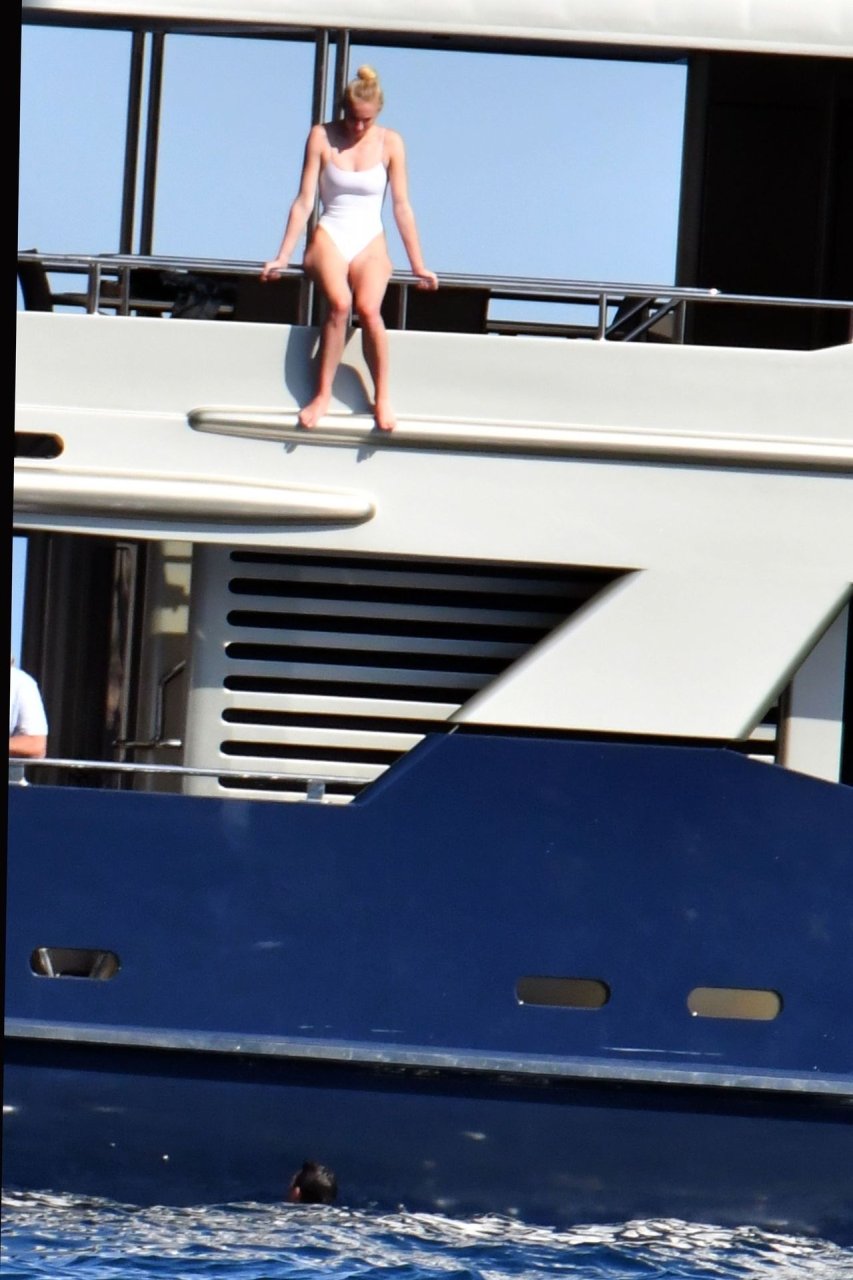 O casal passou o dia em seu iate luxuoso no mar e se divertiu ao mergulhar nas águas italianas, com Joe sem camisa e Sophie usando um maiô branco de noiva.