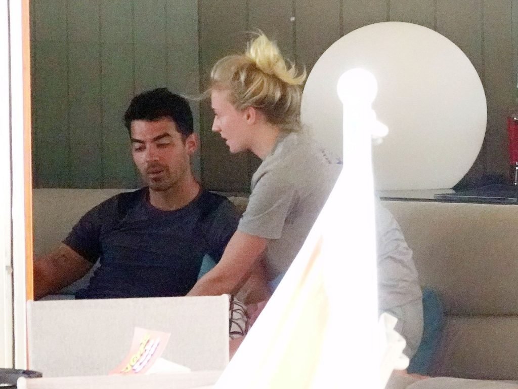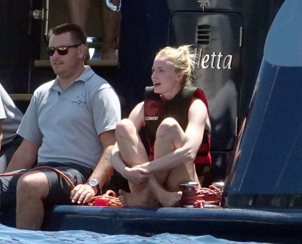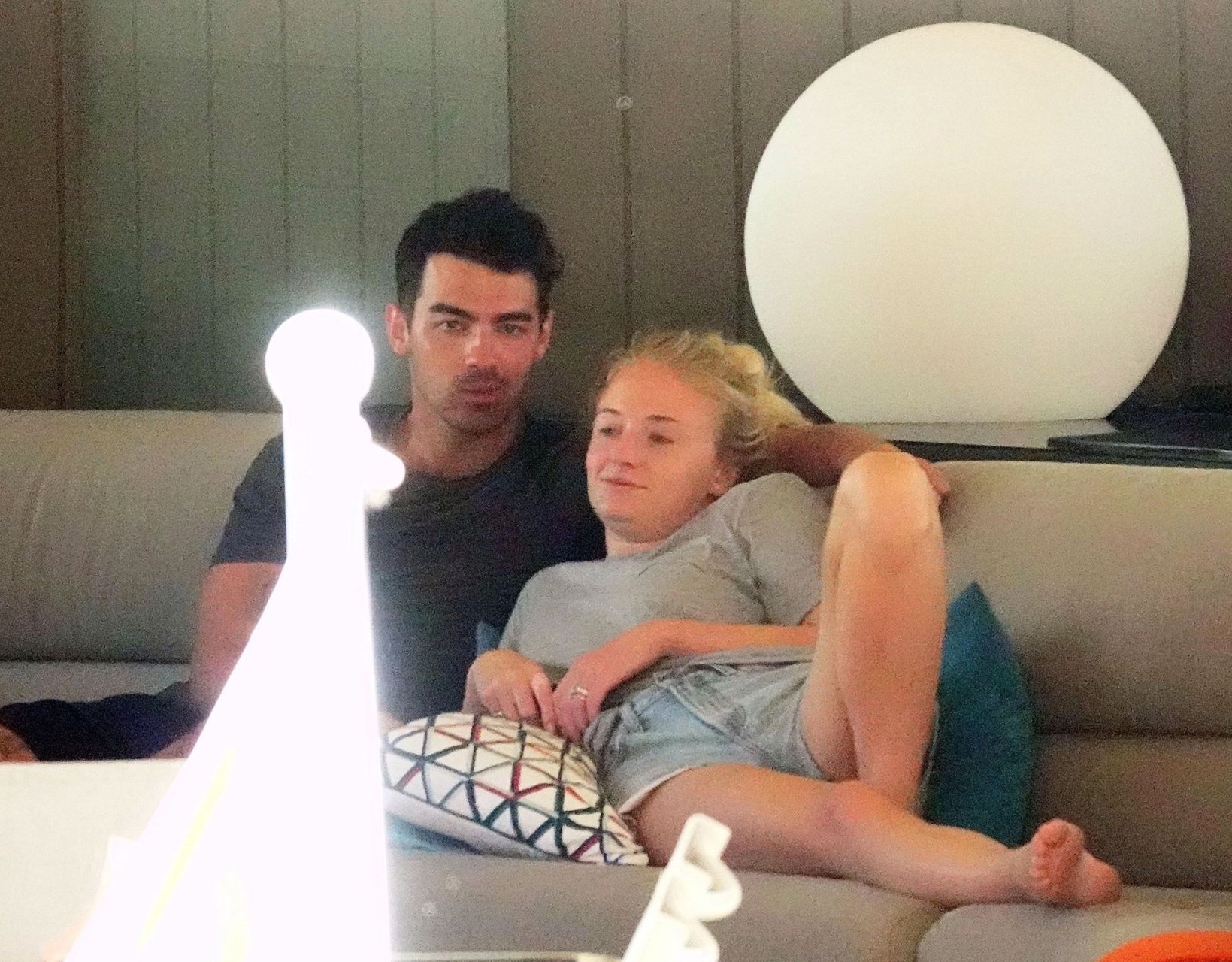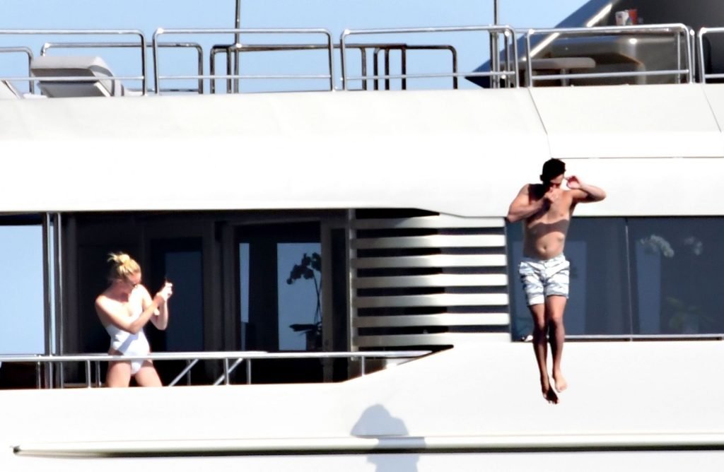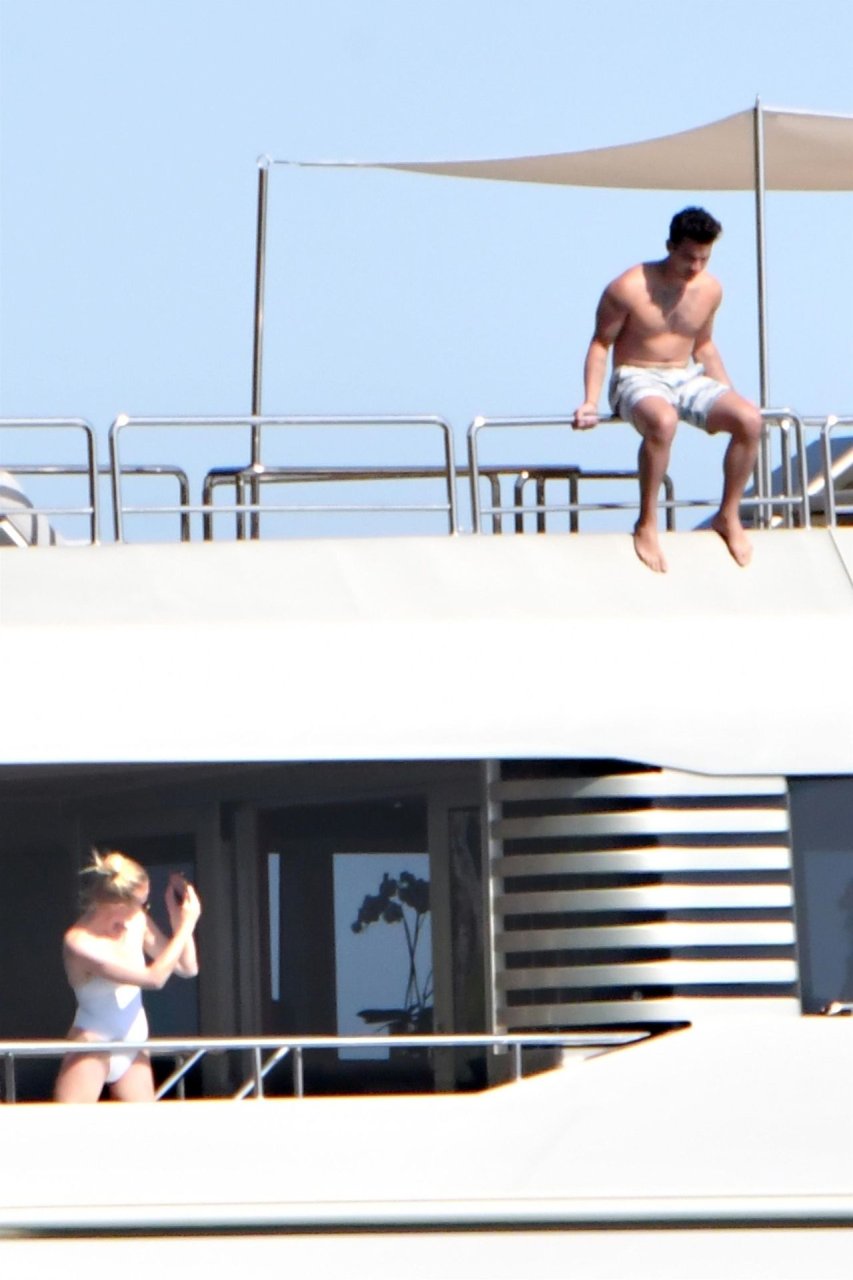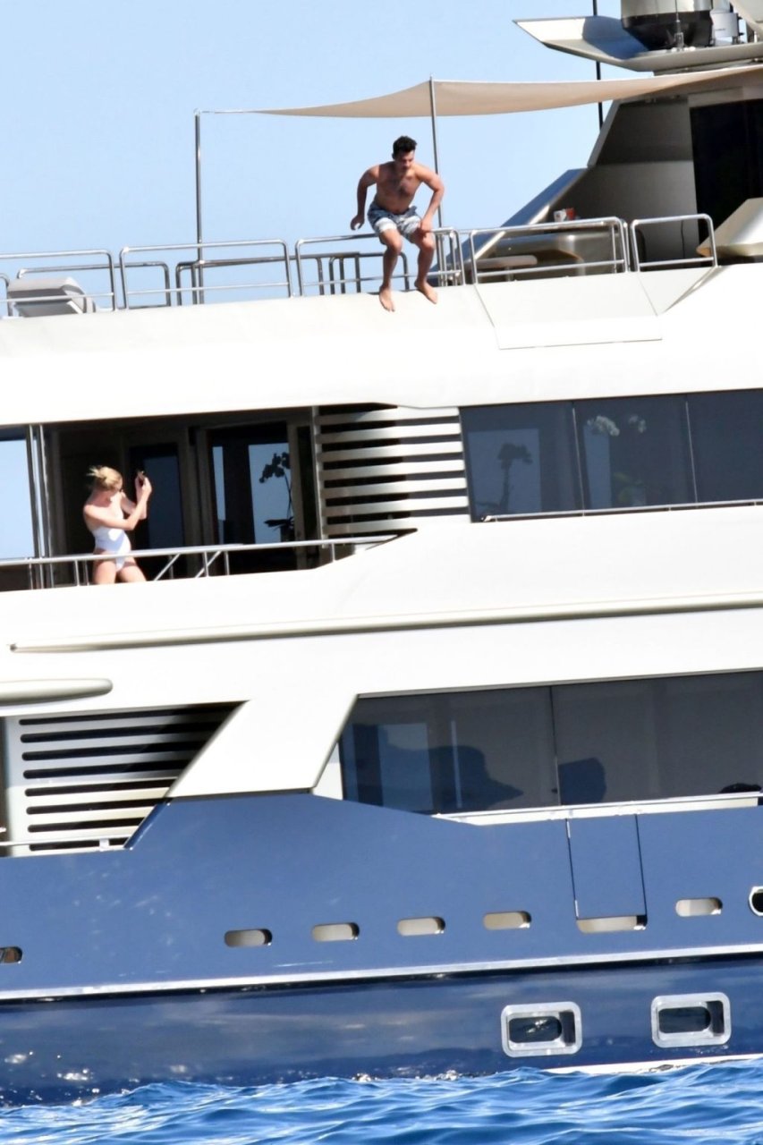 O casal passou o dia em seu iate luxuoso no mar e se divertiu ao mergulhar nas águas italianas, com Joe sem camisa e Sophie usando um maiô branco de noiva.