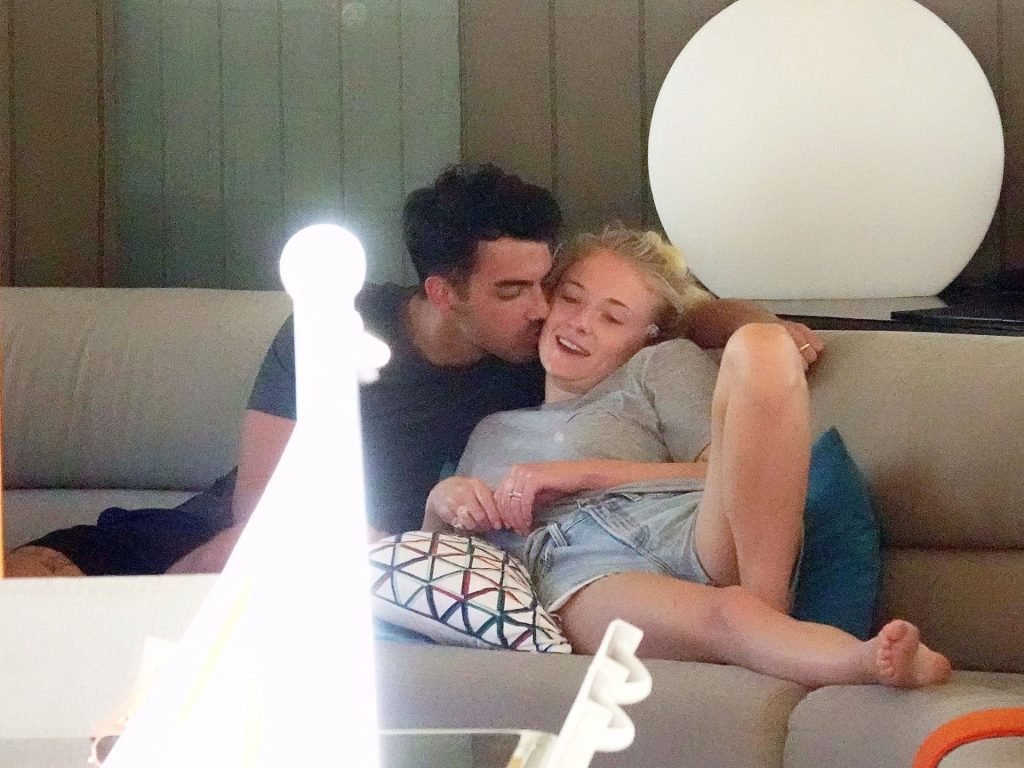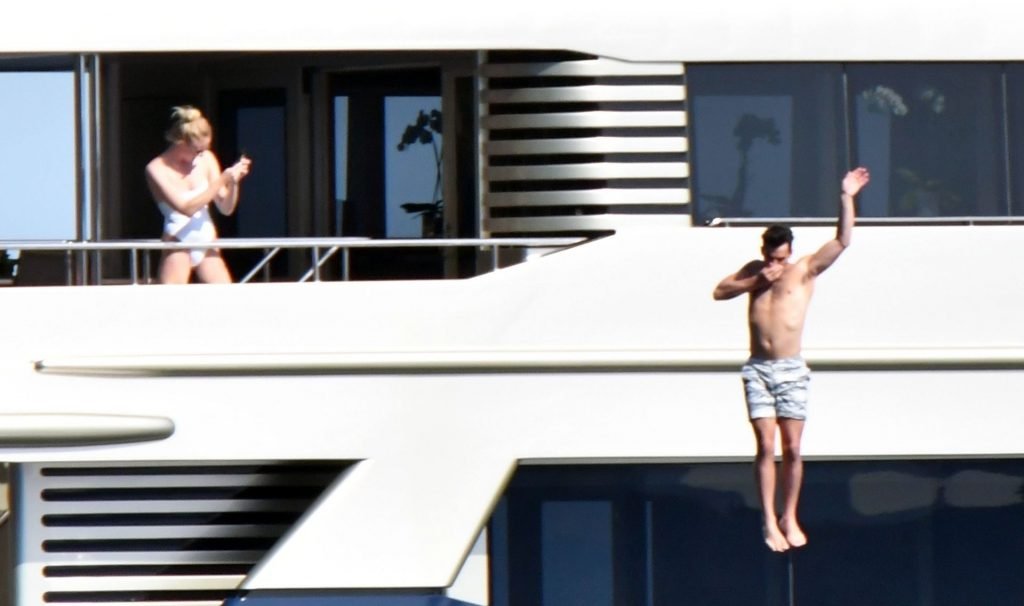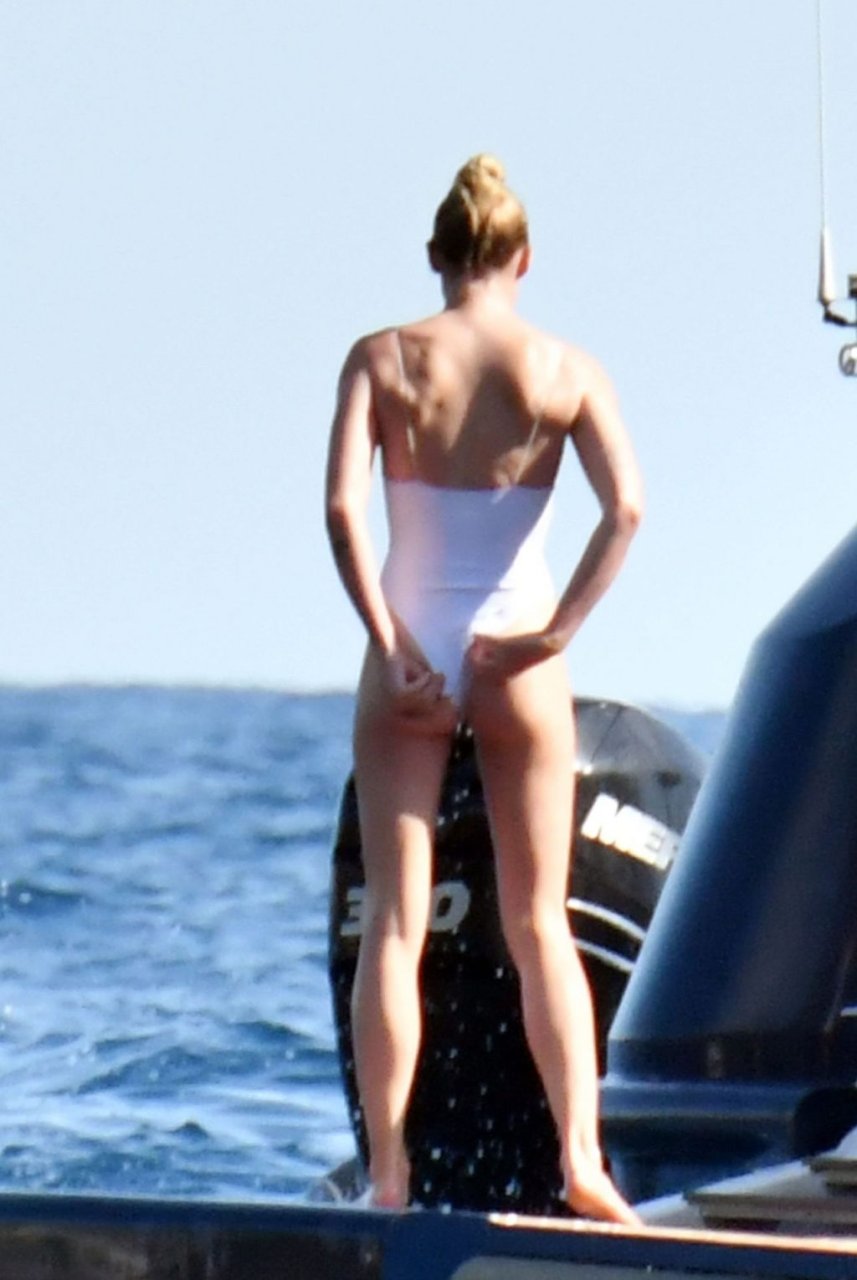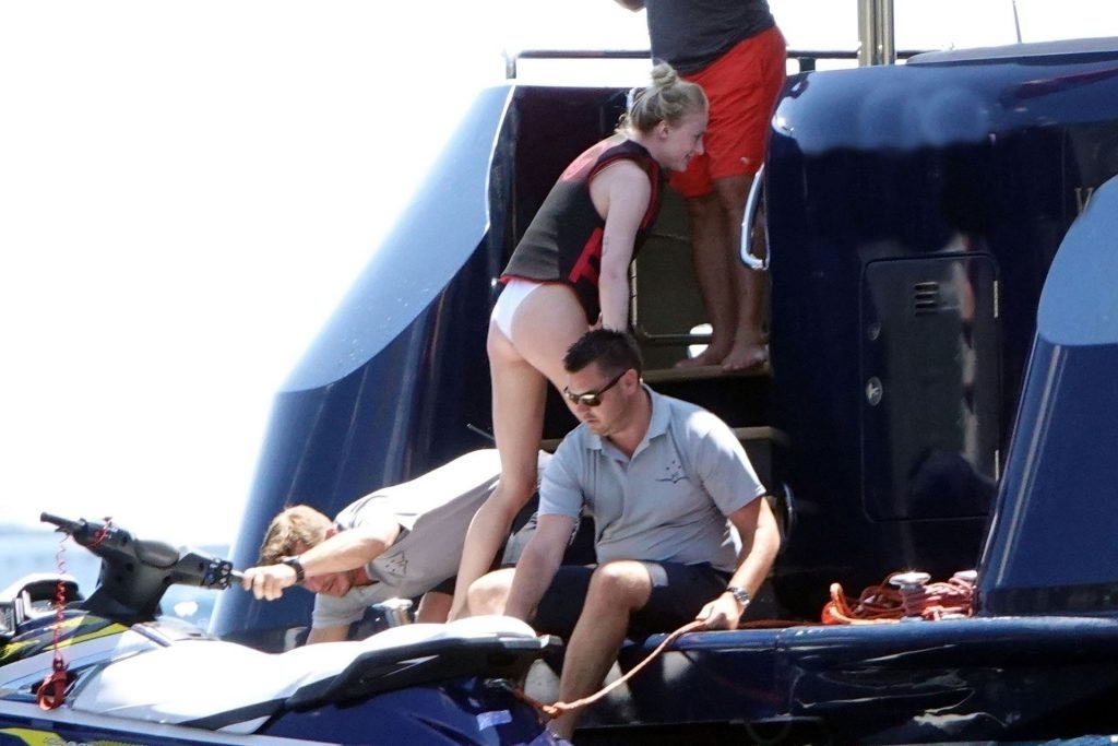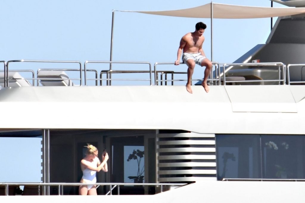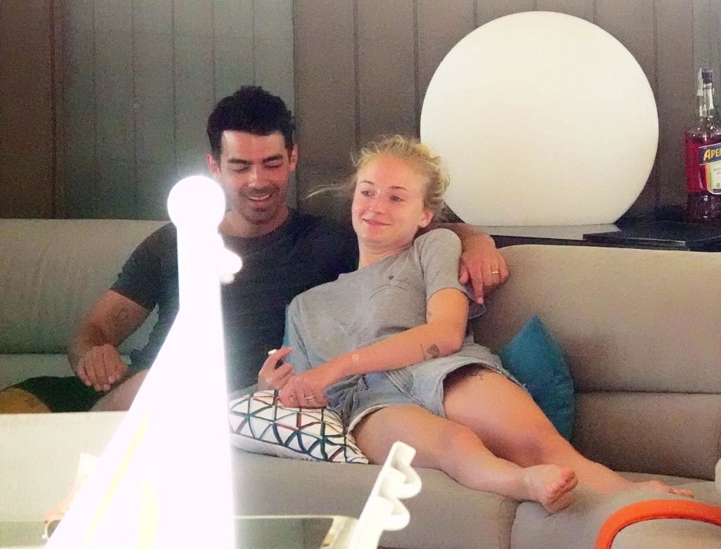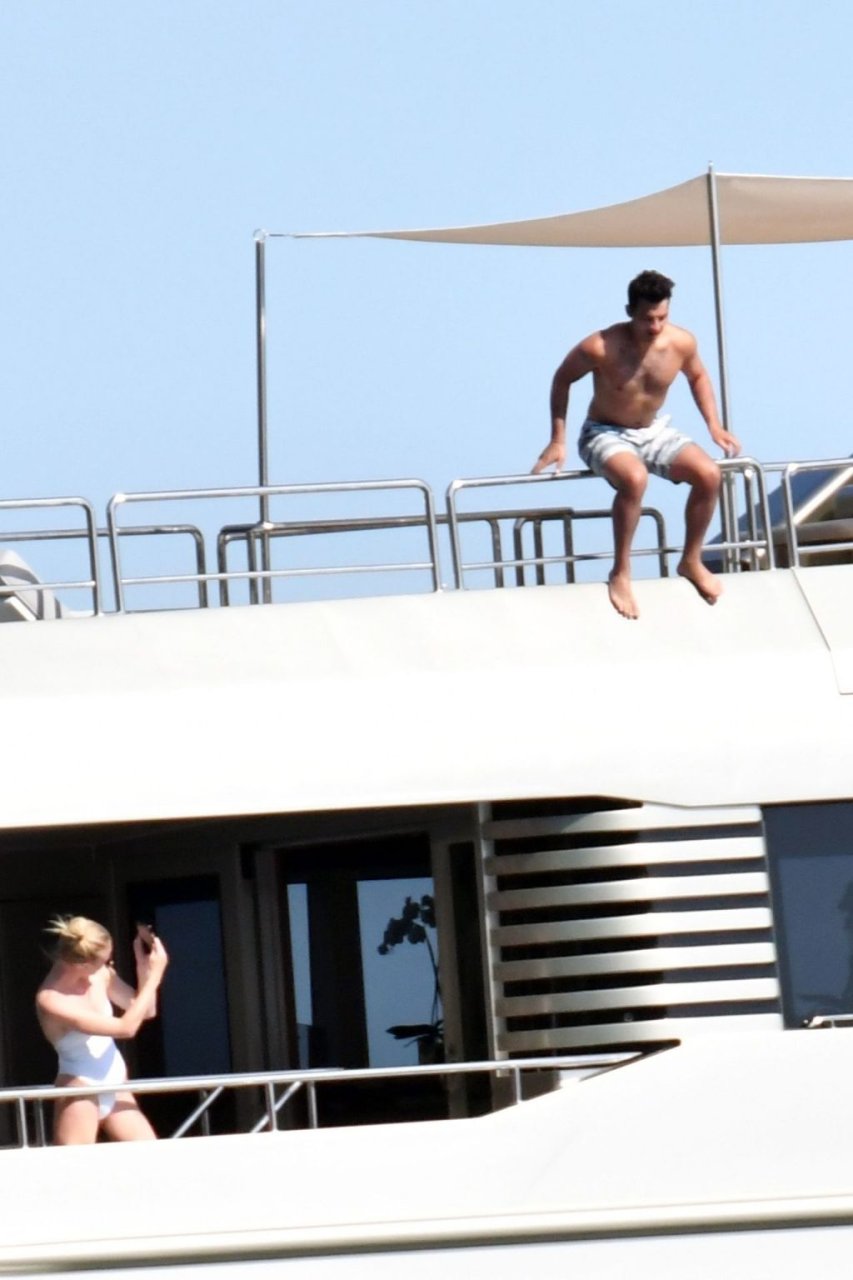 O casal passou o dia em seu iate luxuoso no mar e se divertiu ao mergulhar nas águas italianas, com Joe sem camisa e Sophie usando um maiô branco de noiva.