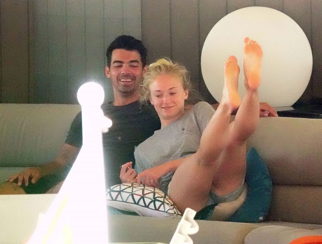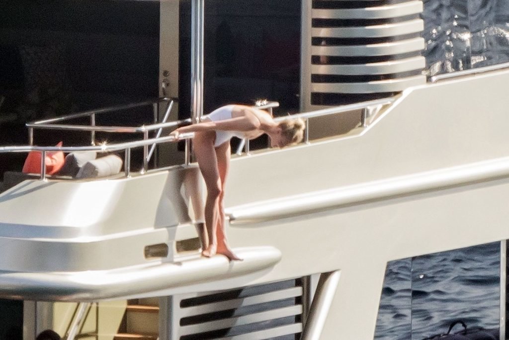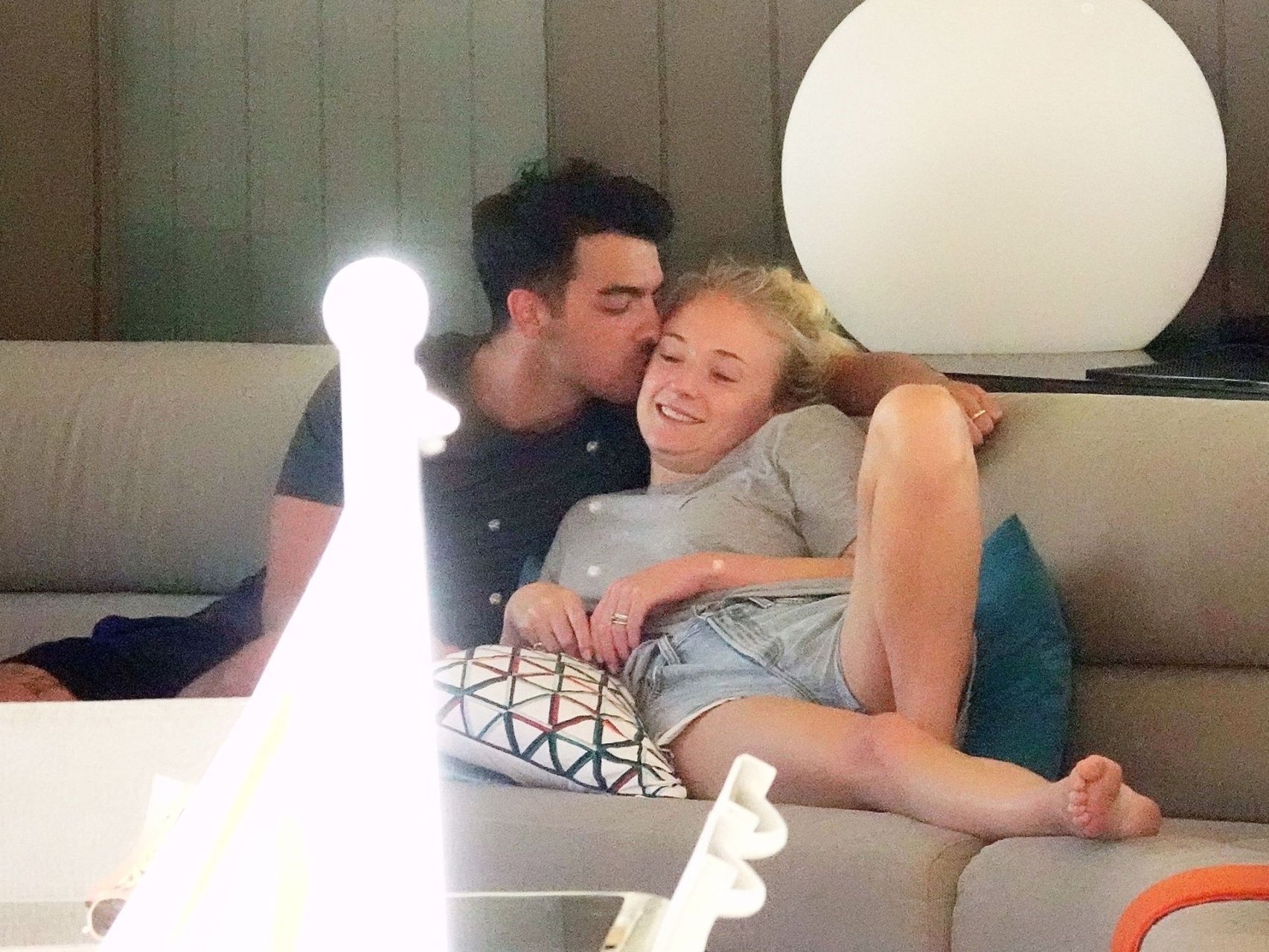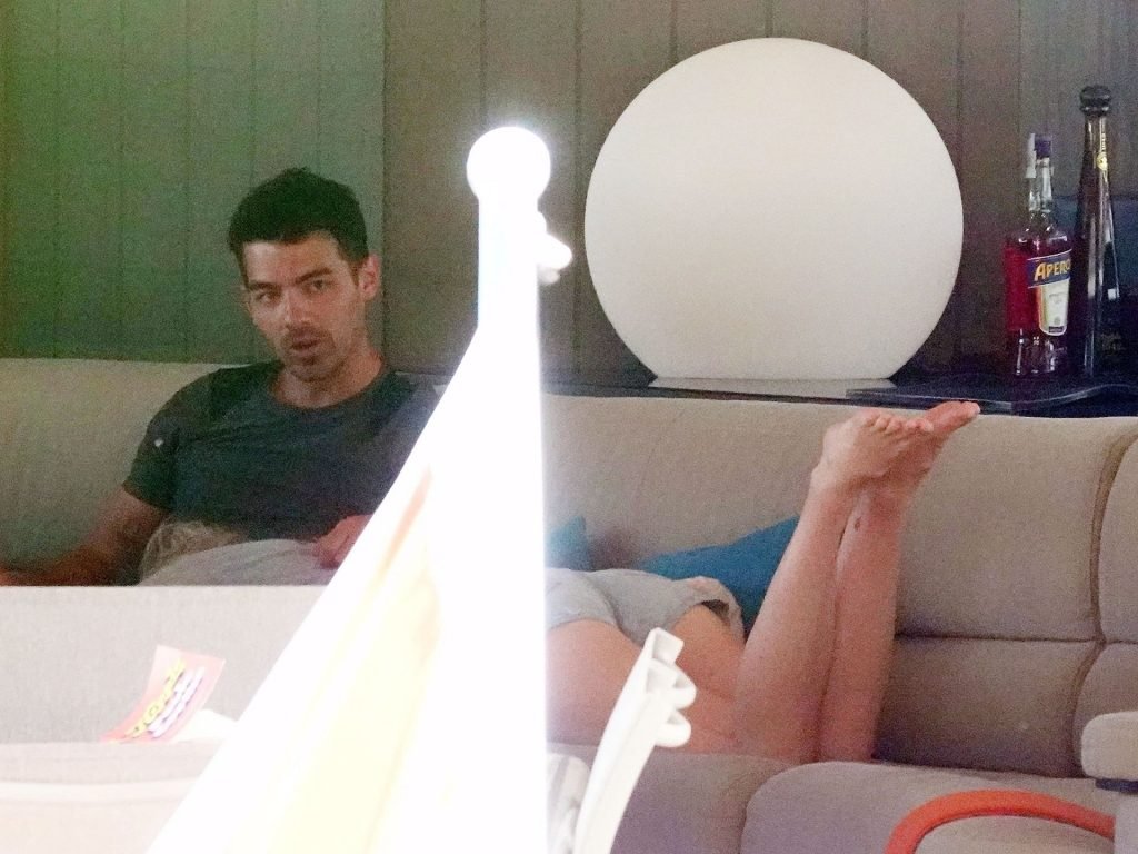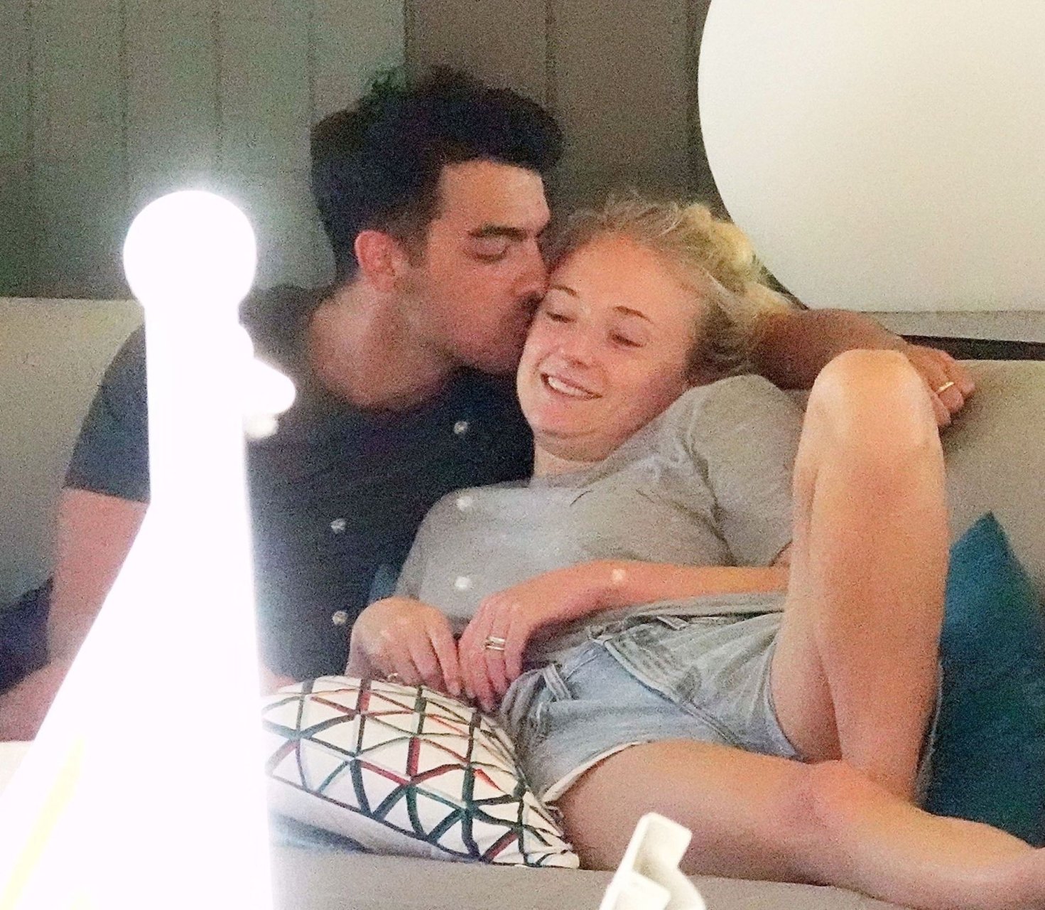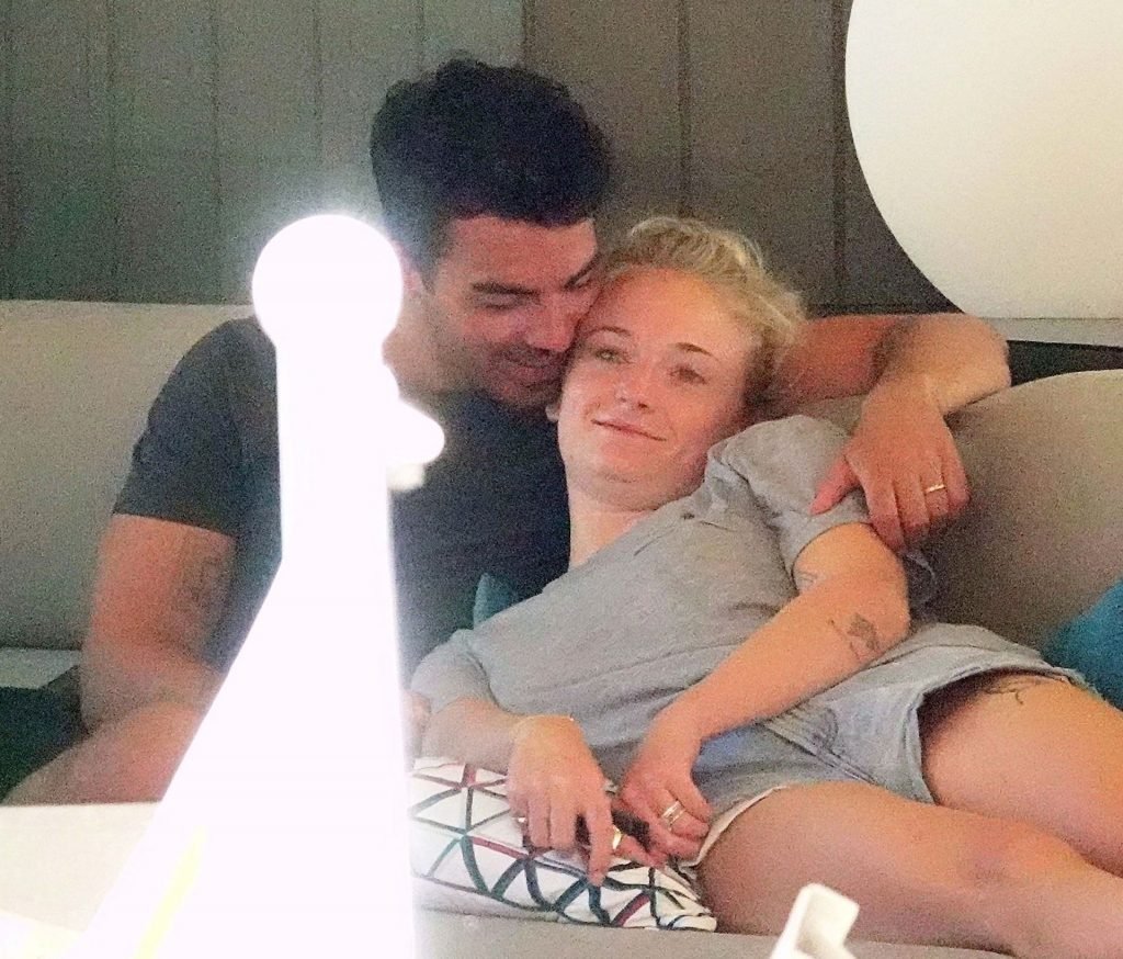 O casal passou o dia em seu iate luxuoso no mar e se divertiu ao mergulhar nas águas italianas, com Joe sem camisa e Sophie usando um maiô branco de noiva.