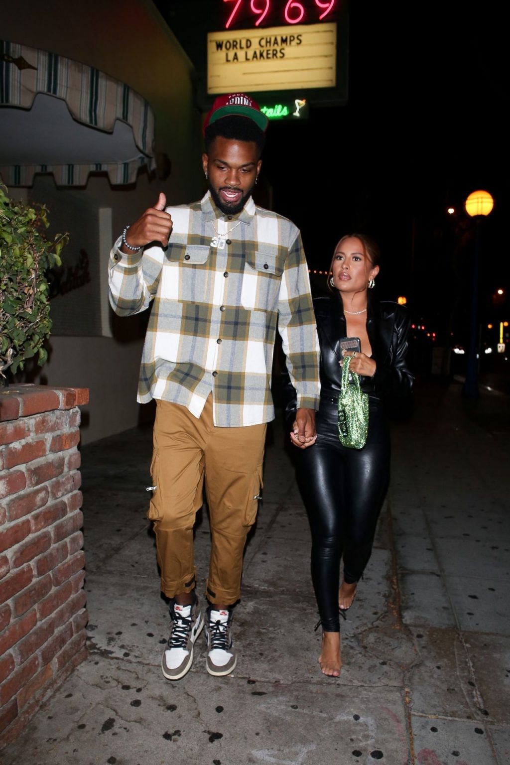 A esposa do ex-jogador dos Lakers e BFF de Kylie Jenner usou um conjunto de couro preto acompanhado por uma bolsa brilhante.