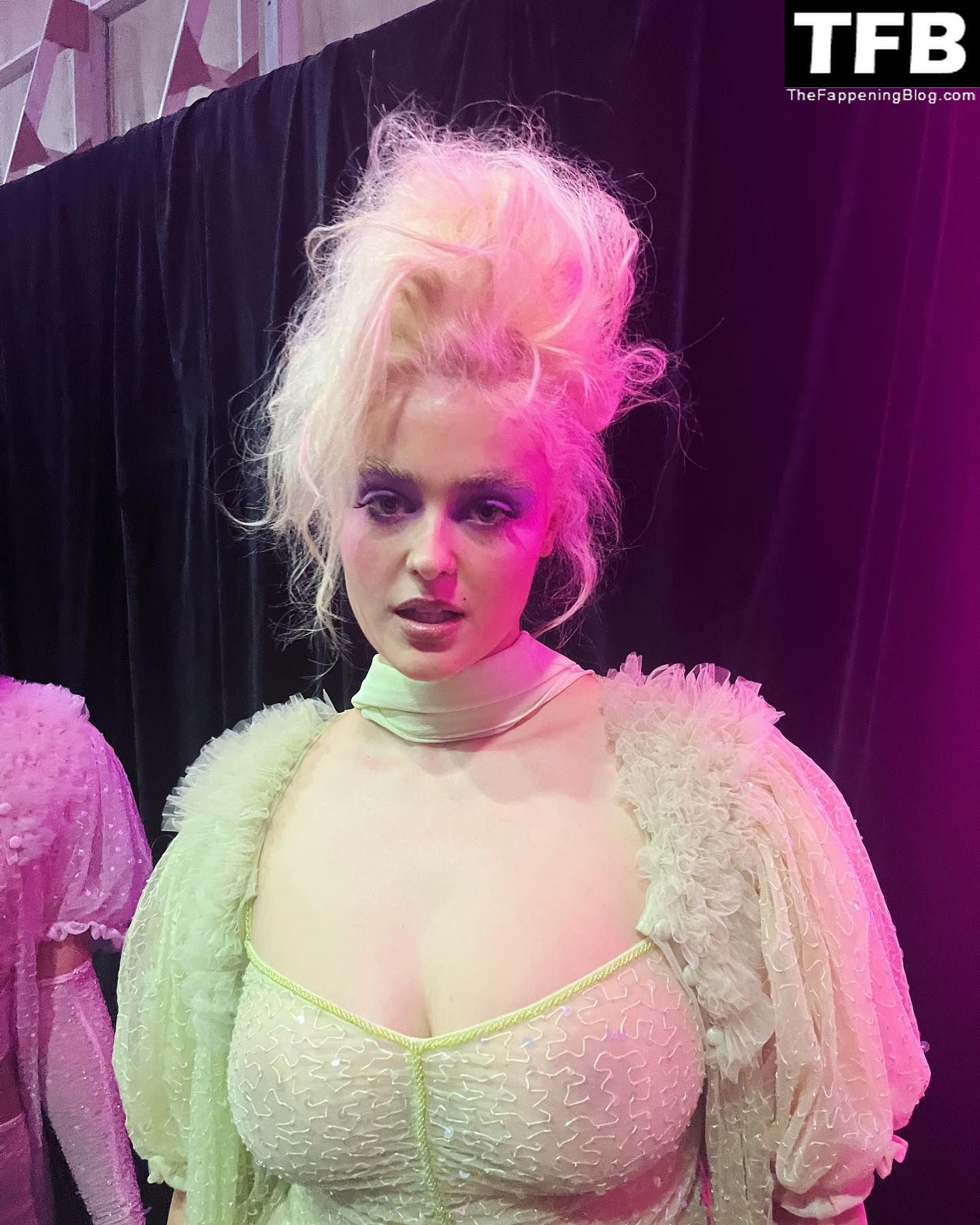 A modelo Stefania Ferrario exibe seus seios levemente nus enquanto posa antes do evento de moda na Austrália, 12/05/2022.