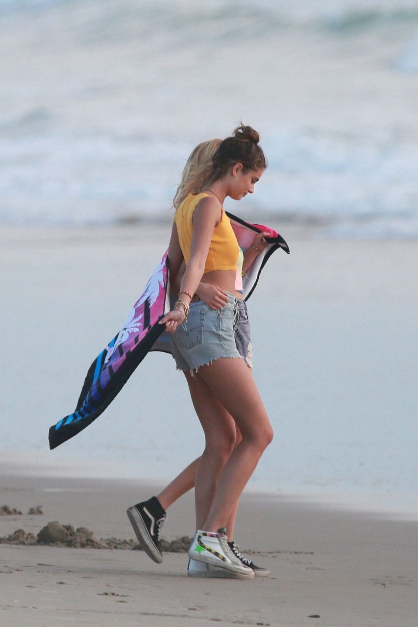 A beleza de 28 anos estava sem sutiã para o ensaio e sofreu um pequeno incidente na forma de um nip slip enquanto as garotas estavam deitadas na areia sob um guarda-sol usando uma camisola de seda.