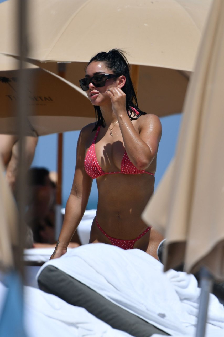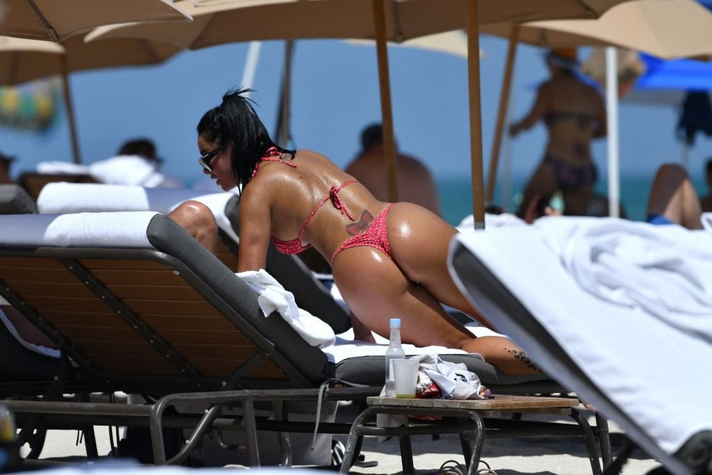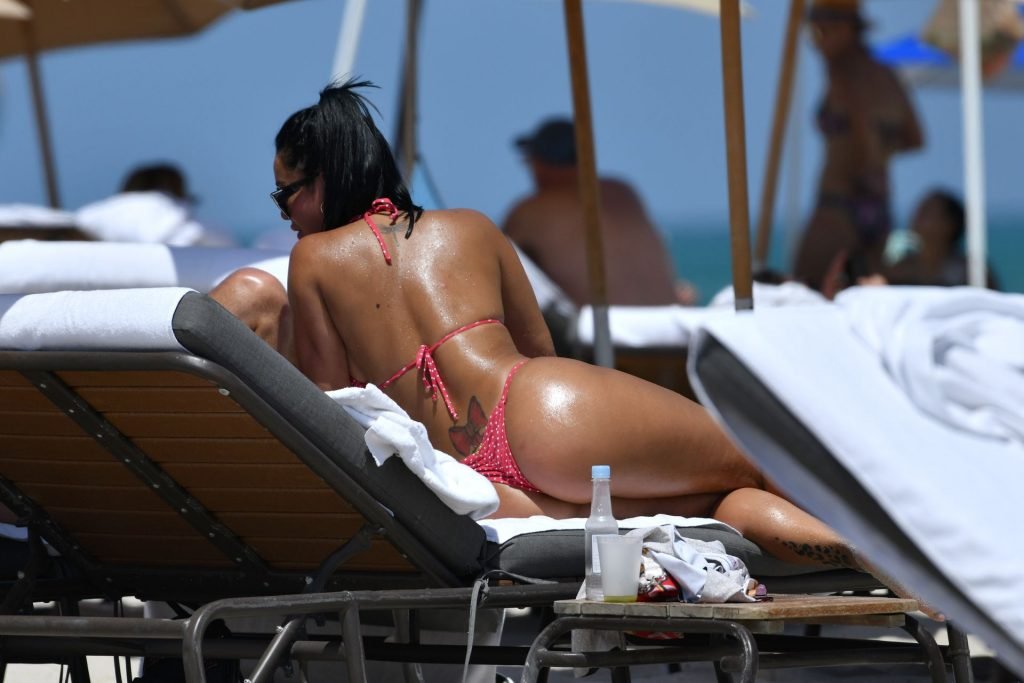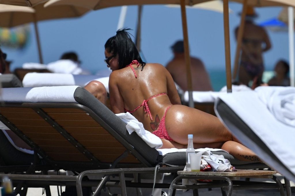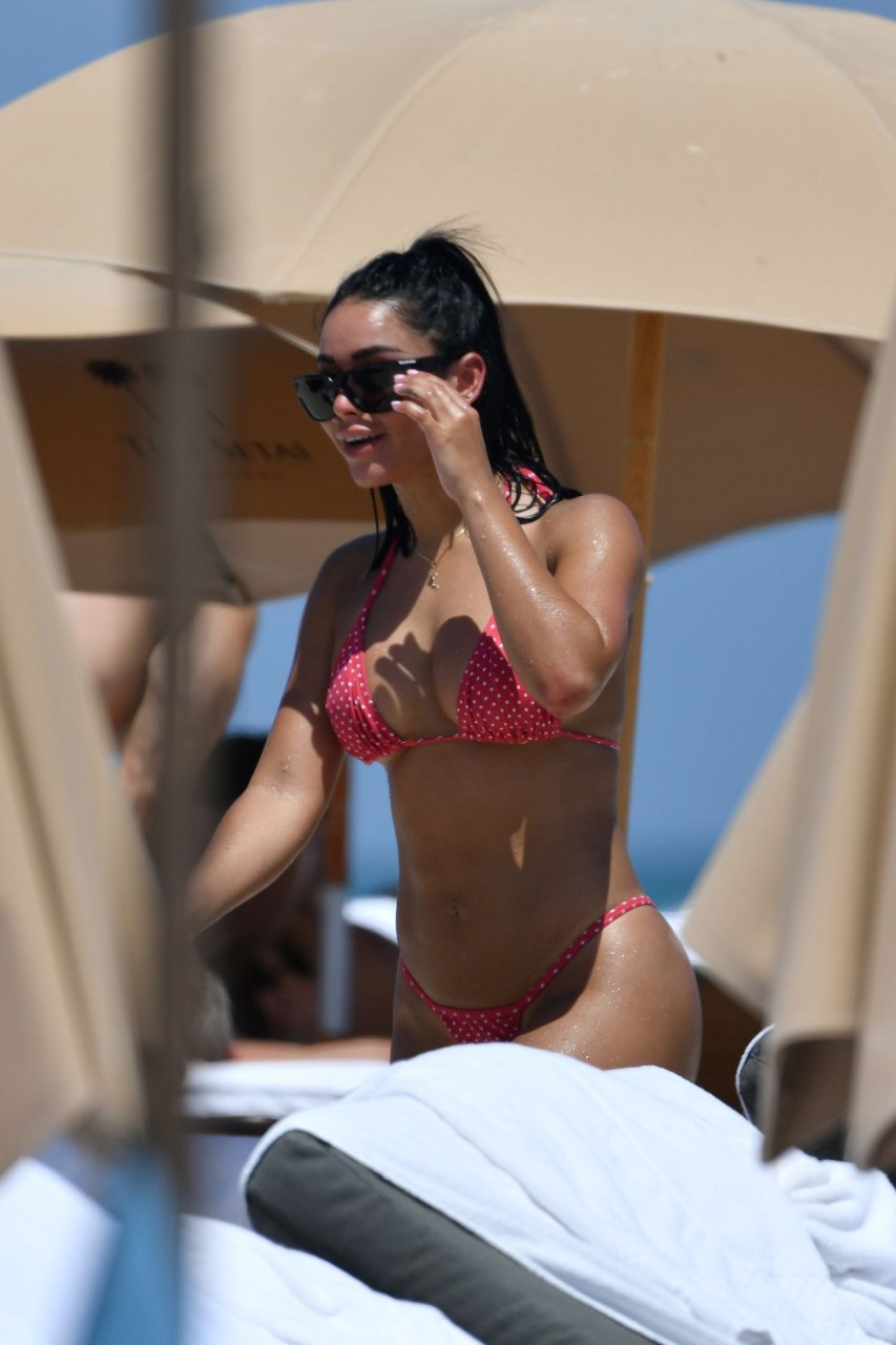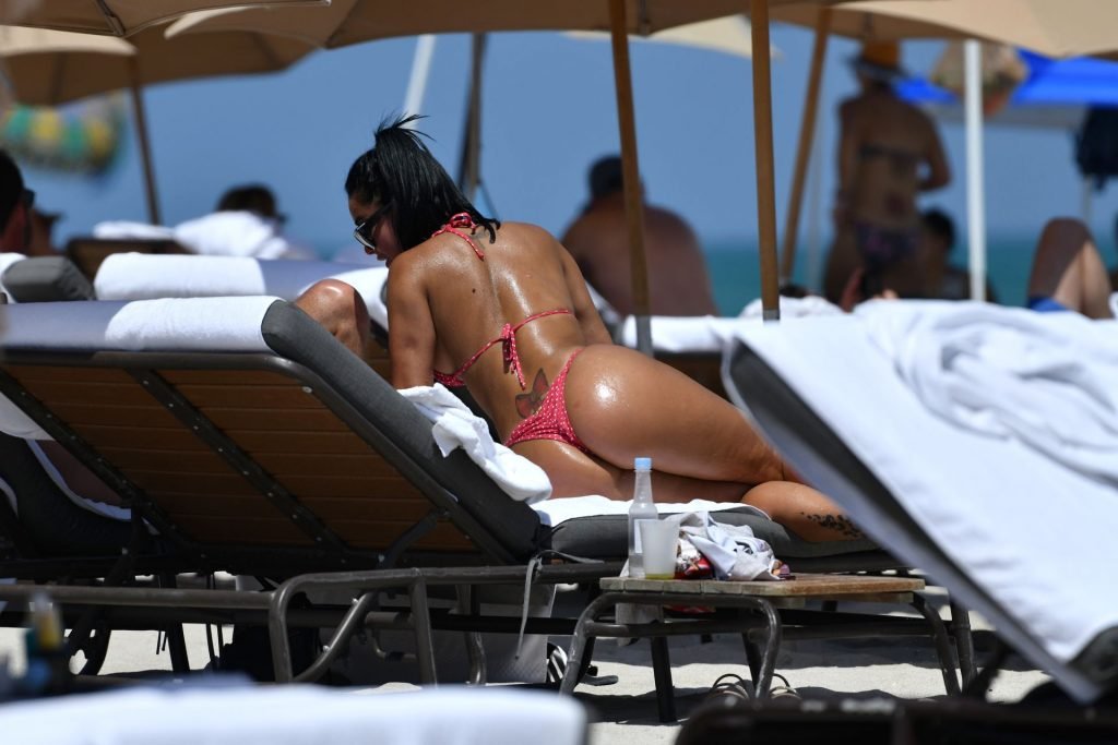 A modelo fitness Stephanie Rao exibe suas curvas em um minúsculo biquíni fio dental de bolinhas na praia de Miami, 27/04/2019.