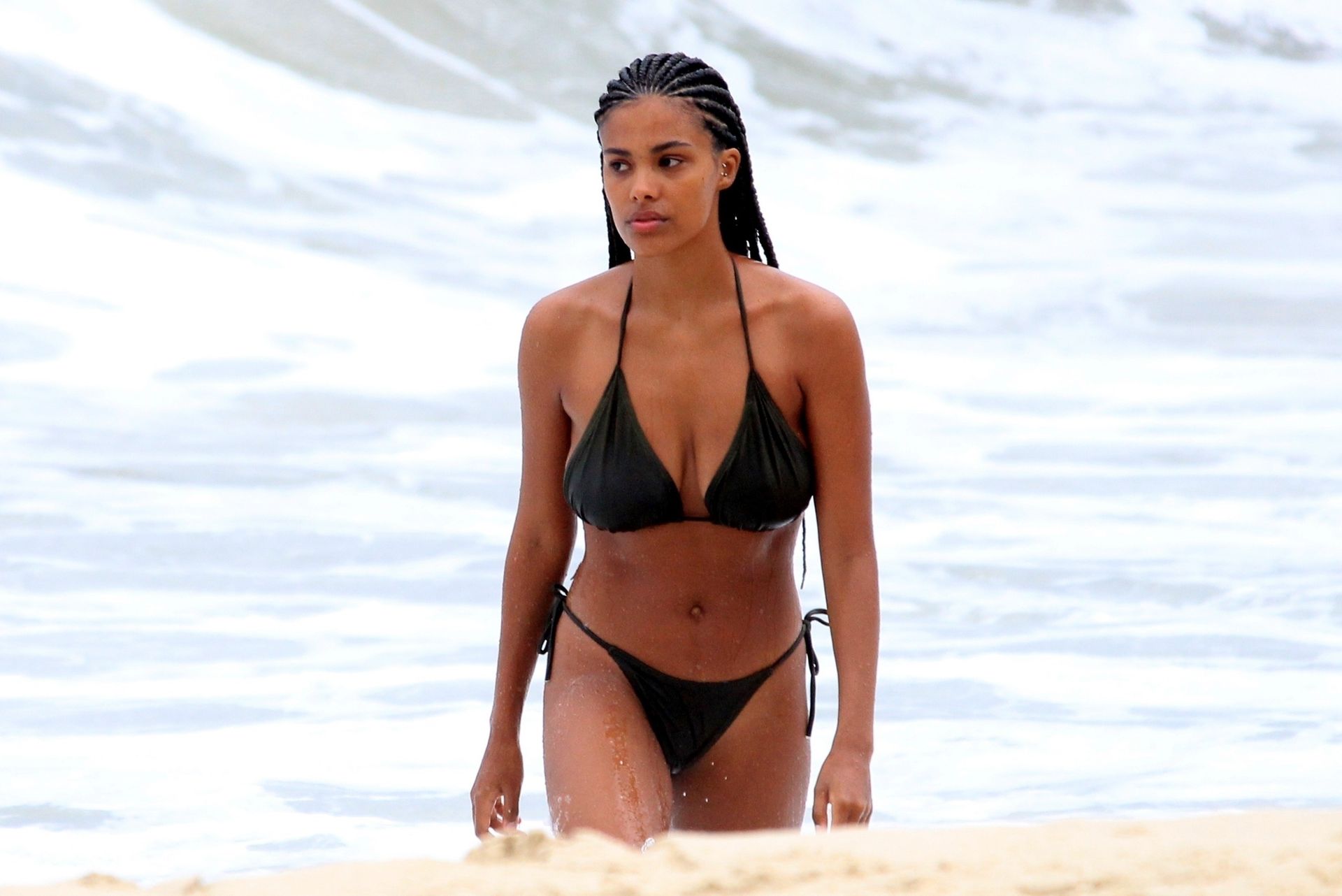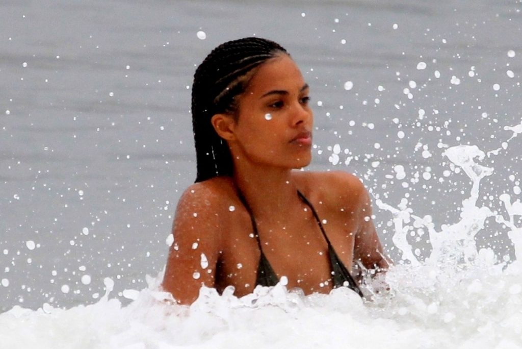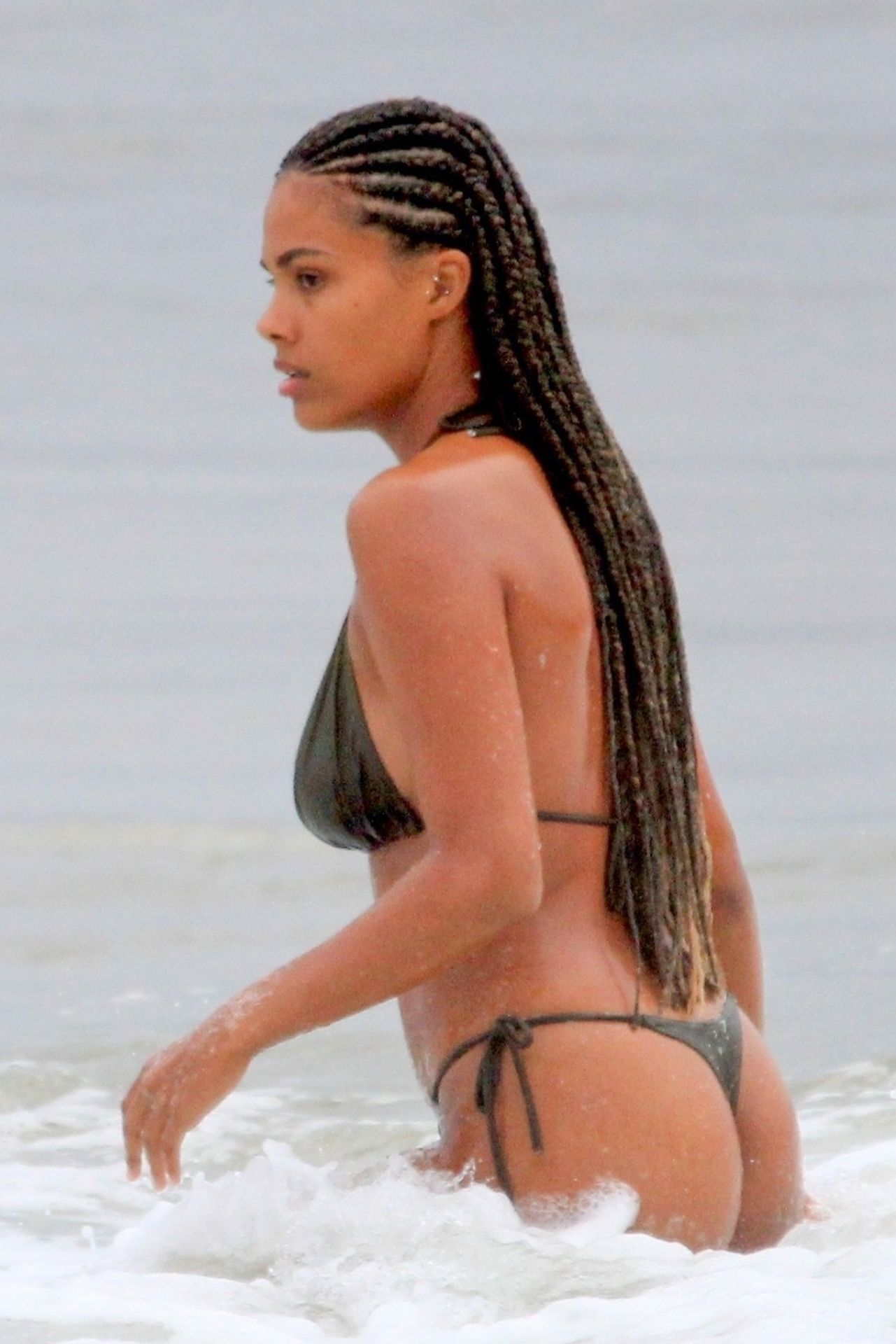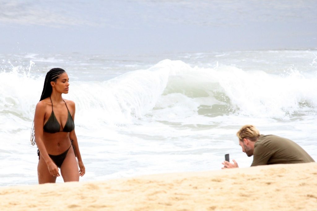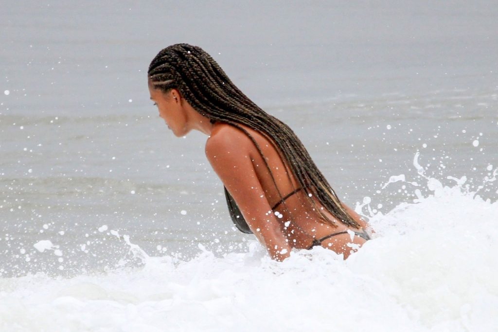 Vincent Cassel’s wife Tina Kunakey is joined by a friend for a beach day in Rio de Janeiro, 02/21/2020. A modelo, vestindo um biquíni preto, deu um mergulho enquanto exibia seu novo cabelo trançado.