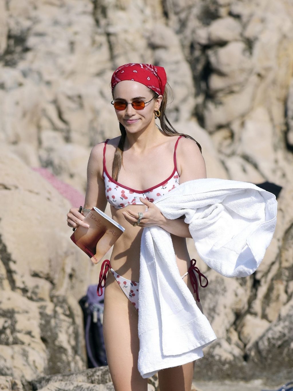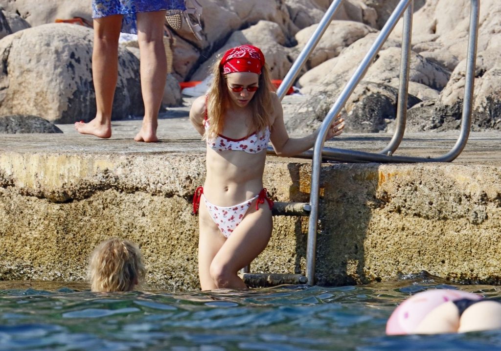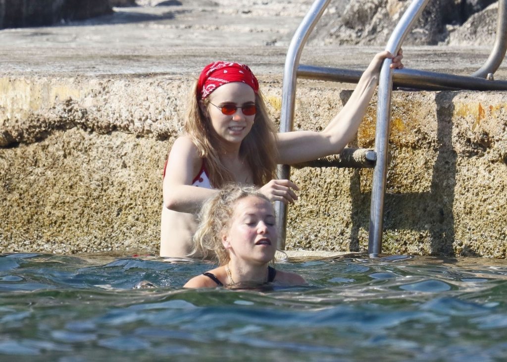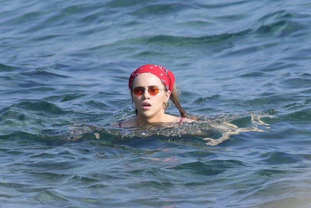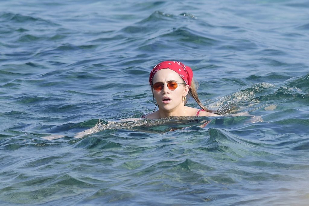 Modelo inglesa e atriz Suki Waterhouse impressiona com um biquíni Louis Vuitton e uma faixa vermelha na cabeça enquanto dá um mergulho com uma amiga, aproveitando o clima quente durante as férias no Sul da França, 31/07/2020.