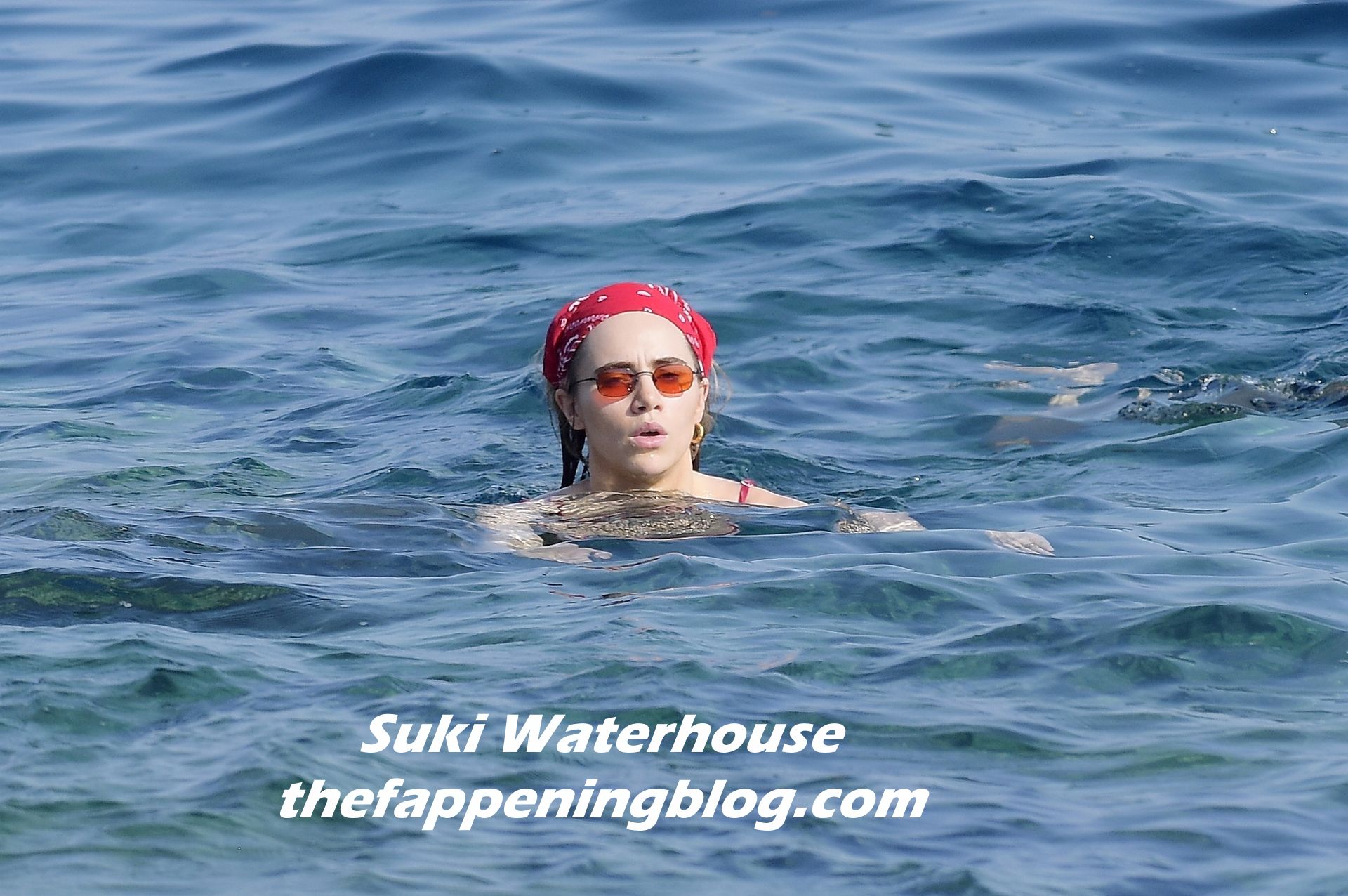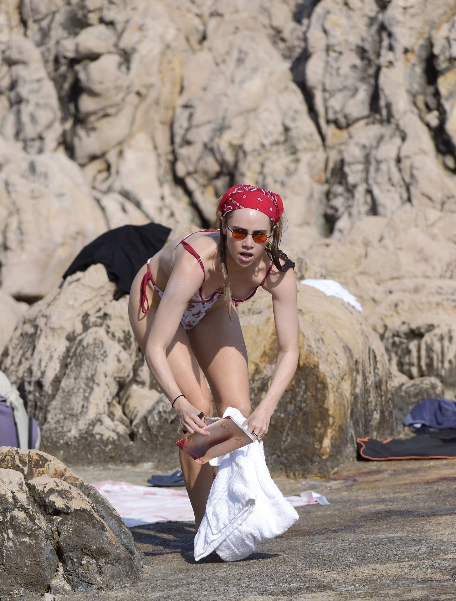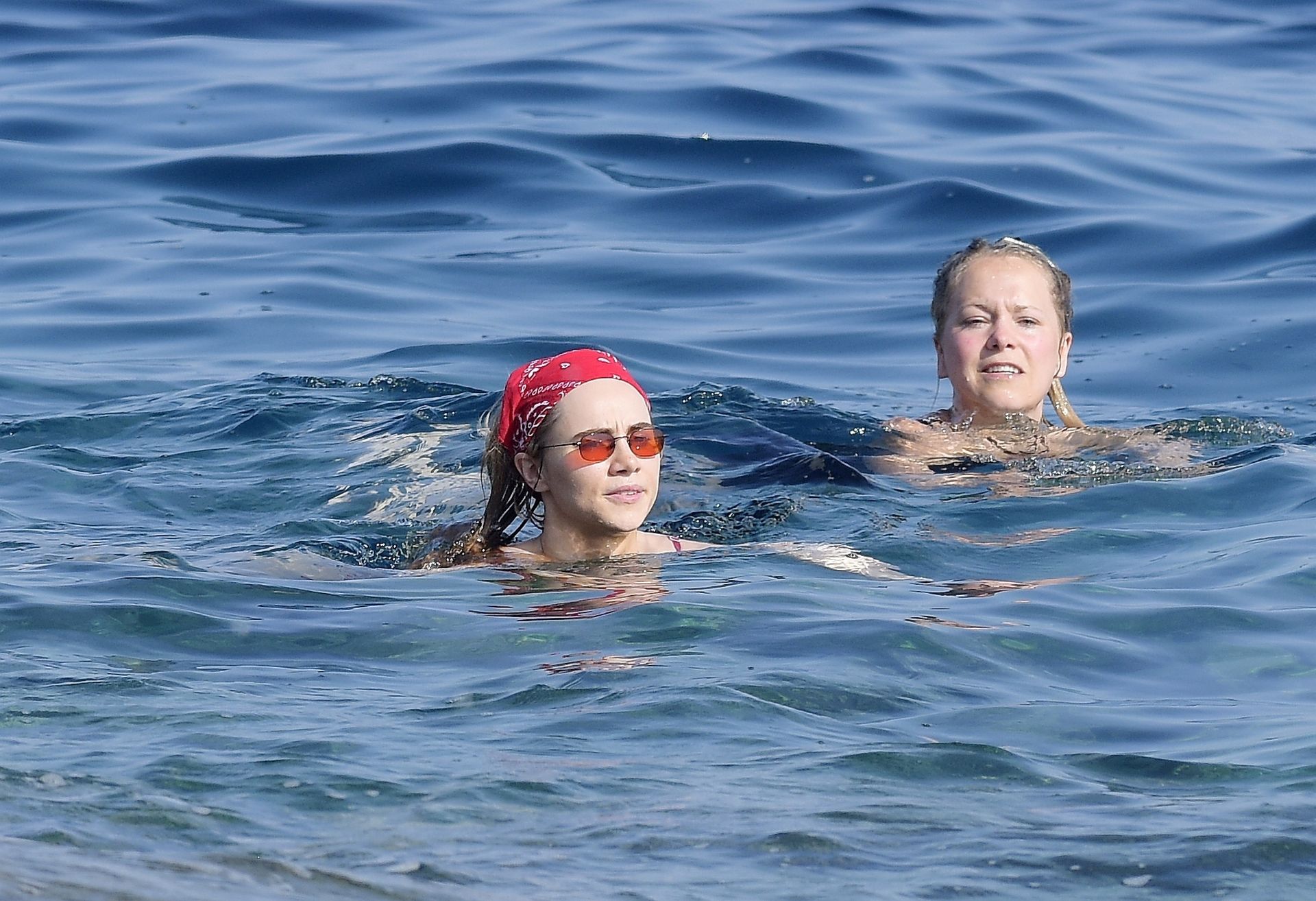 Modelo inglesa e atriz Suki Waterhouse impressiona com um biquíni Louis Vuitton e uma faixa vermelha na cabeça enquanto dá um mergulho com uma amiga, aproveitando o clima quente durante as férias no Sul da França, 31/07/2020.