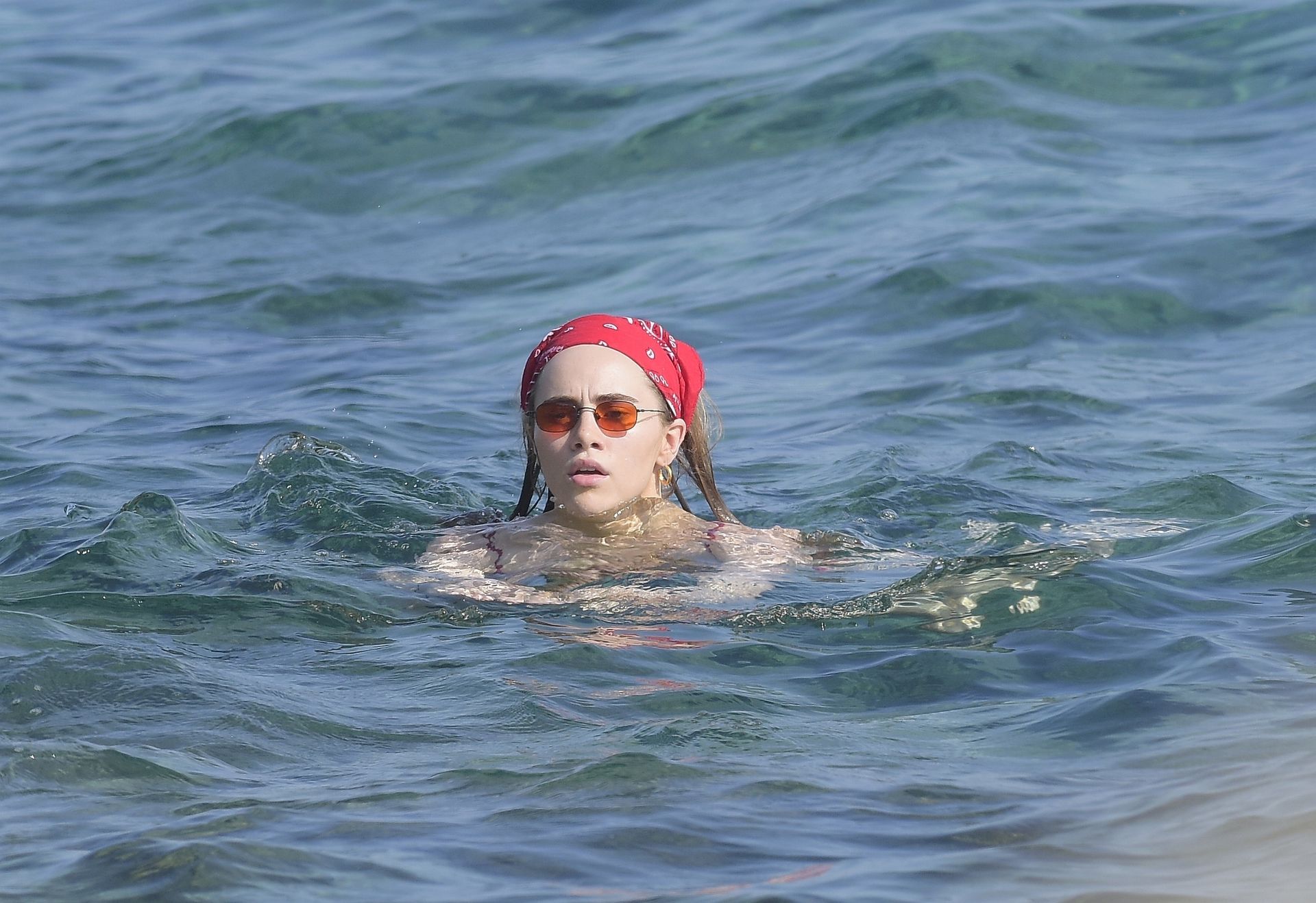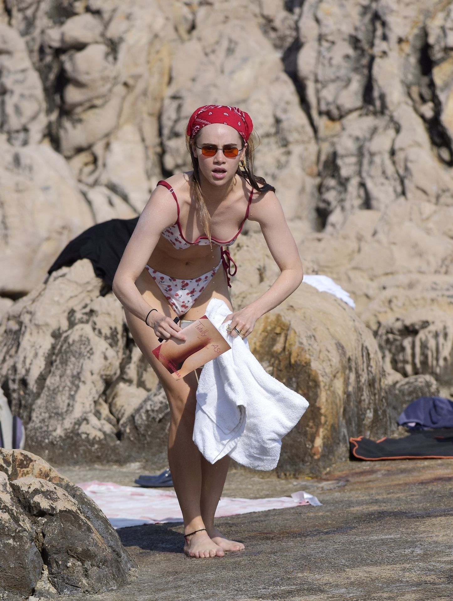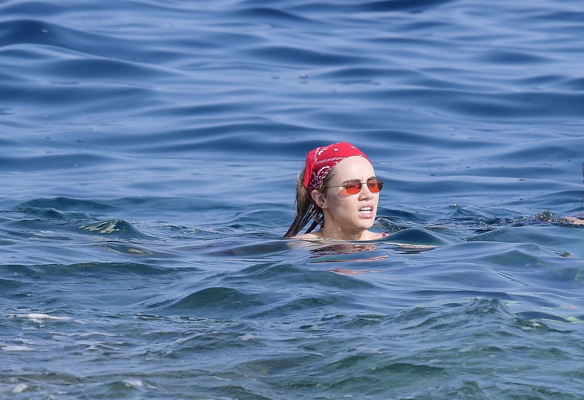 Modelo inglesa e atriz Suki Waterhouse impressiona com um biquíni Louis Vuitton e uma faixa vermelha na cabeça enquanto dá um mergulho com uma amiga, aproveitando o clima quente durante as férias no Sul da França, 31/07/2020.