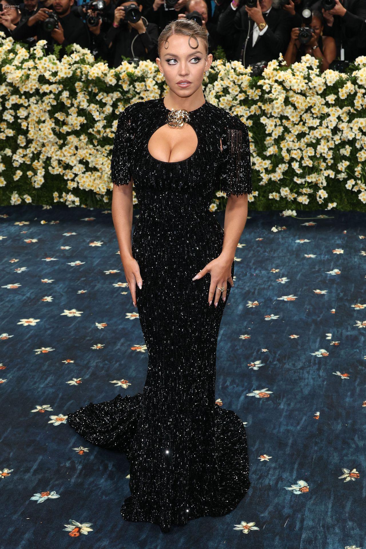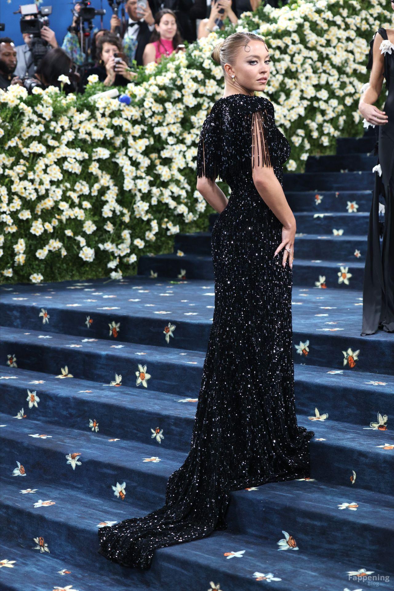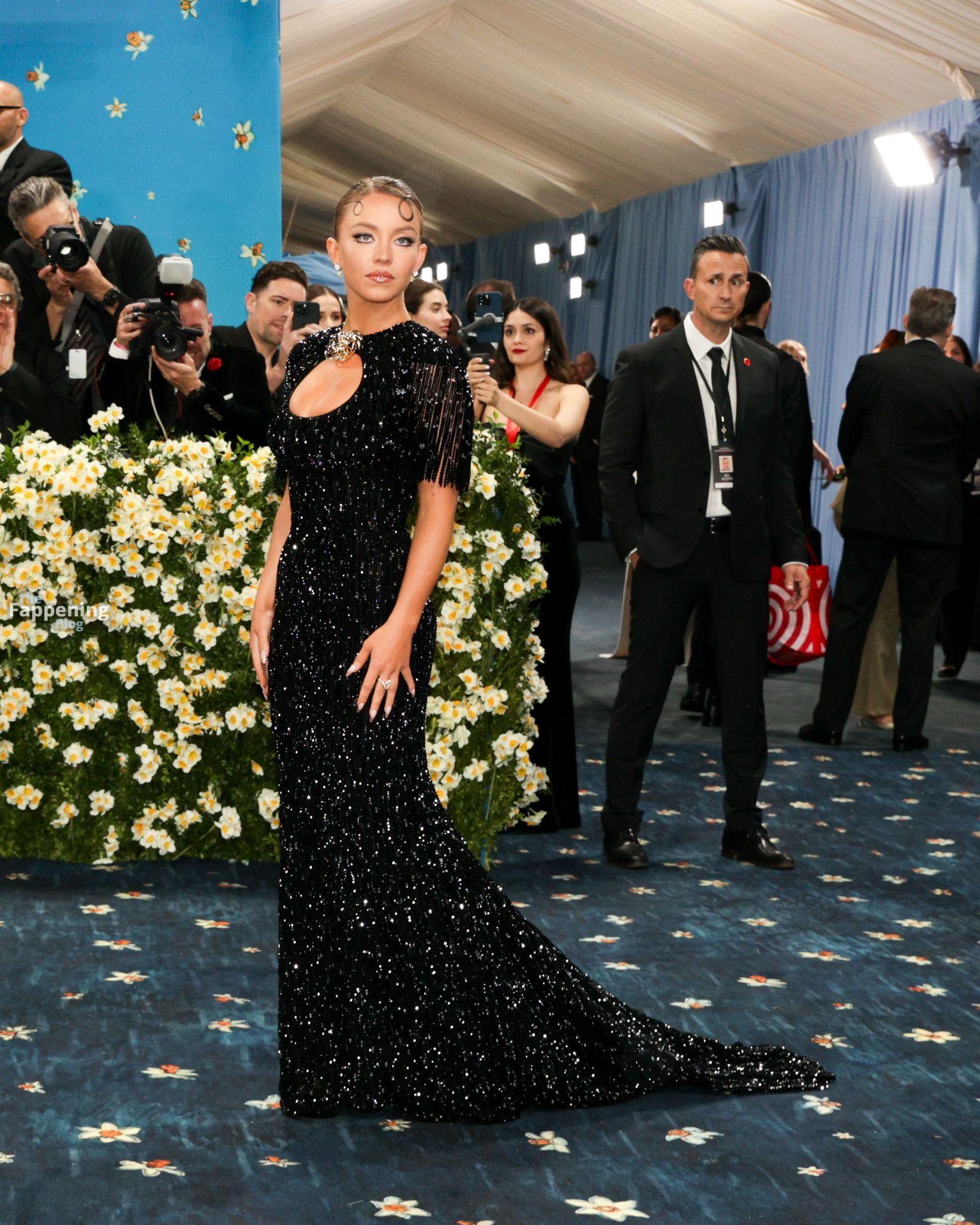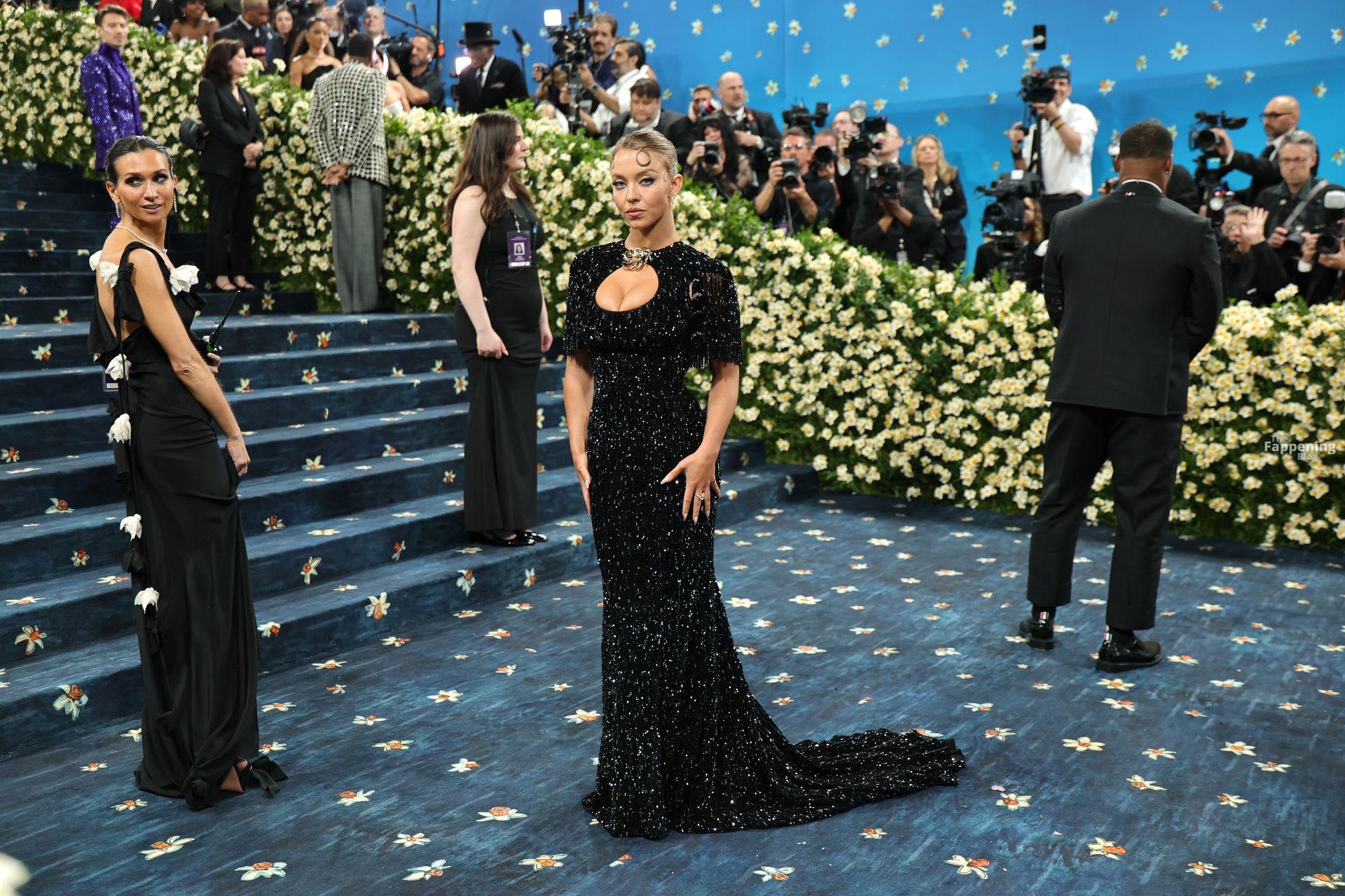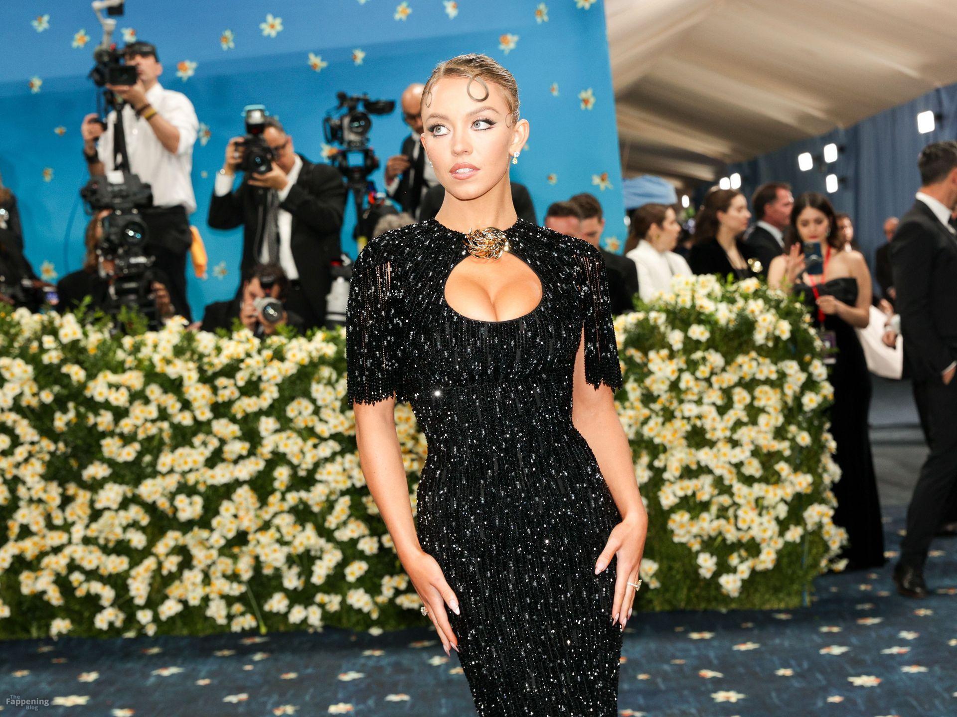 A estrela do Fappening Sydney Sweeney esteve no Met Gala 2025, chegando com um vestido preto de lantejoulas que realçava suas curvas.