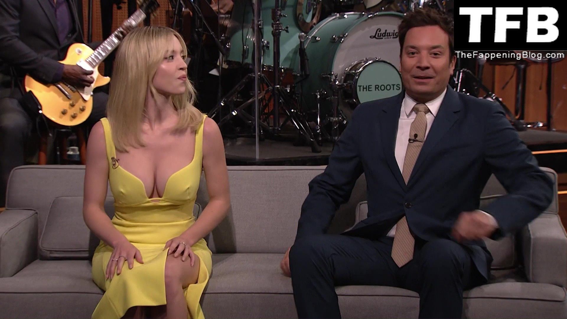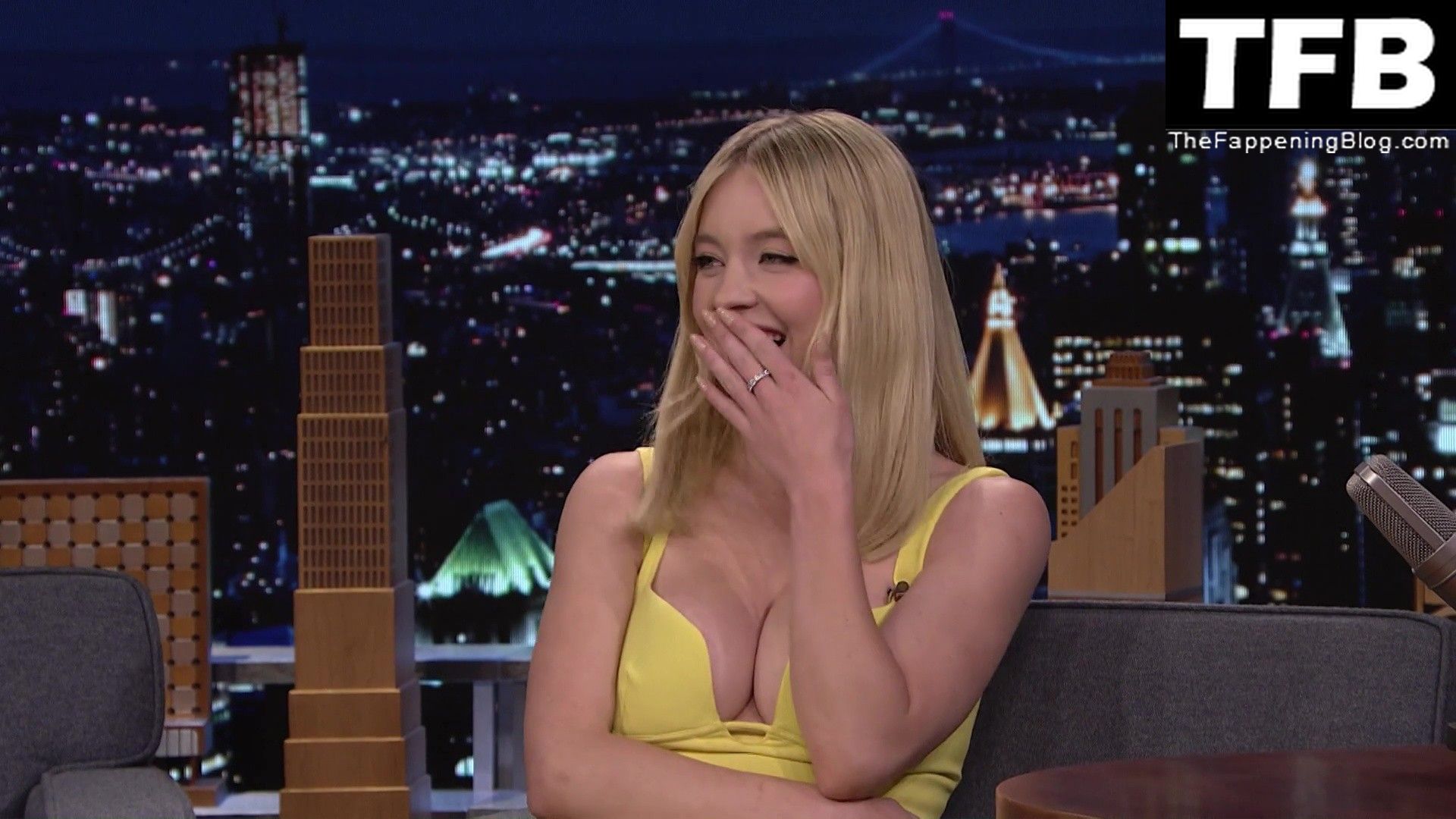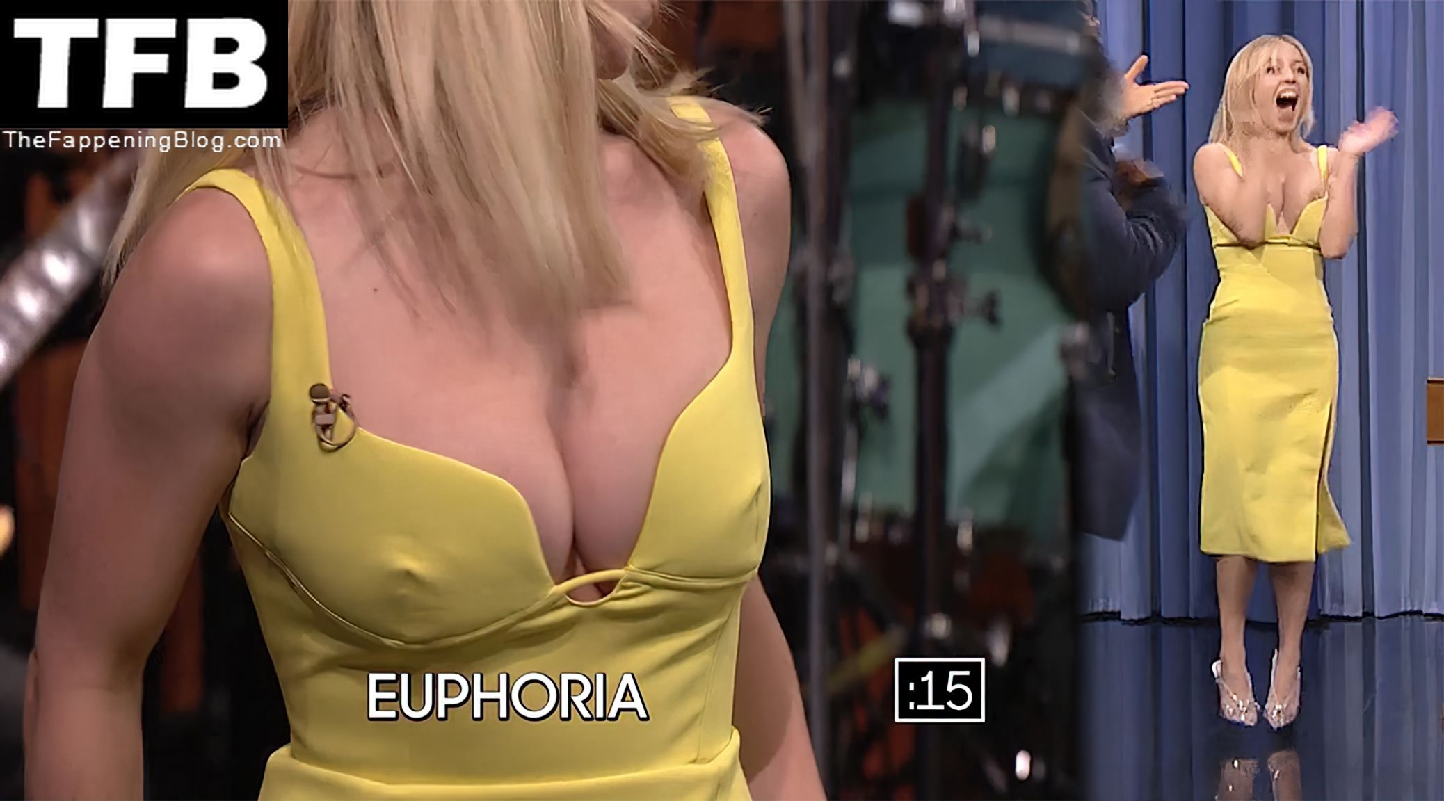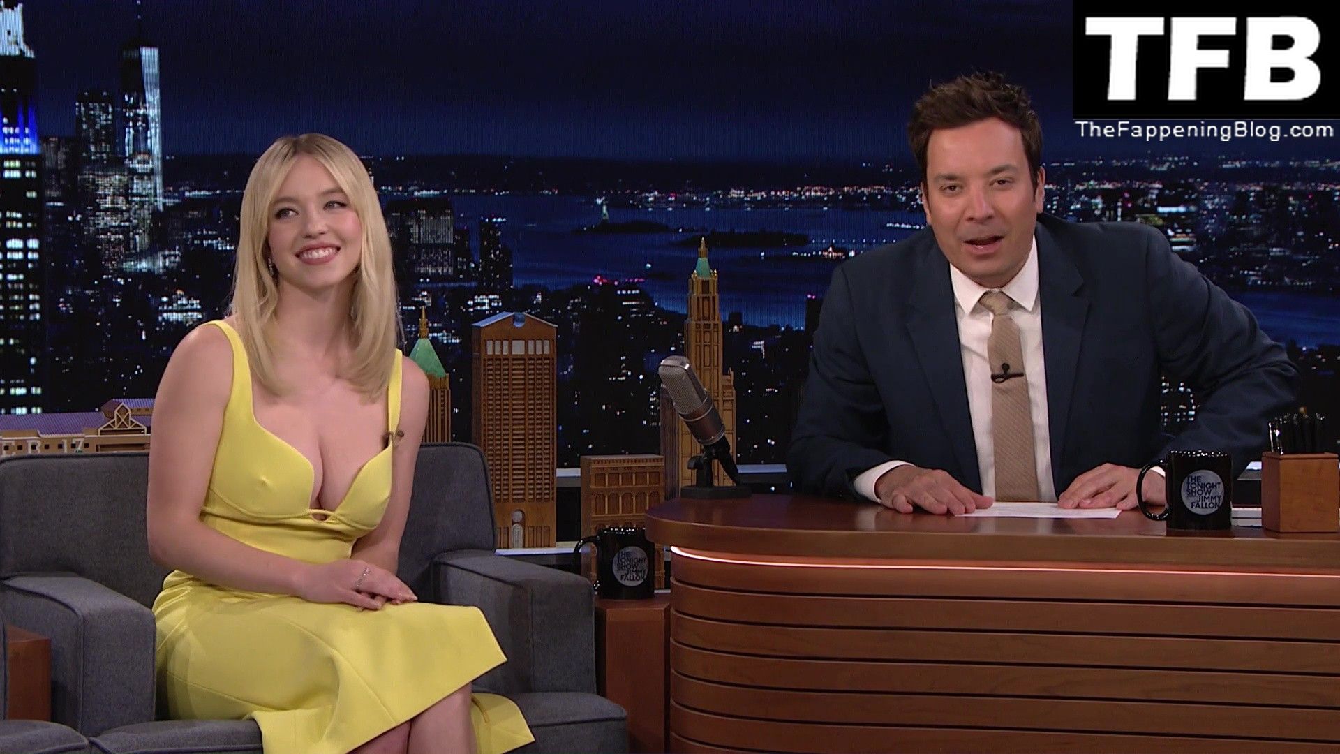 Sydney Sweeney exibe seu decote sexy e mostra seu mamilo no programa “The Tonight Show with Jimmy Fallon” (maio de 2022).