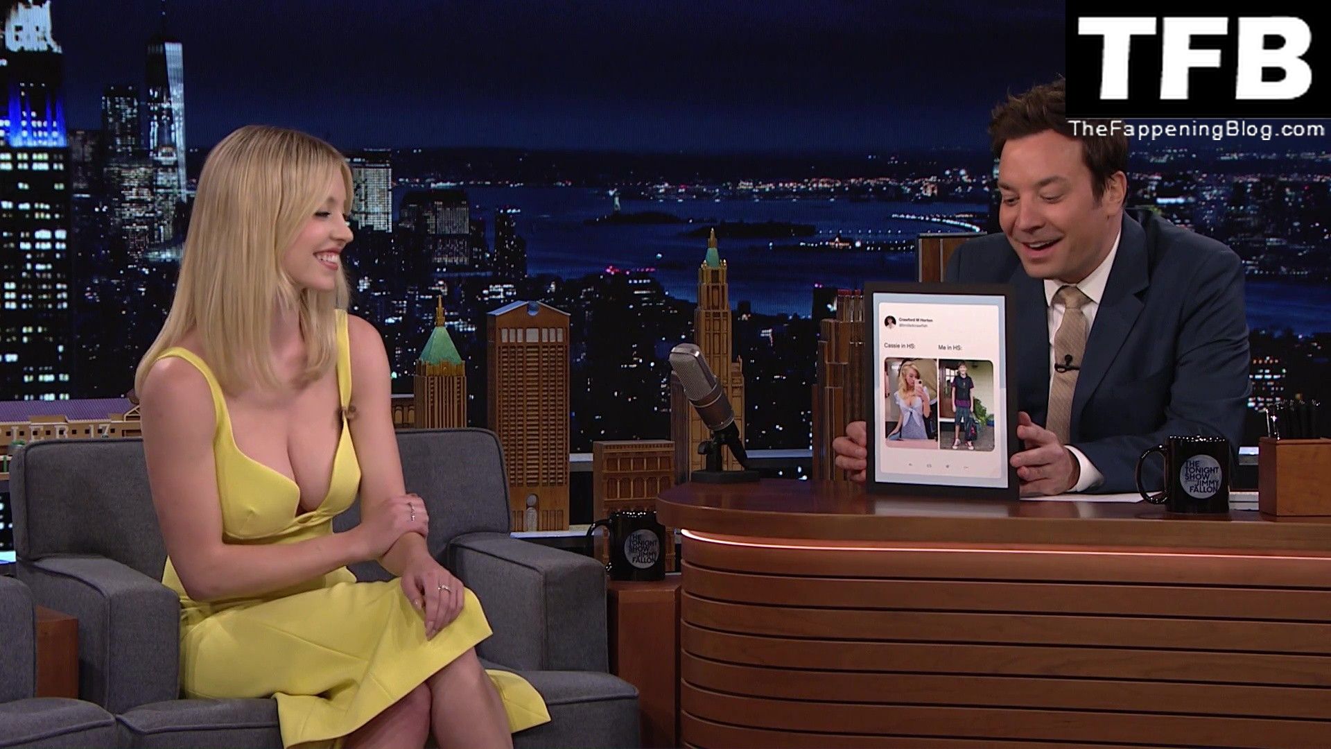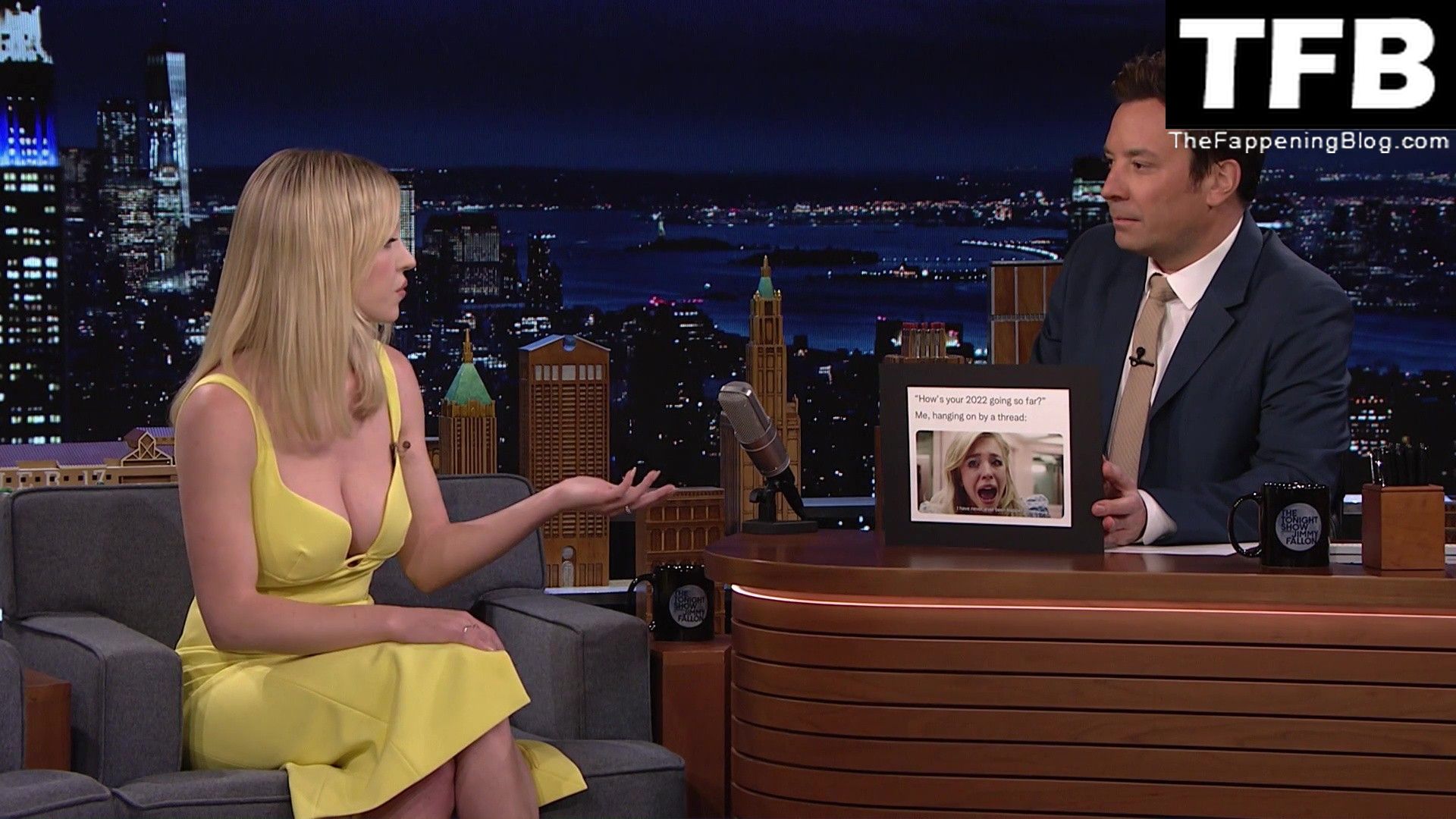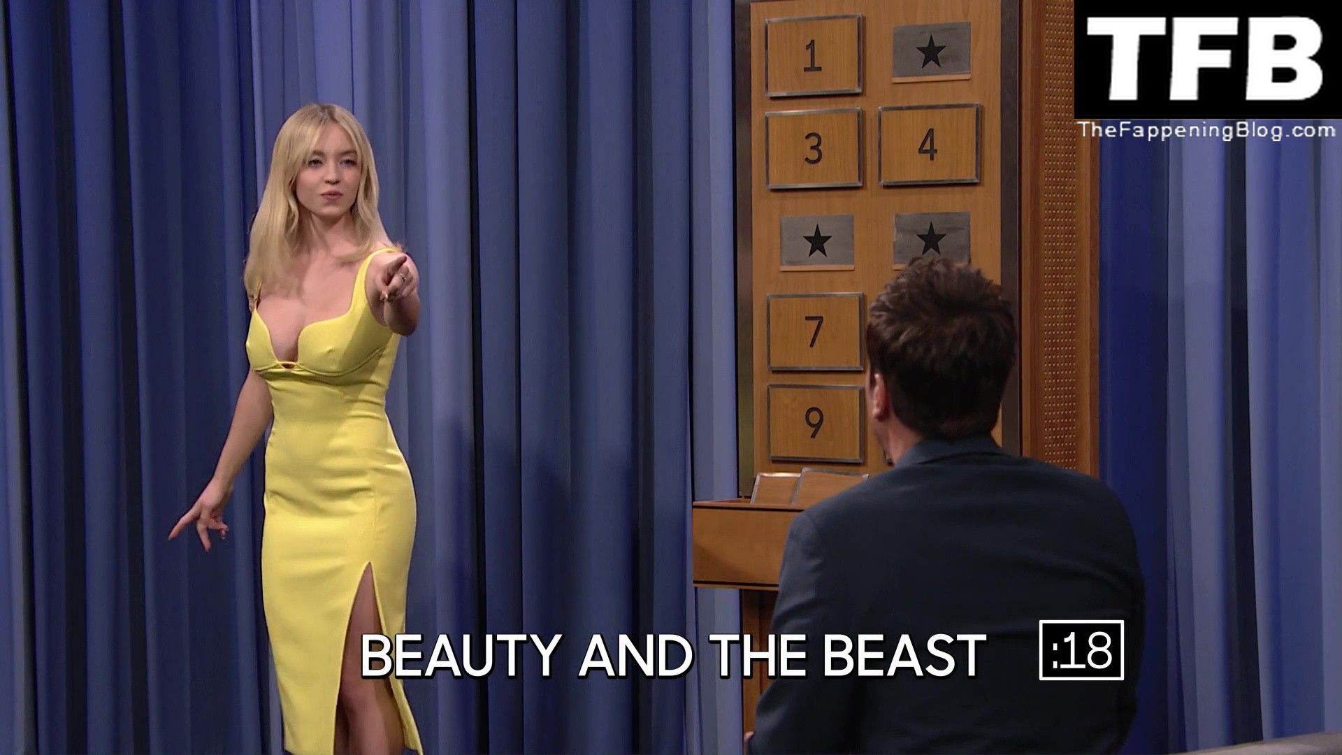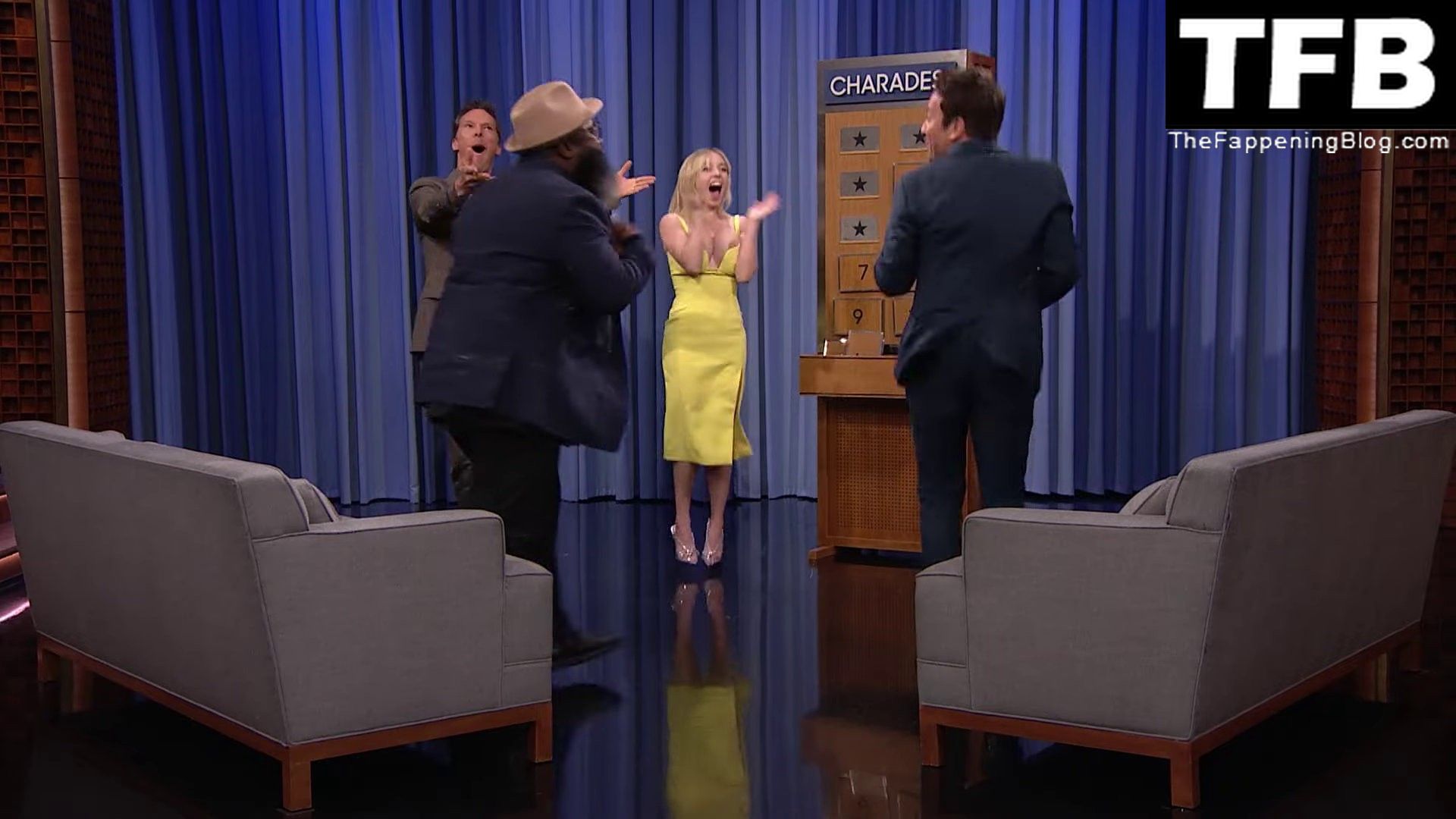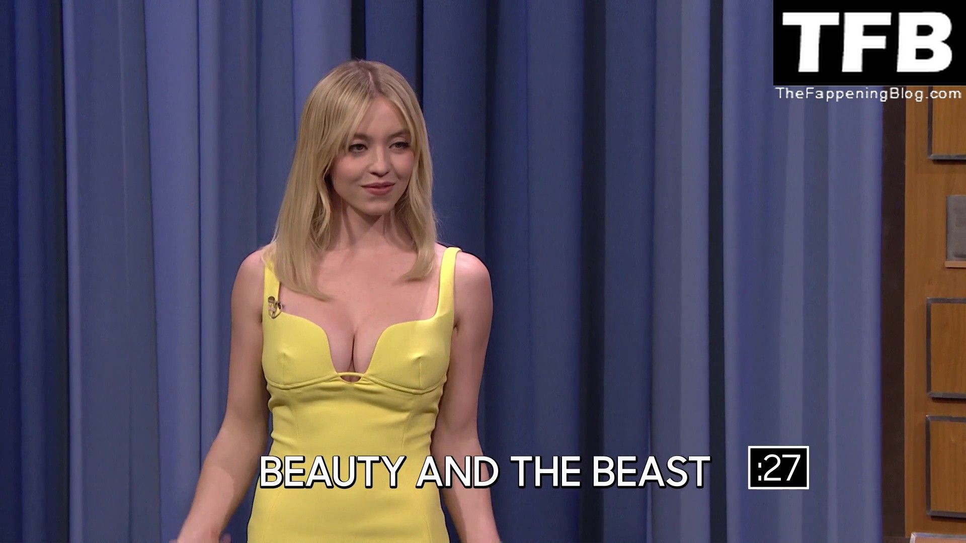 Sydney Sweeney exibe seu decote sexy e mostra seu mamilo no programa “The Tonight Show with Jimmy Fallon” (maio de 2022).
