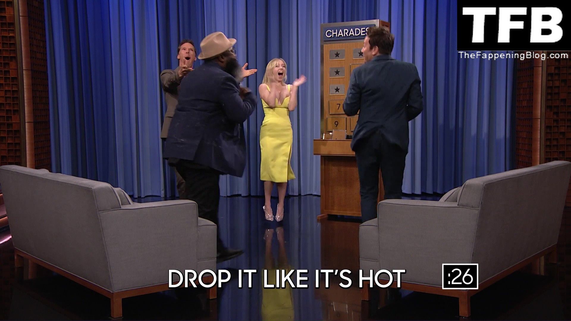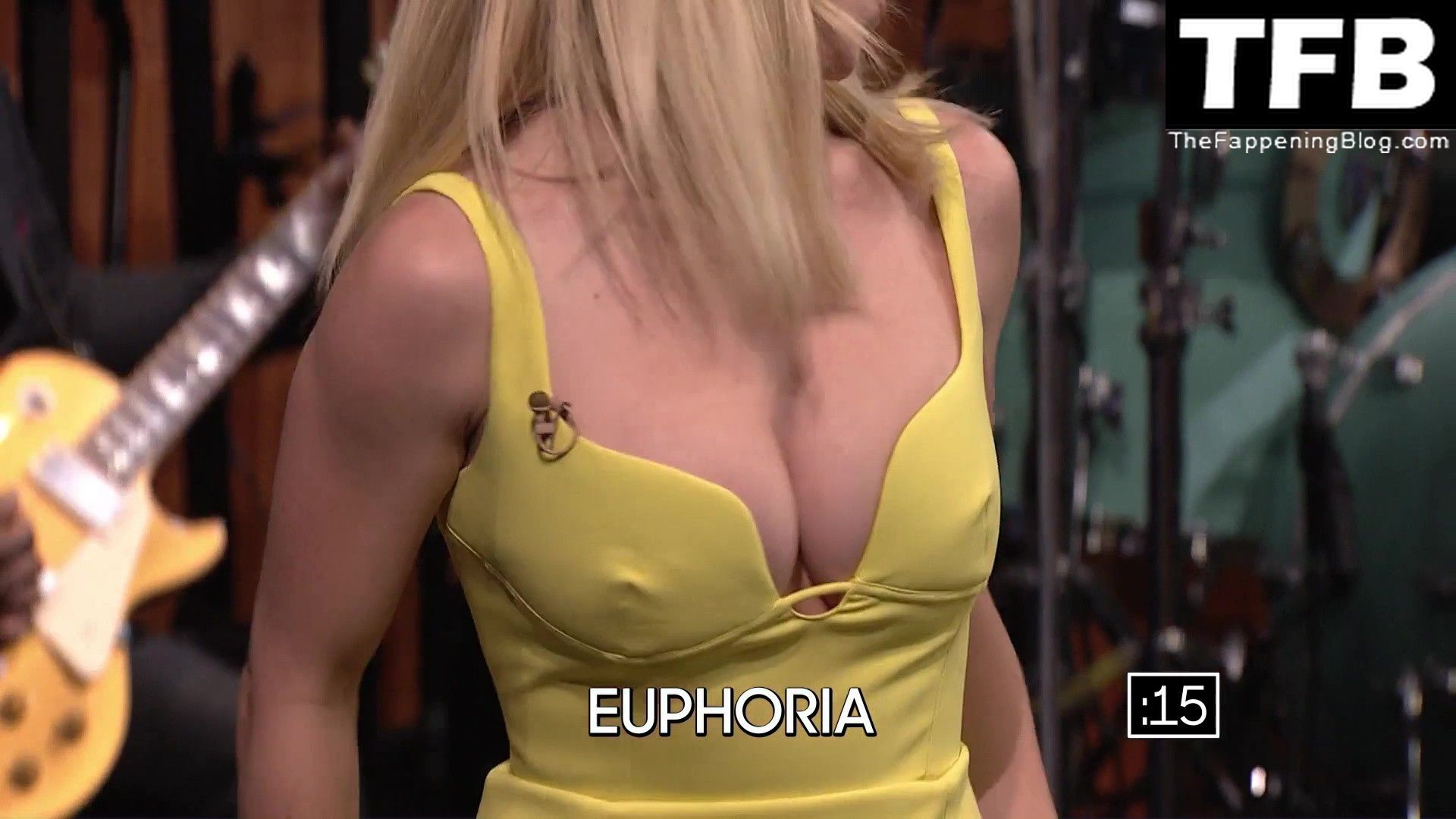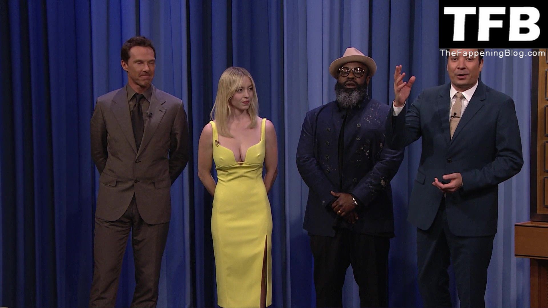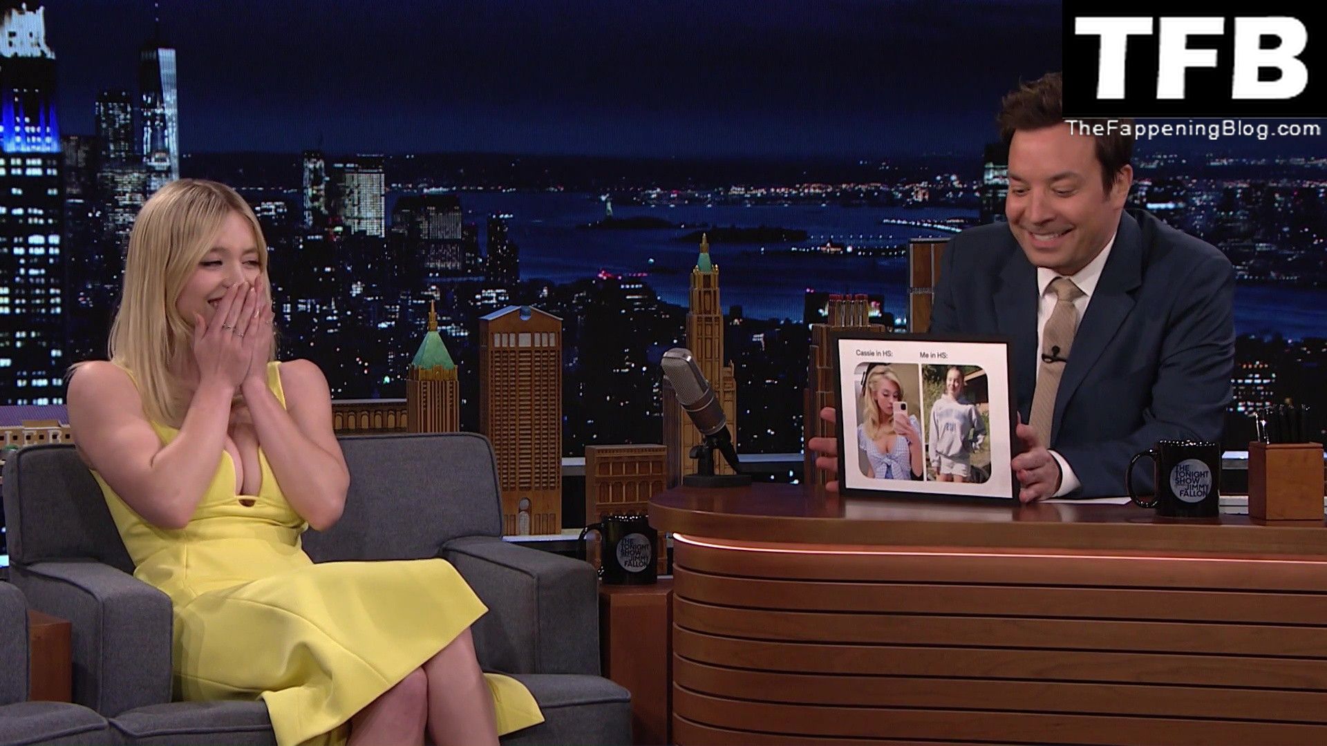 Sydney Sweeney exibe seu decote sexy e mostra seu mamilo no programa “The Tonight Show with Jimmy Fallon” (maio de 2022).
