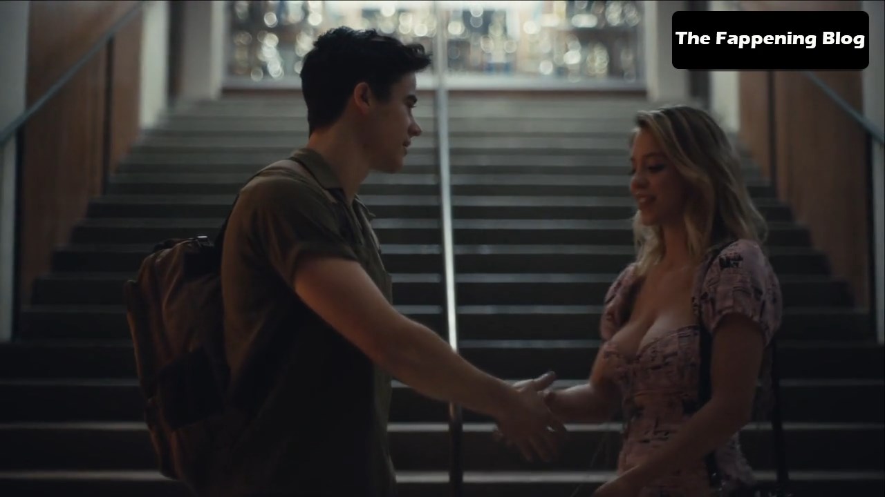 Sexy Sydney Sweeney is sitting facing a guy as he lifts her shirt off over her head. Then we see quite a bit of side boob from behind. She kisses the guy before we see her lying in bed with him – his hand on her right breast before she draws the covers up.