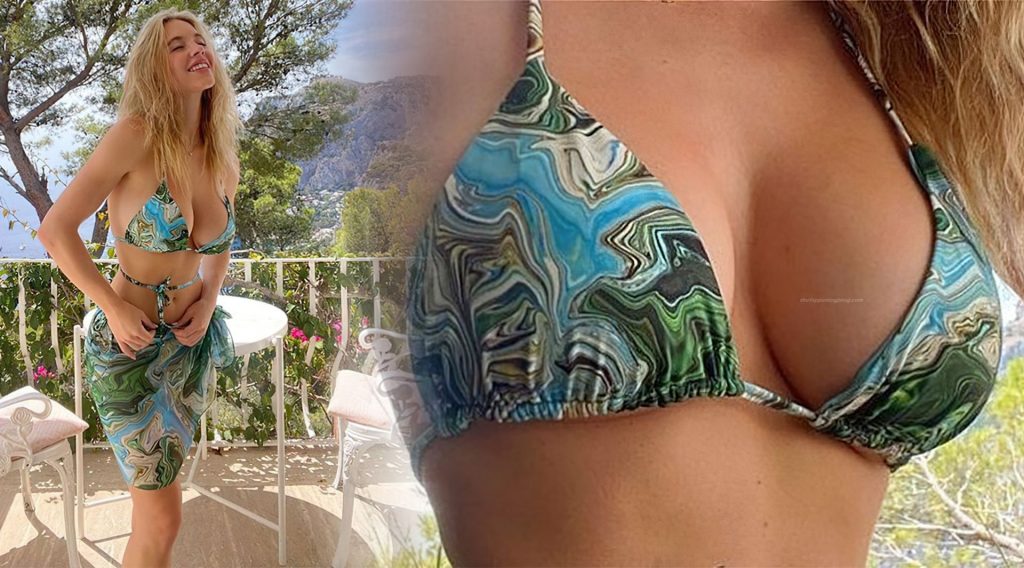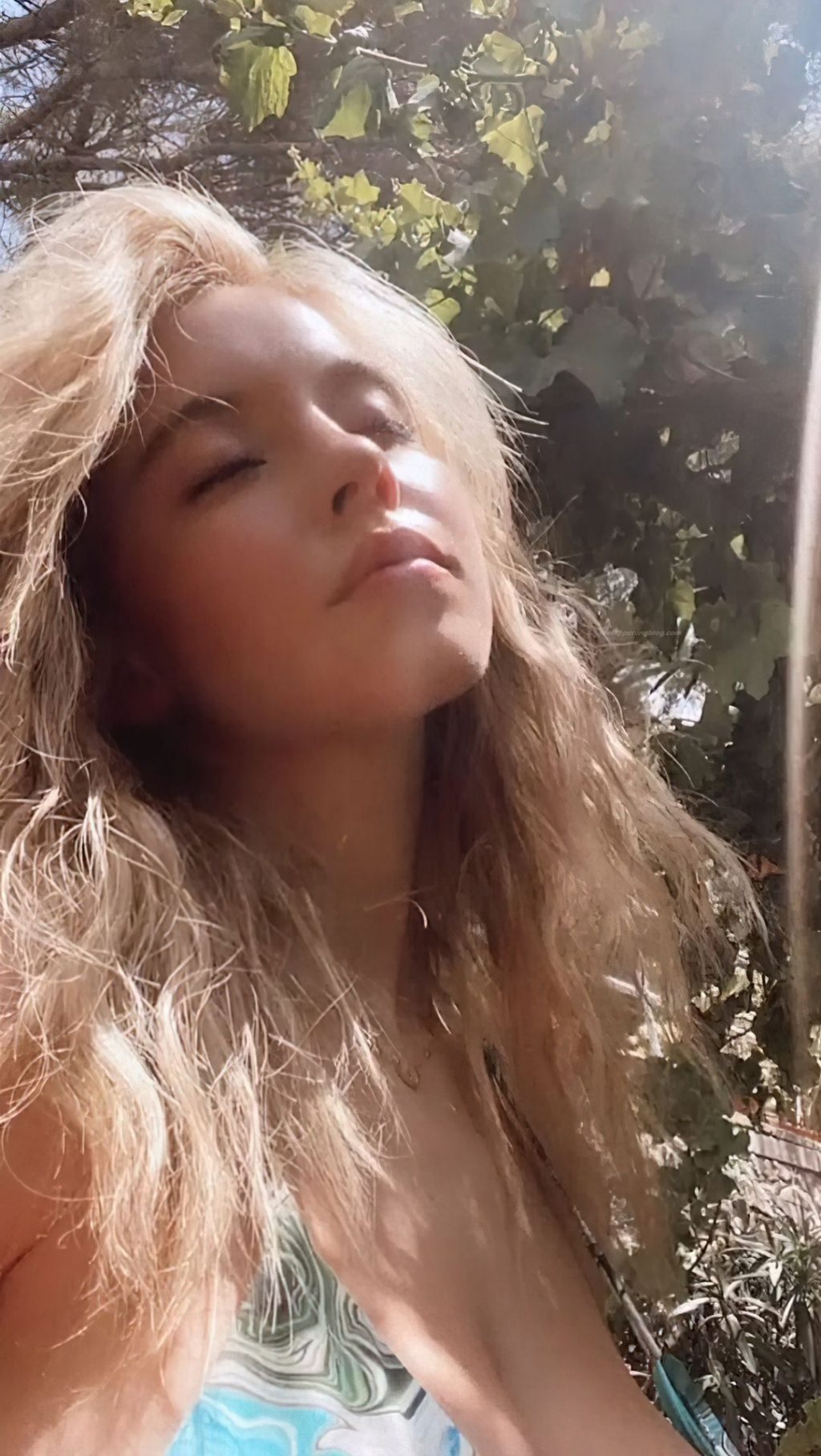 A atriz Sydney Sweeney exibe seus famosos seios grandes enquanto posa de biquíni para seus seguidores no Instagram, 08/03/2021.