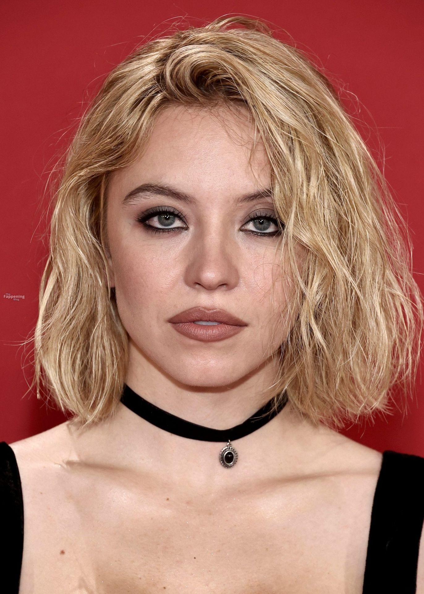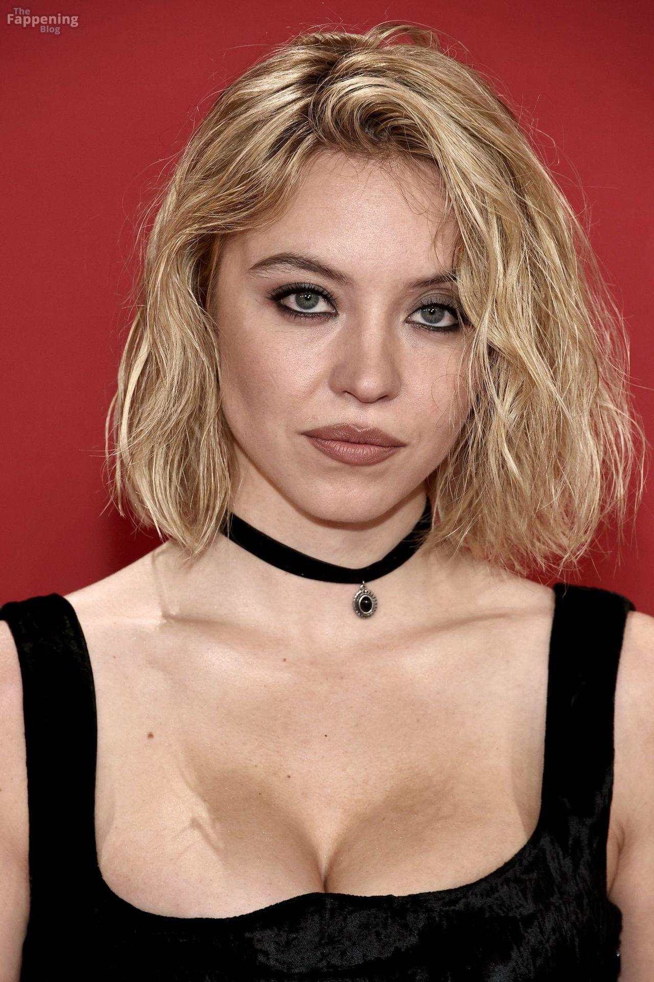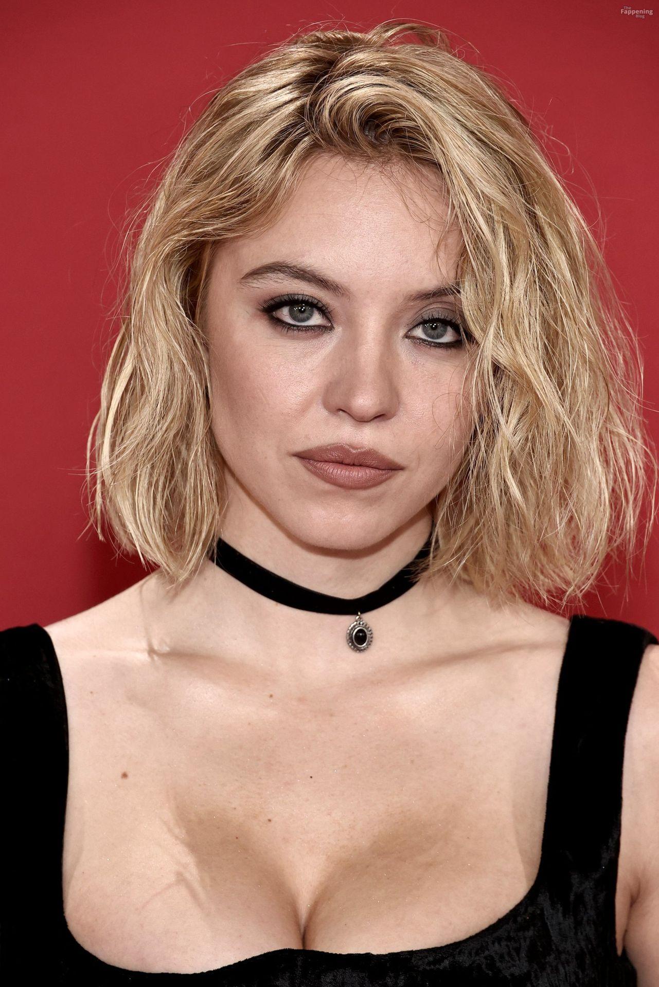 Confira os seios de Sydney Sweeney no evento GQ Men of the Year, transbordando de um vestido preto justo.