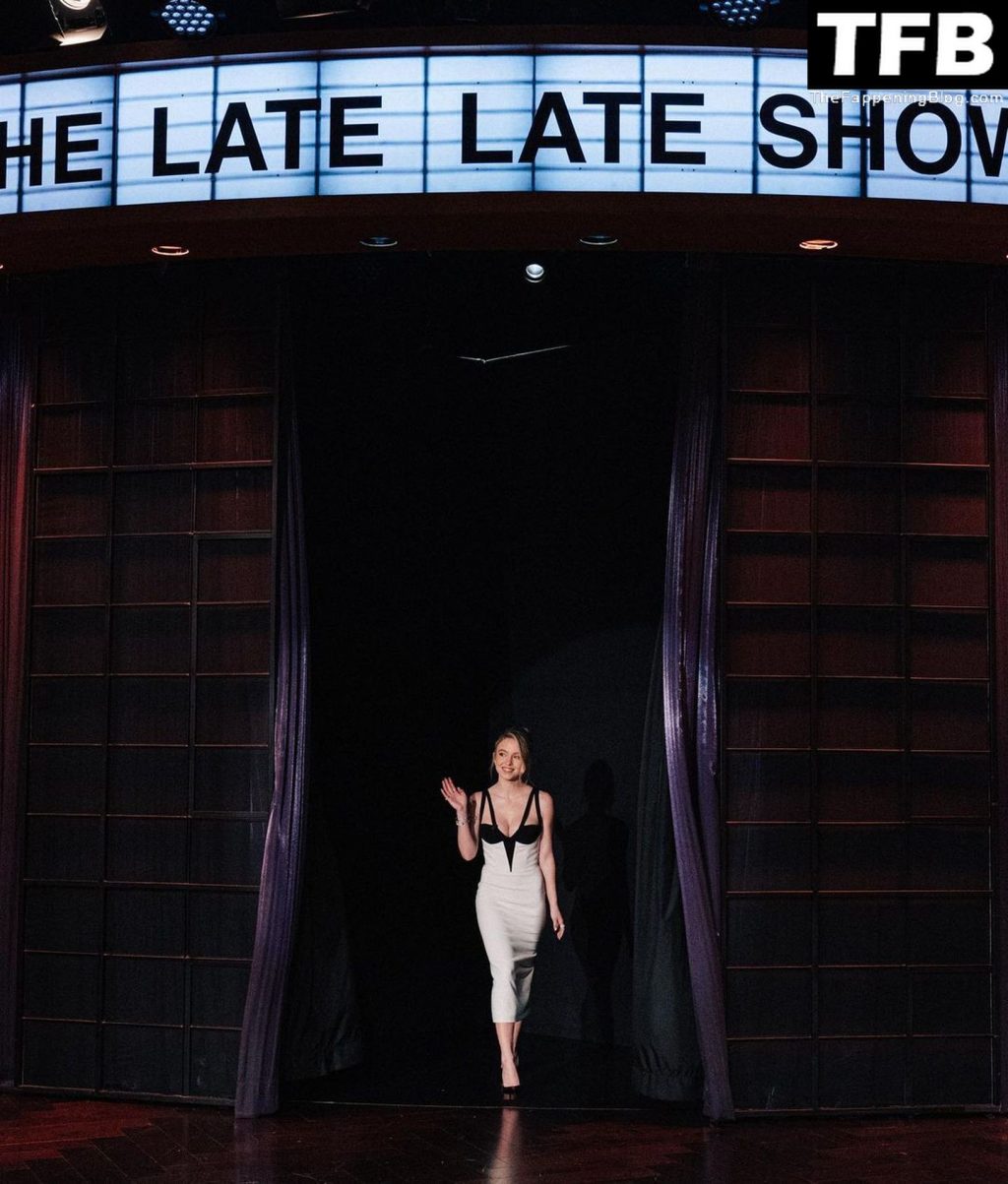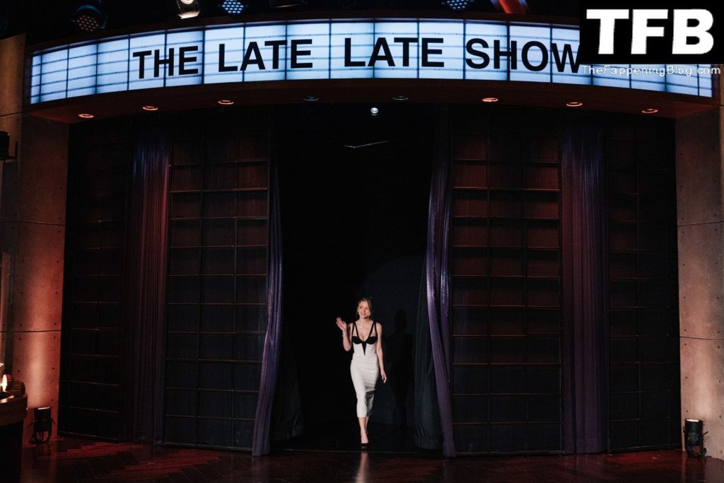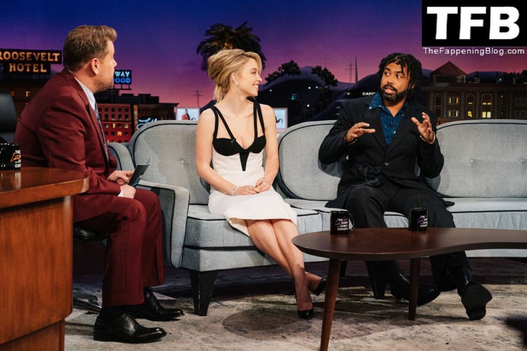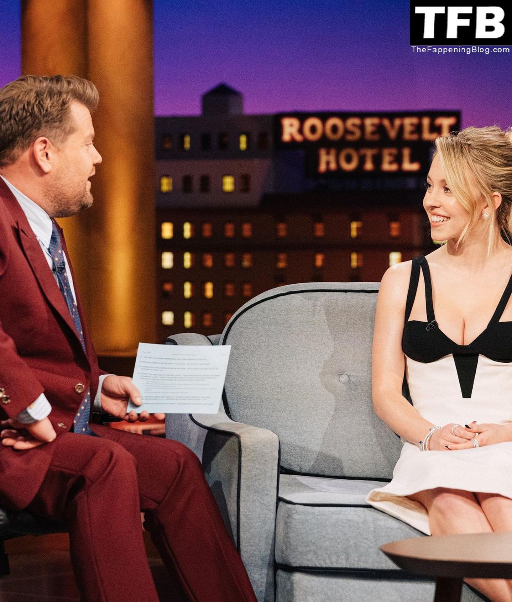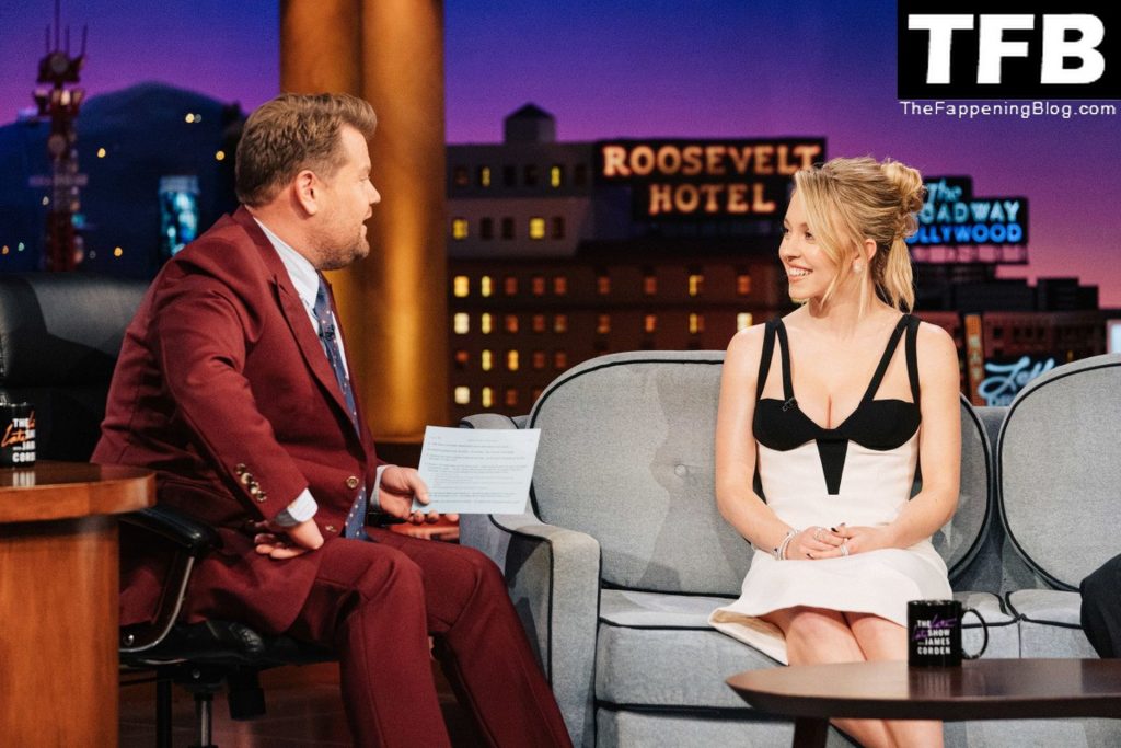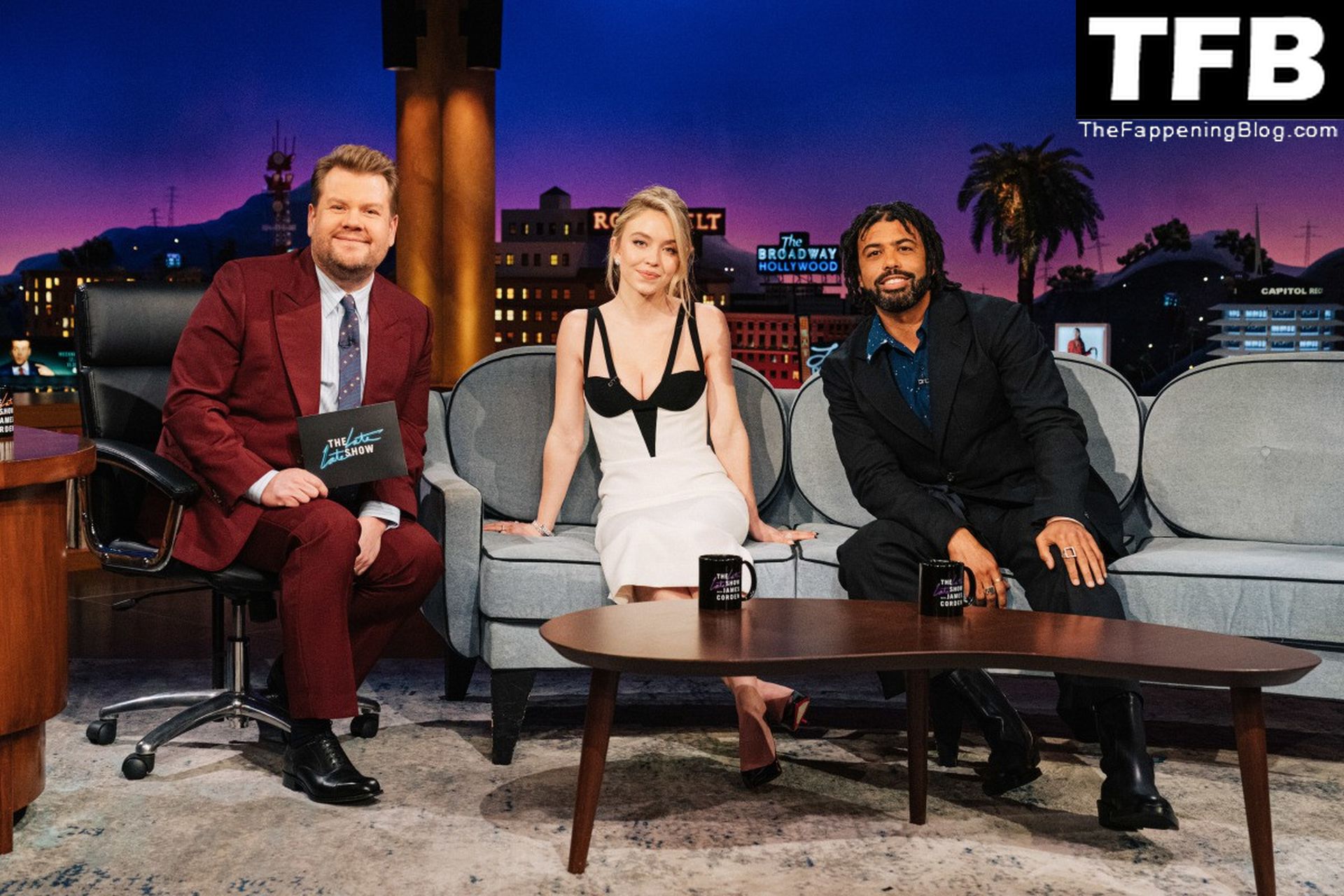 Atriz Sydney Sweeney provoca os fãs com seus seios sexy enquanto aparece com um vestido branco e preto no programa ‘The Late Late Show with James Corden’ em Los Angeles, 26/01/2022.