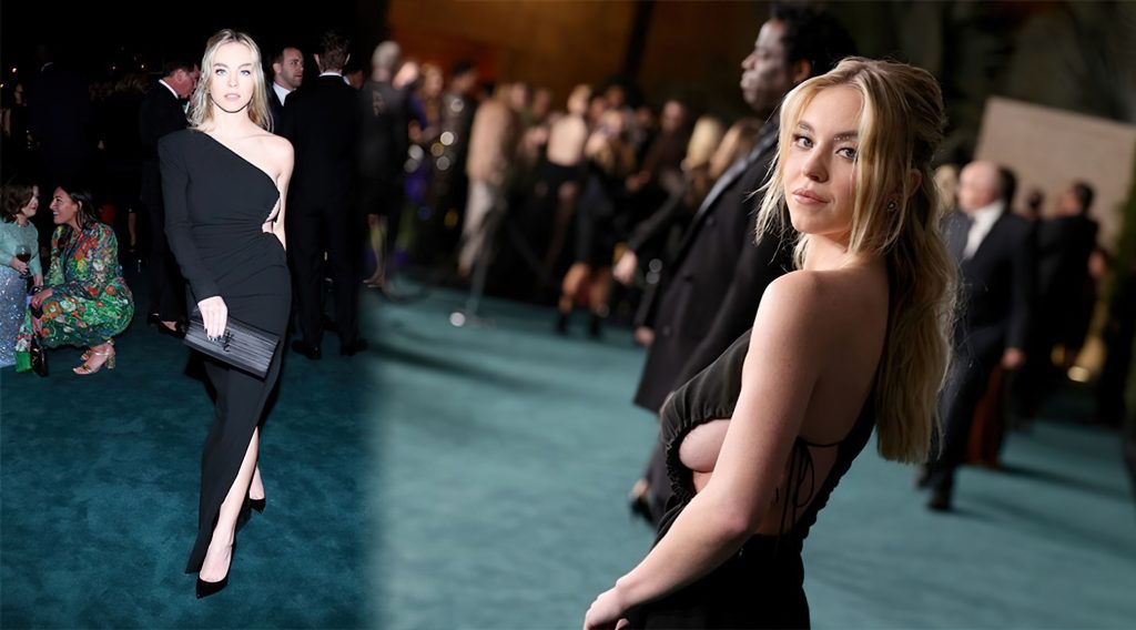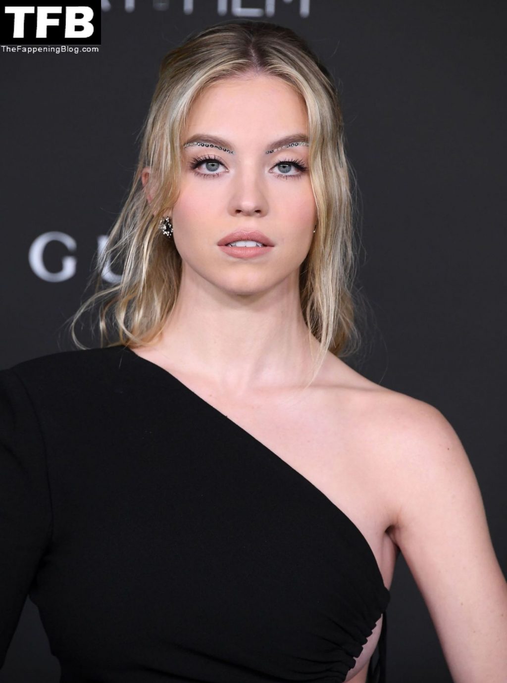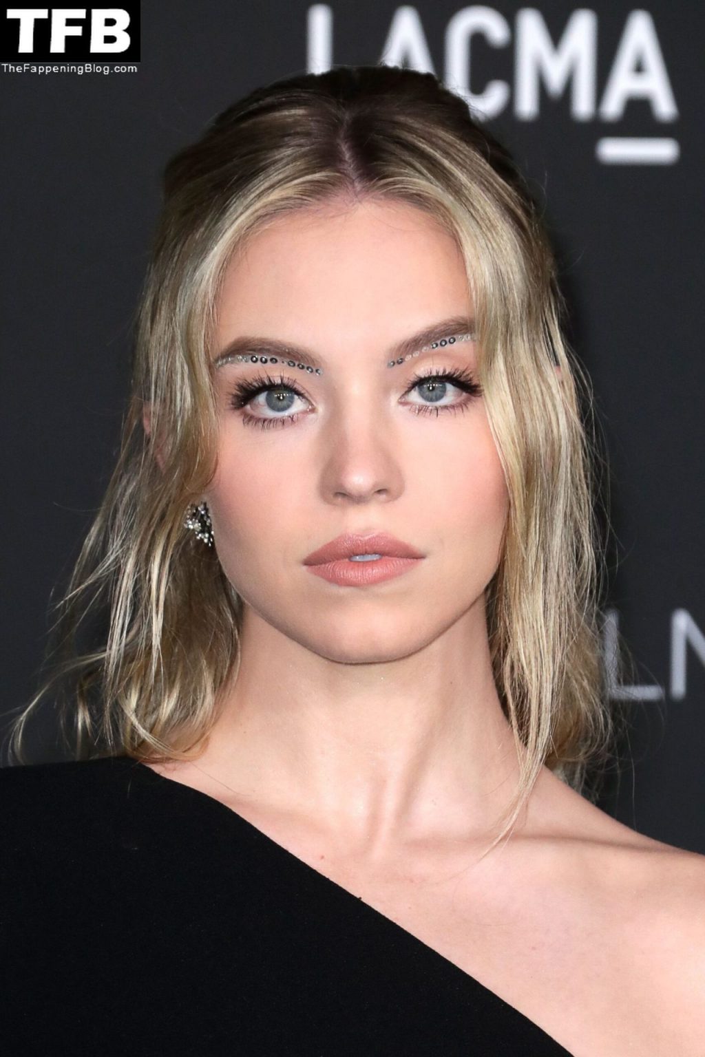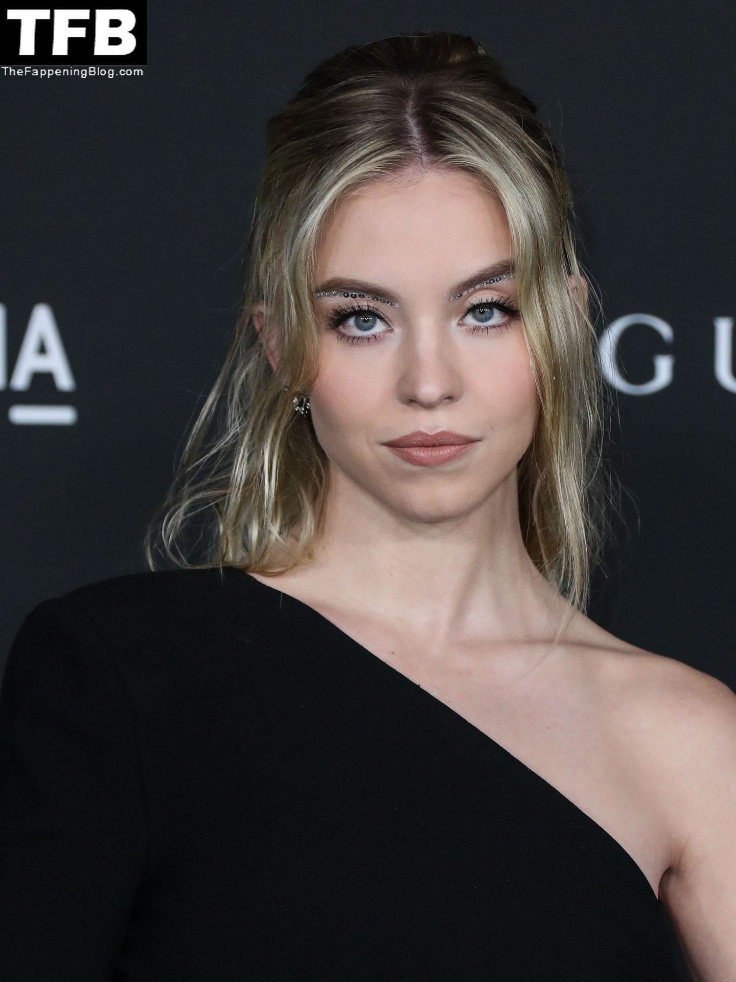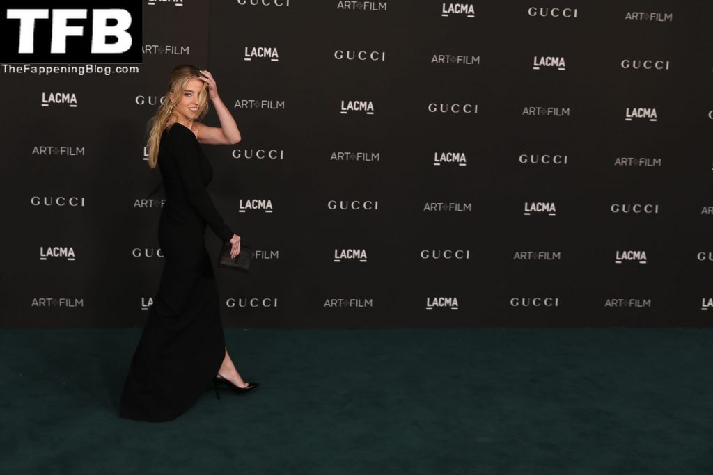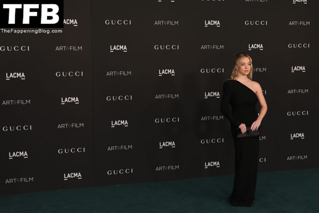 A atriz Sydney Sweeney posa com um vestido preto de um ombro só no 10º Gala Anual LACMA ART+FILM em Los Angeles, 06/11/2021.