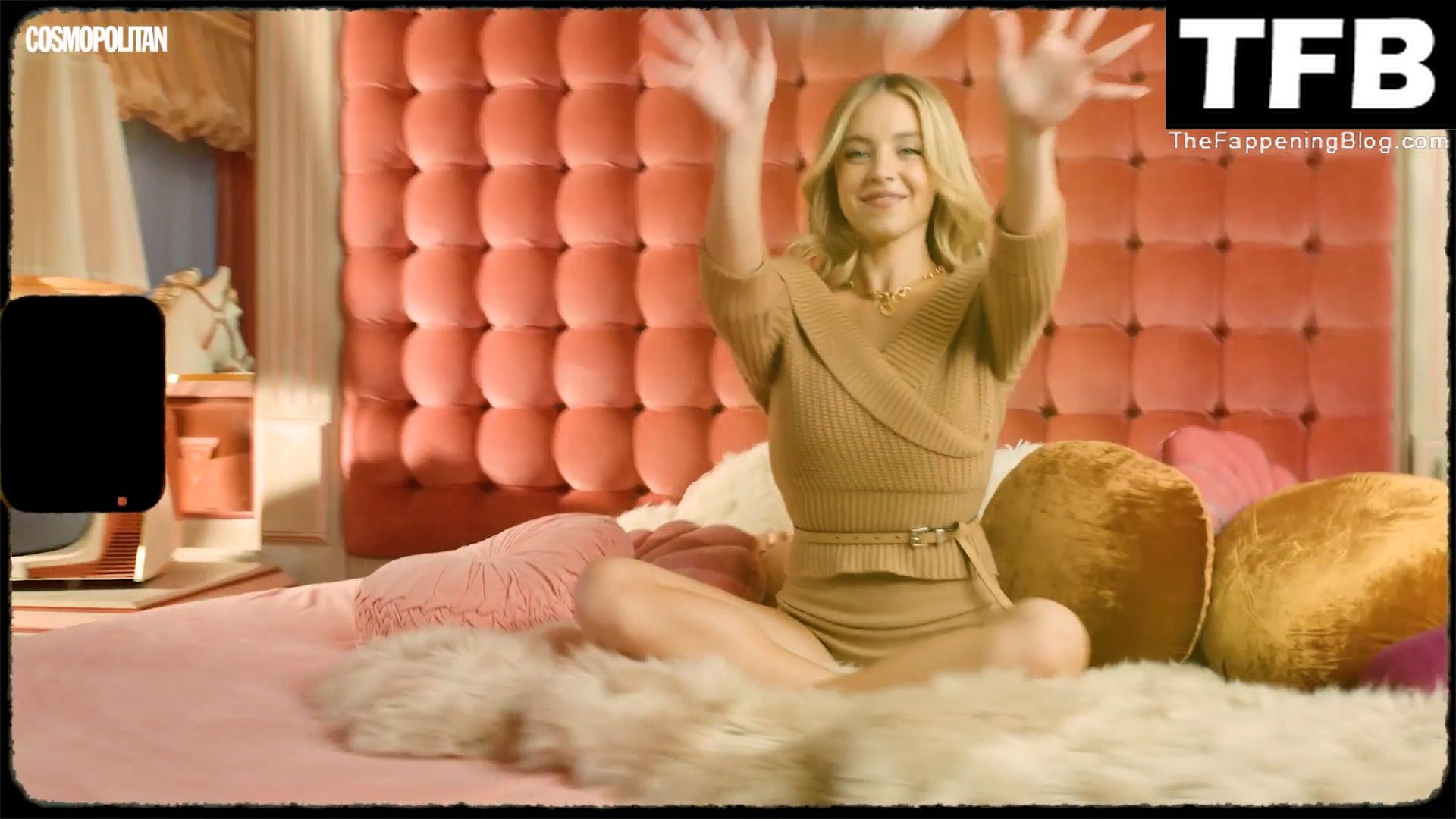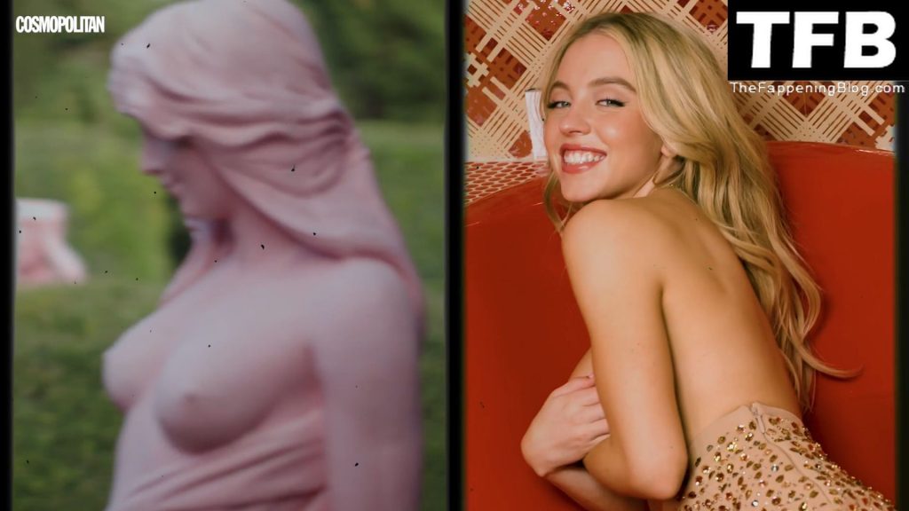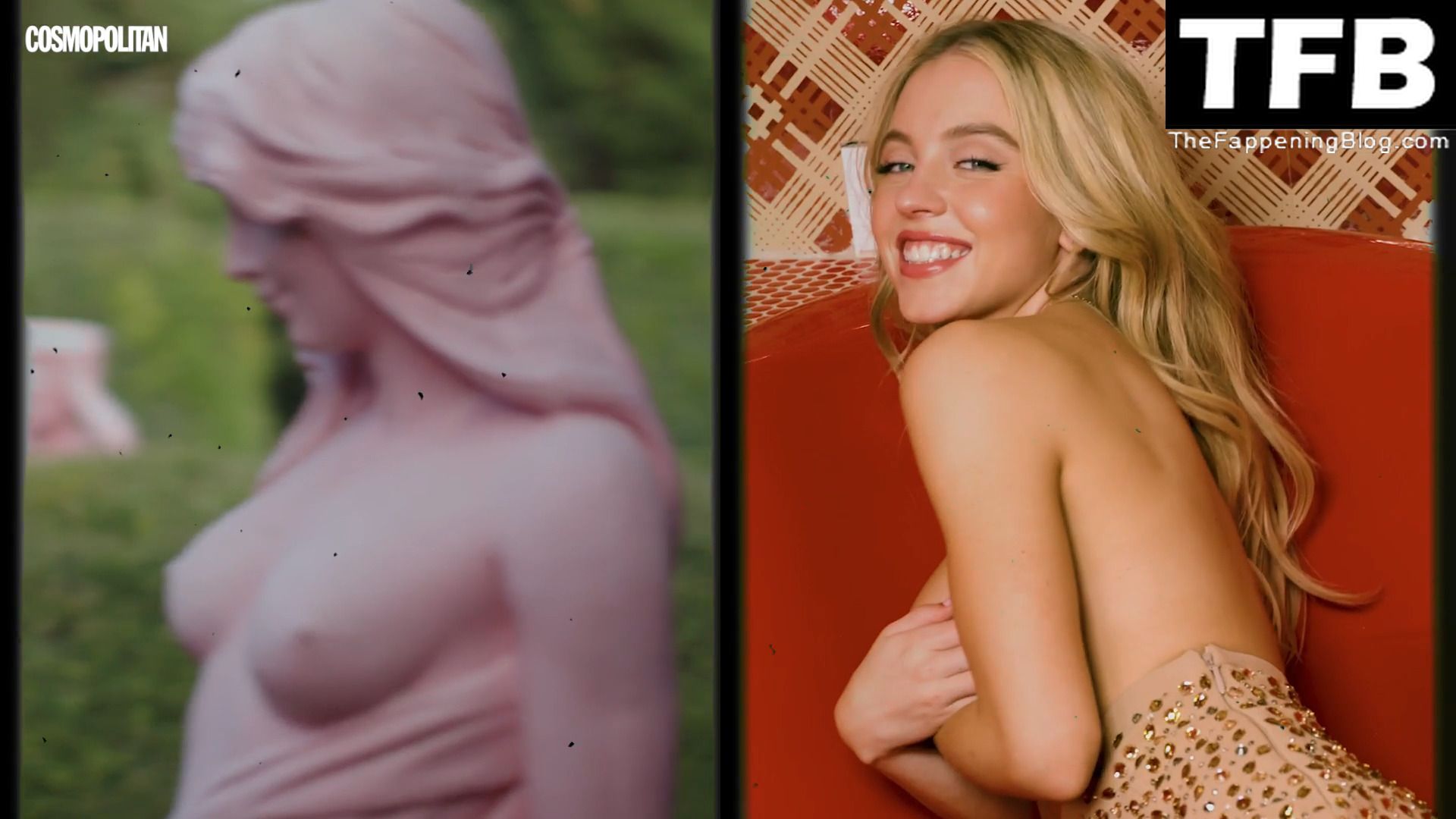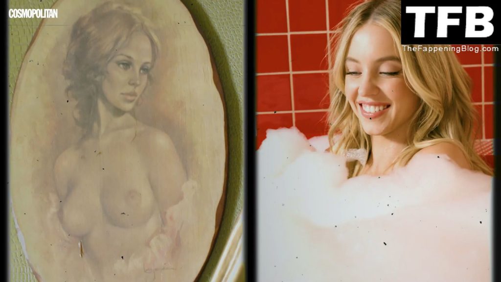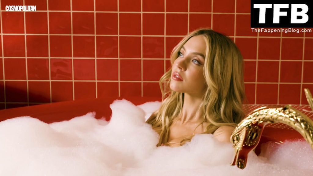 A atriz Sydney Sweeney fica topless enquanto usa uma calcinha de strass brilhante em um ensaio na banheira retrô para a Cosmopolitan (2022).