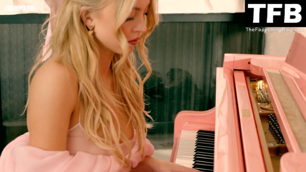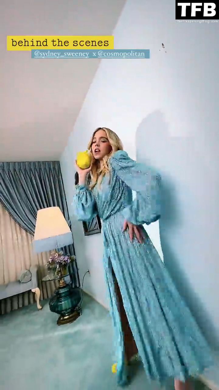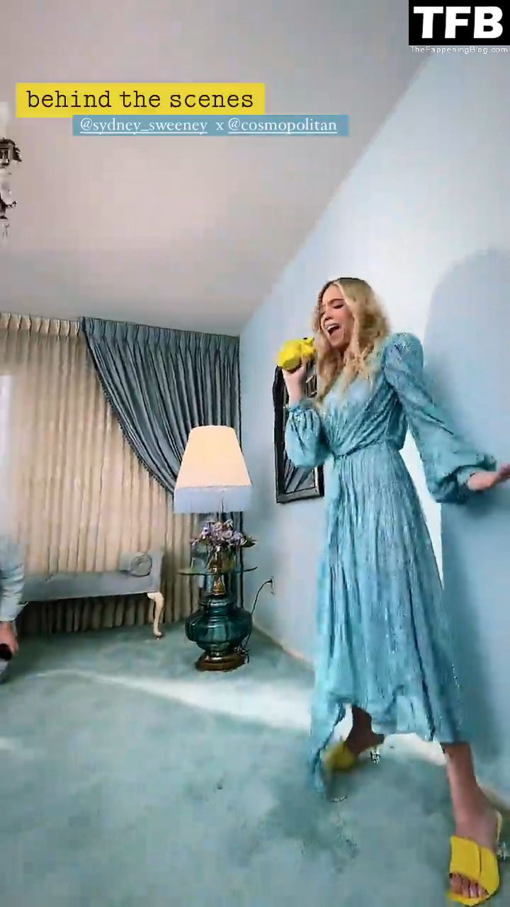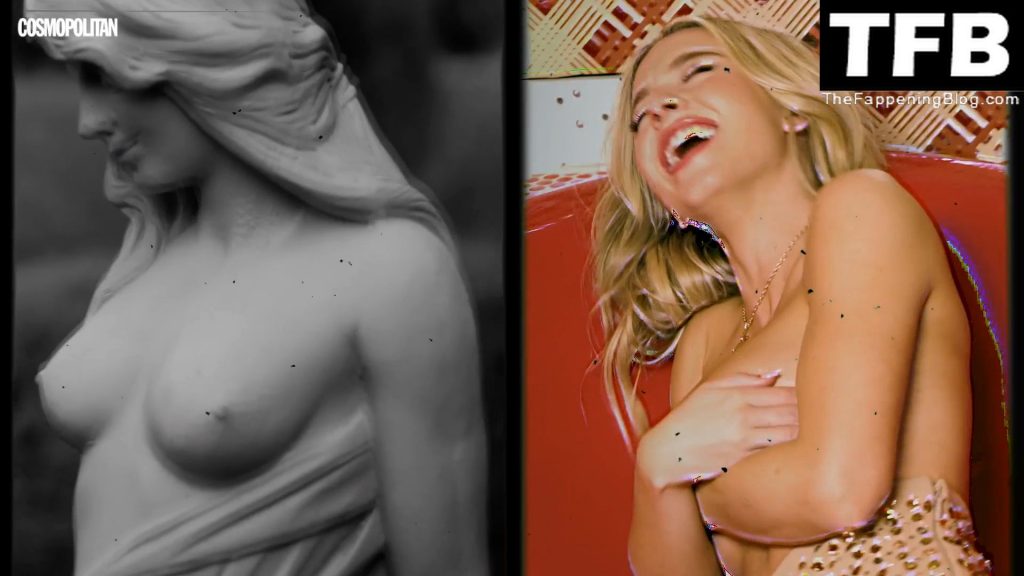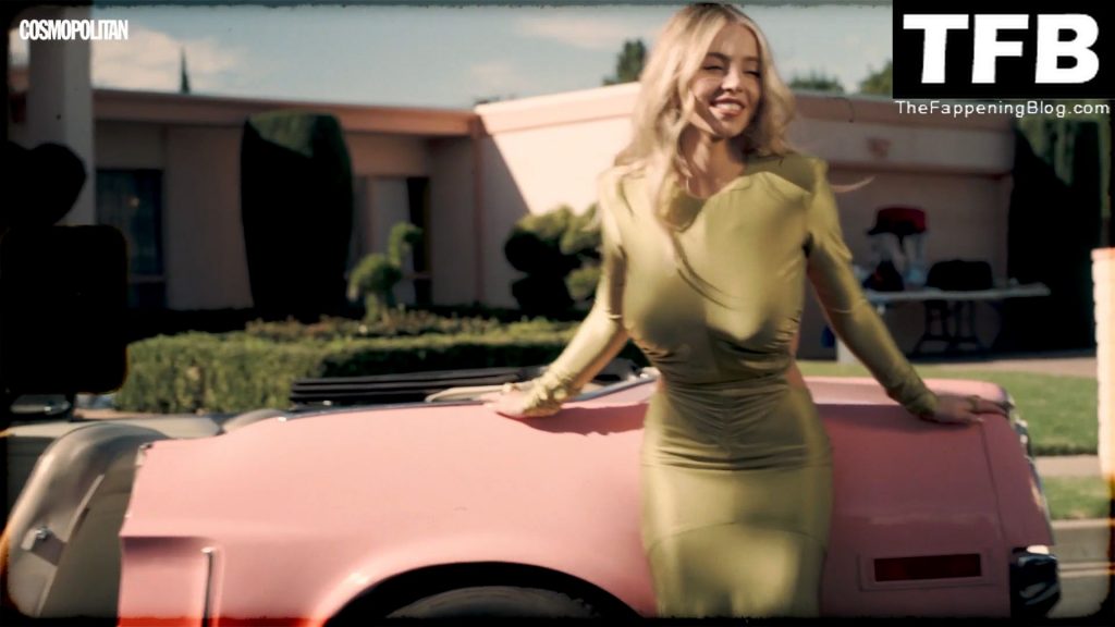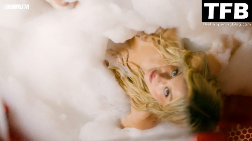 A atriz Sydney Sweeney fica topless enquanto usa uma calcinha de strass brilhante em um ensaio na banheira retrô para a Cosmopolitan (2022).
