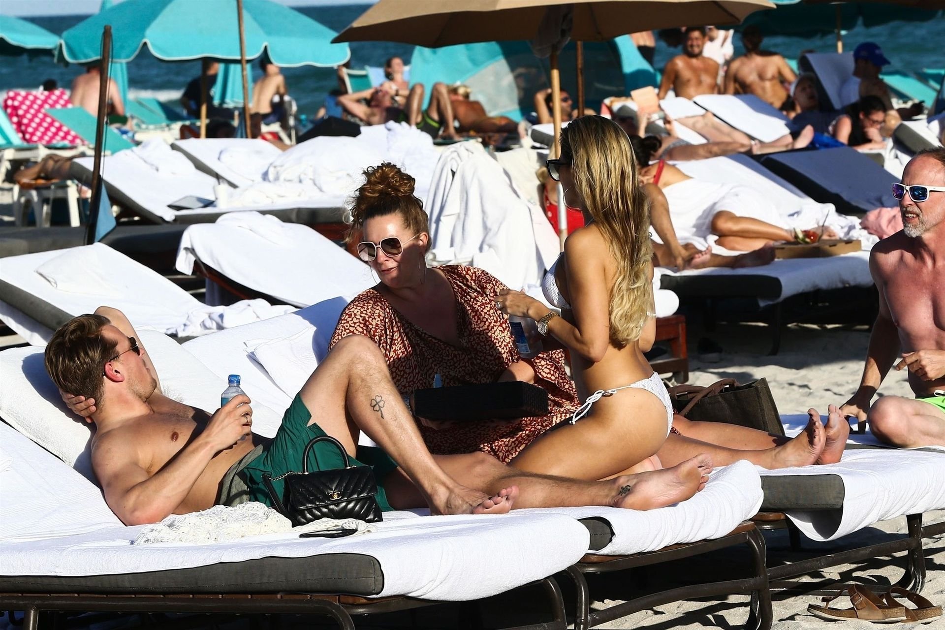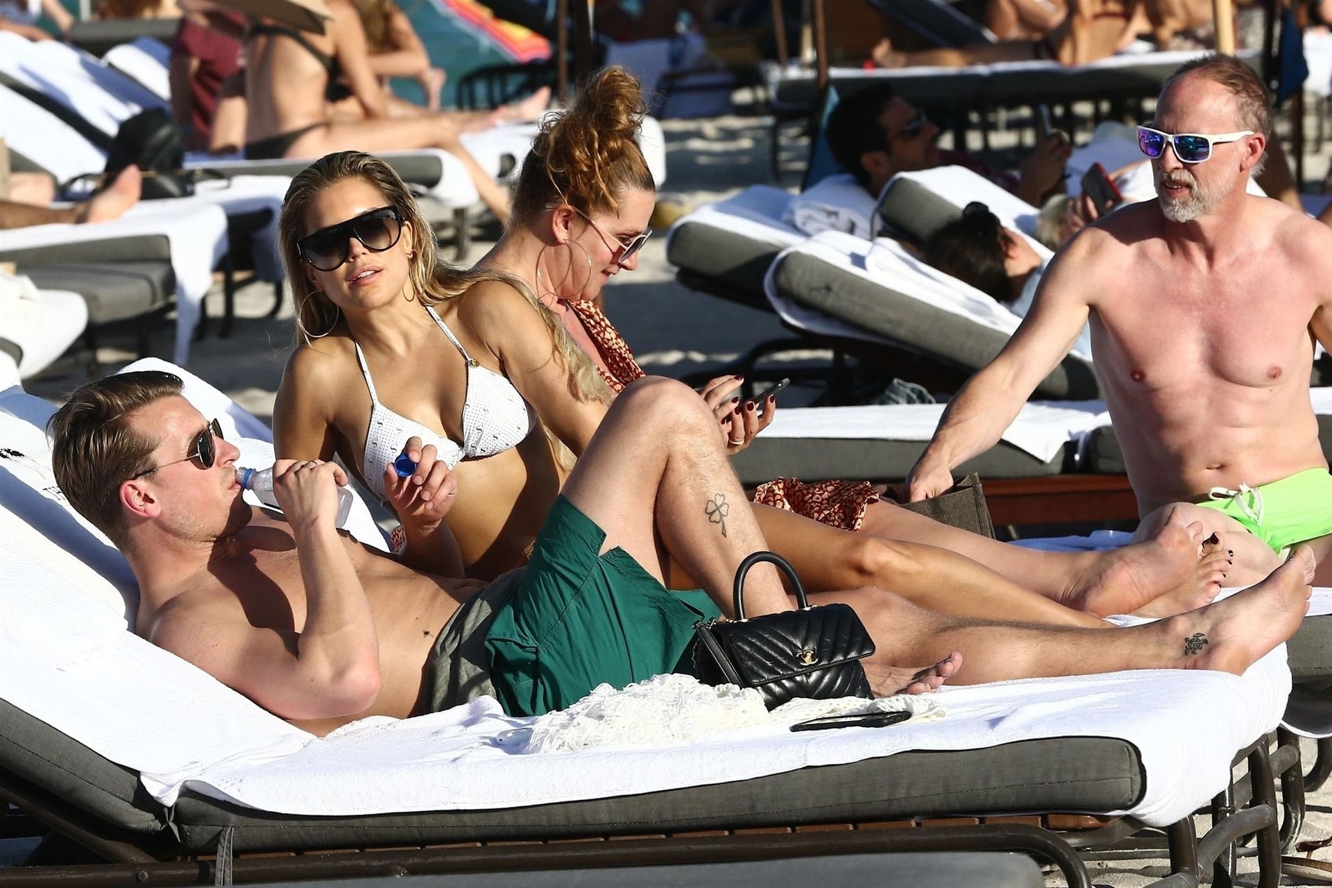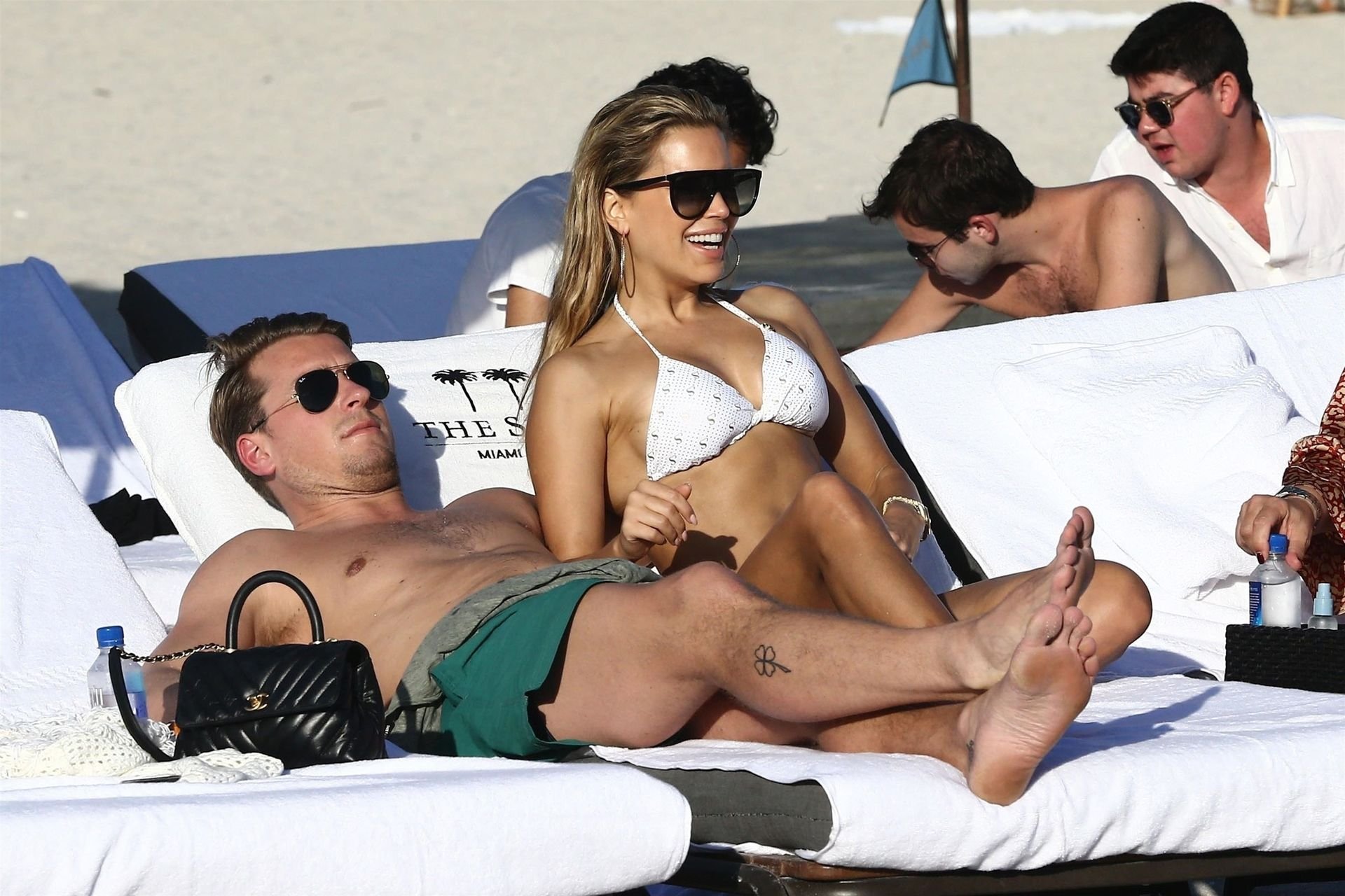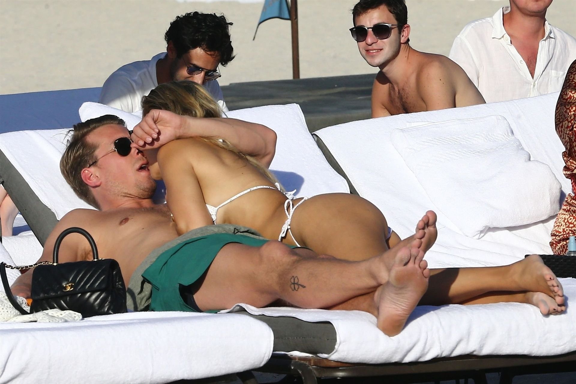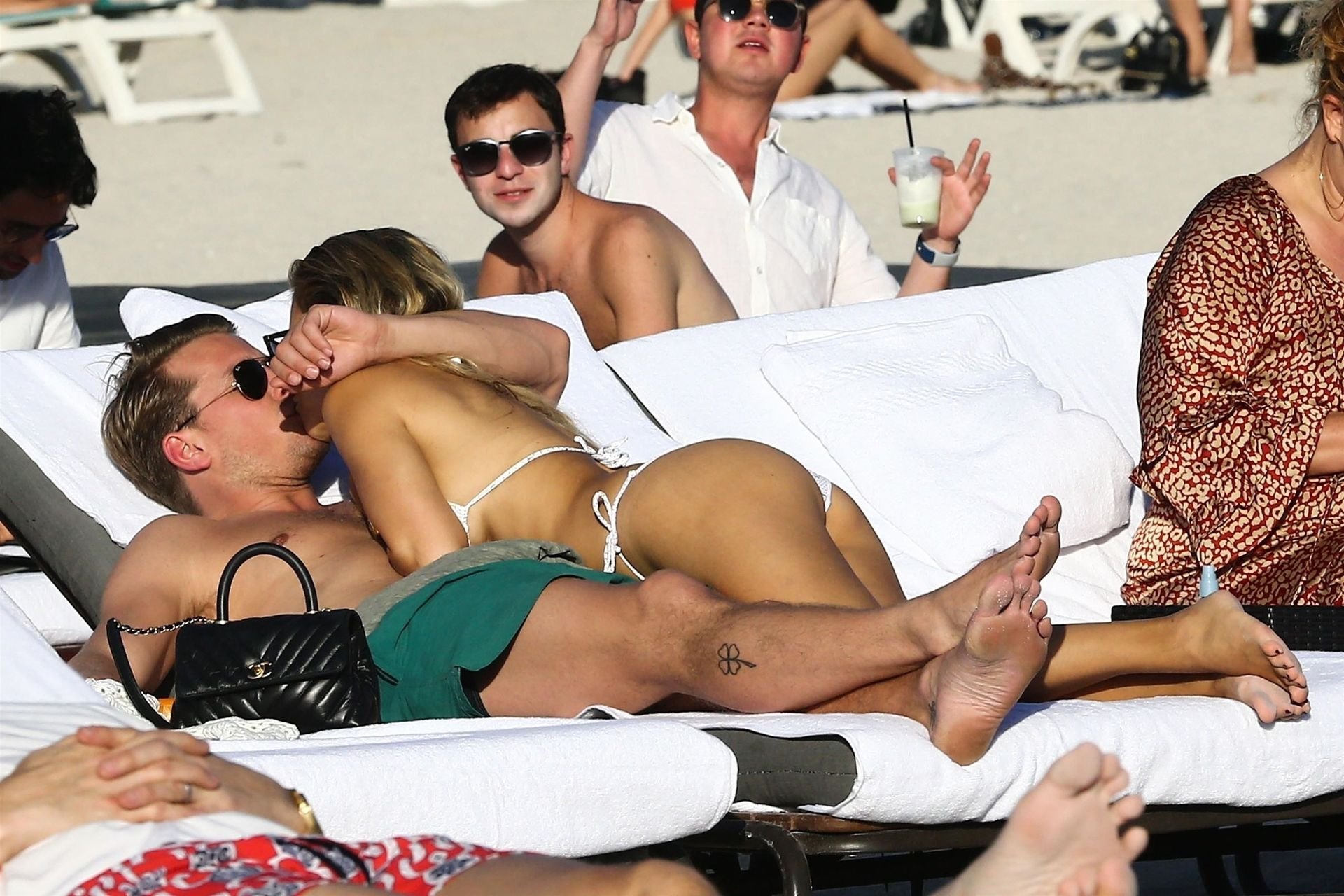 Sylvie Meis usa um biquíni branco revelador enquanto envolve suas pernas ao redor do namorado Bart Willemsen durante uma sessão de maquiagem quente na praia em Miami no Dia de Ano Novo, 01/01/2019.