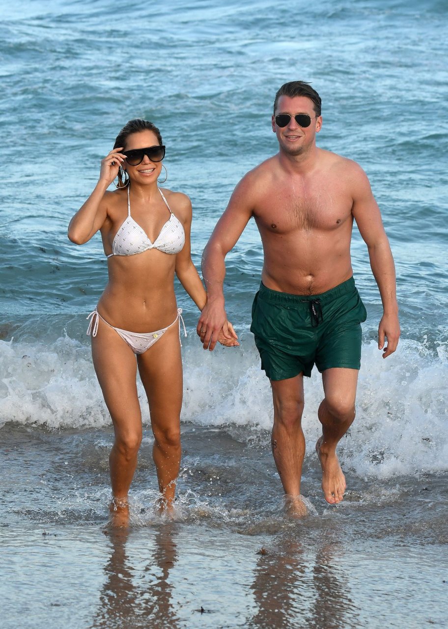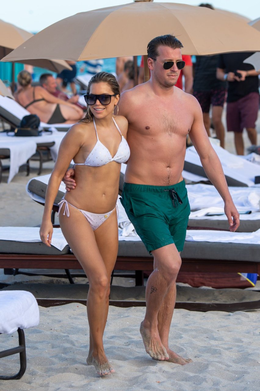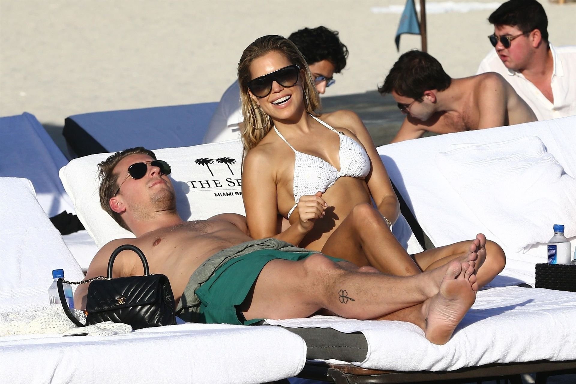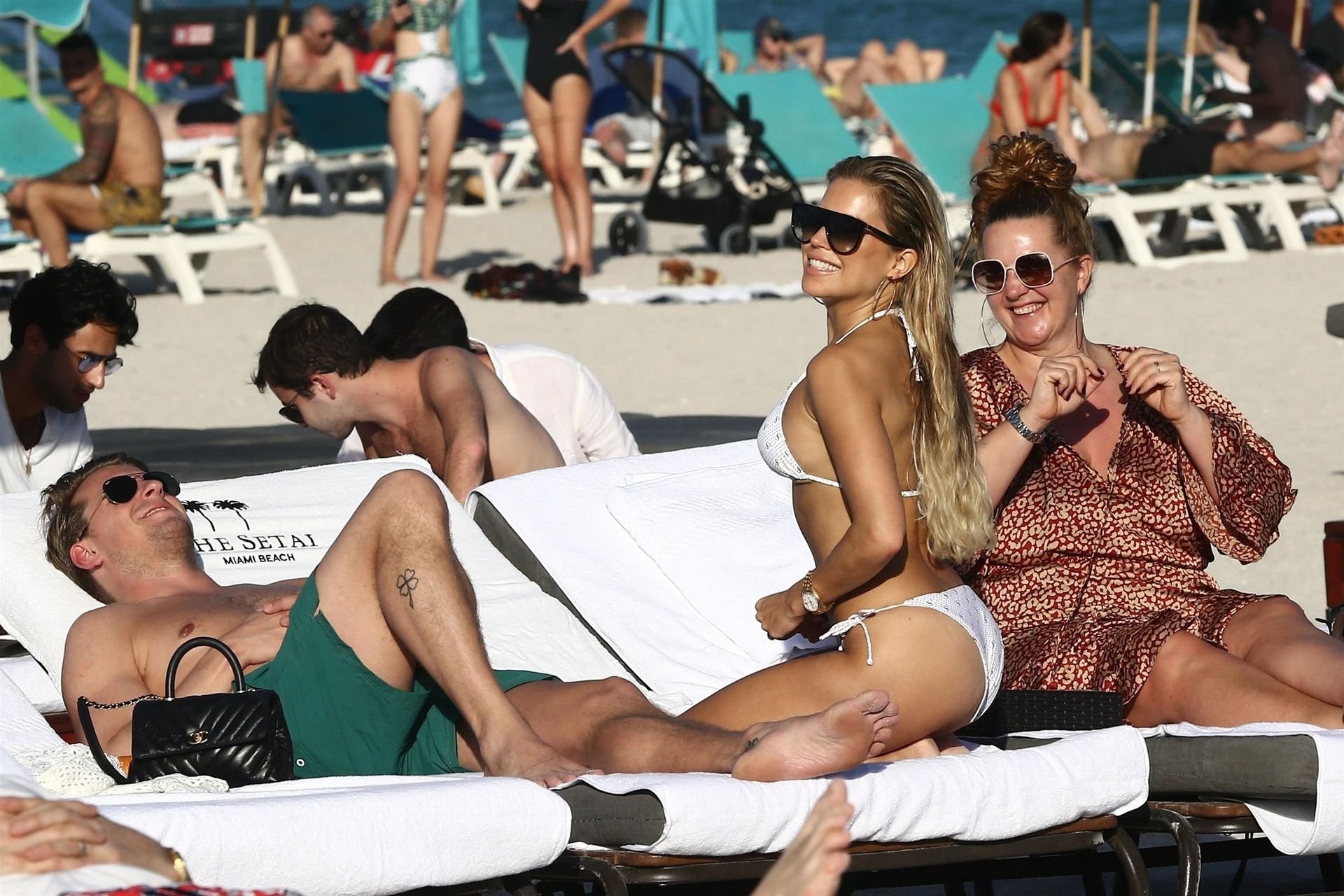Sylvie Meis usa um biquíni branco revelador enquanto envolve suas pernas ao redor do namorado Bart Willemsen durante uma sessão de maquiagem quente na praia em Miami no Dia de Ano Novo, 01/01/2019.
