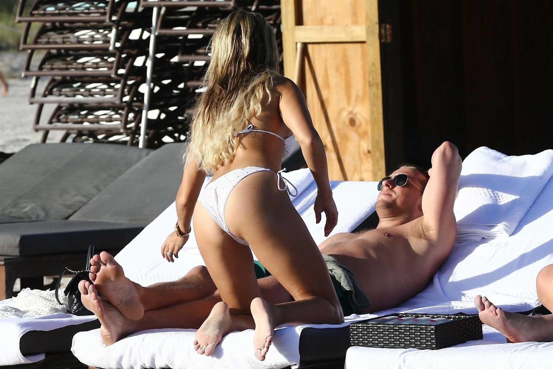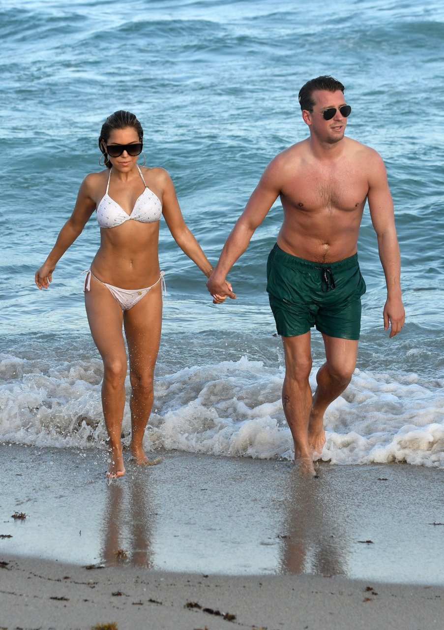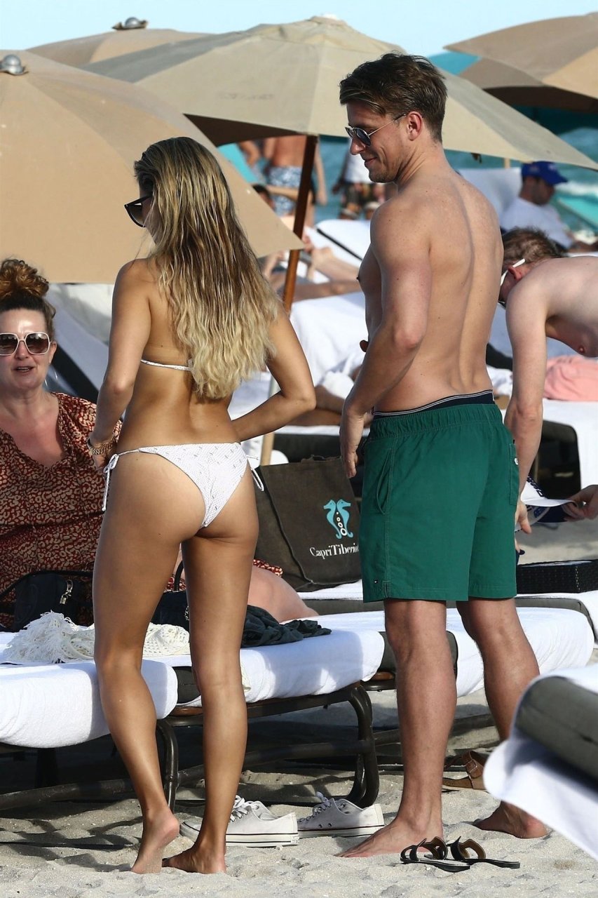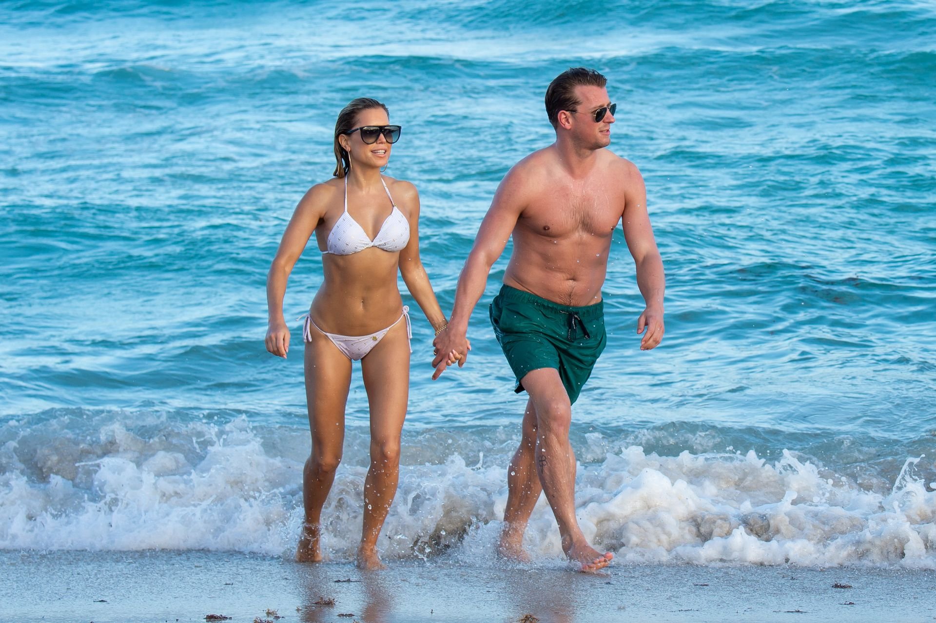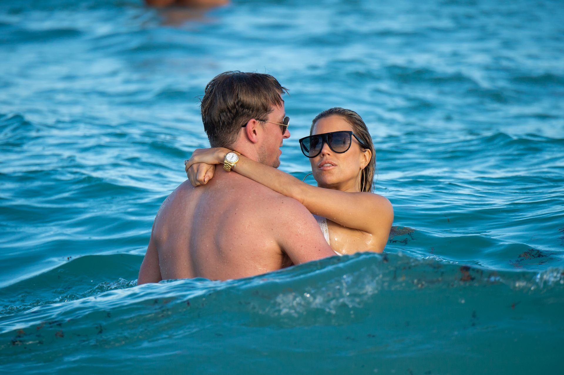 Sylvie Meis usa um biquíni branco revelador enquanto envolve suas pernas ao redor do namorado Bart Willemsen durante uma sessão de maquiagem quente na praia em Miami no Dia de Ano Novo, 01/01/2019.