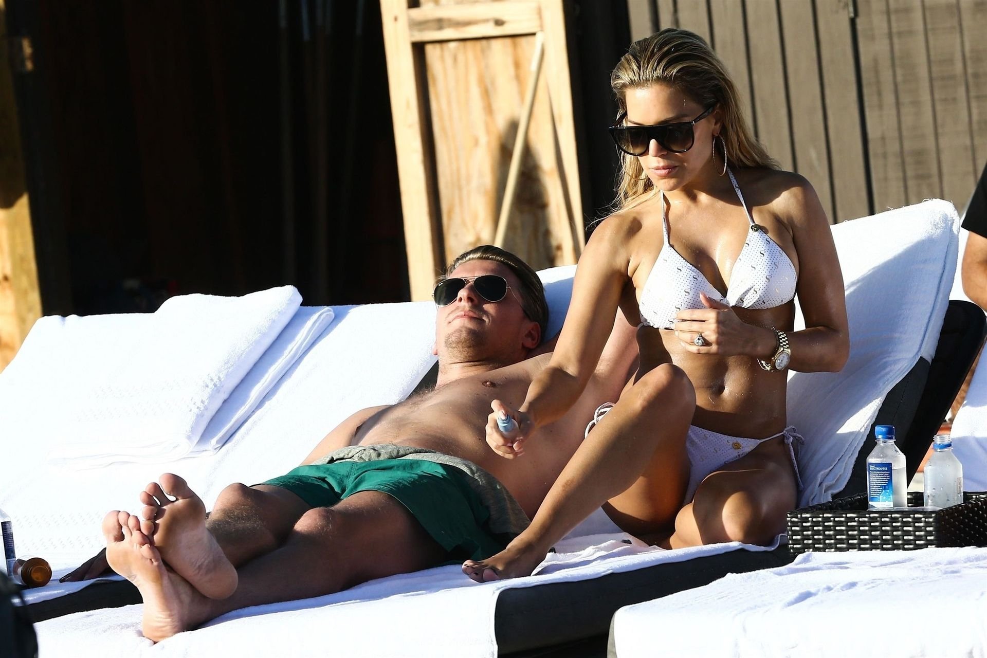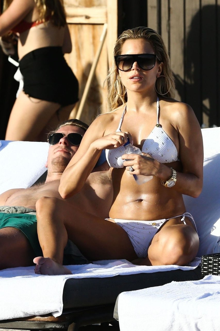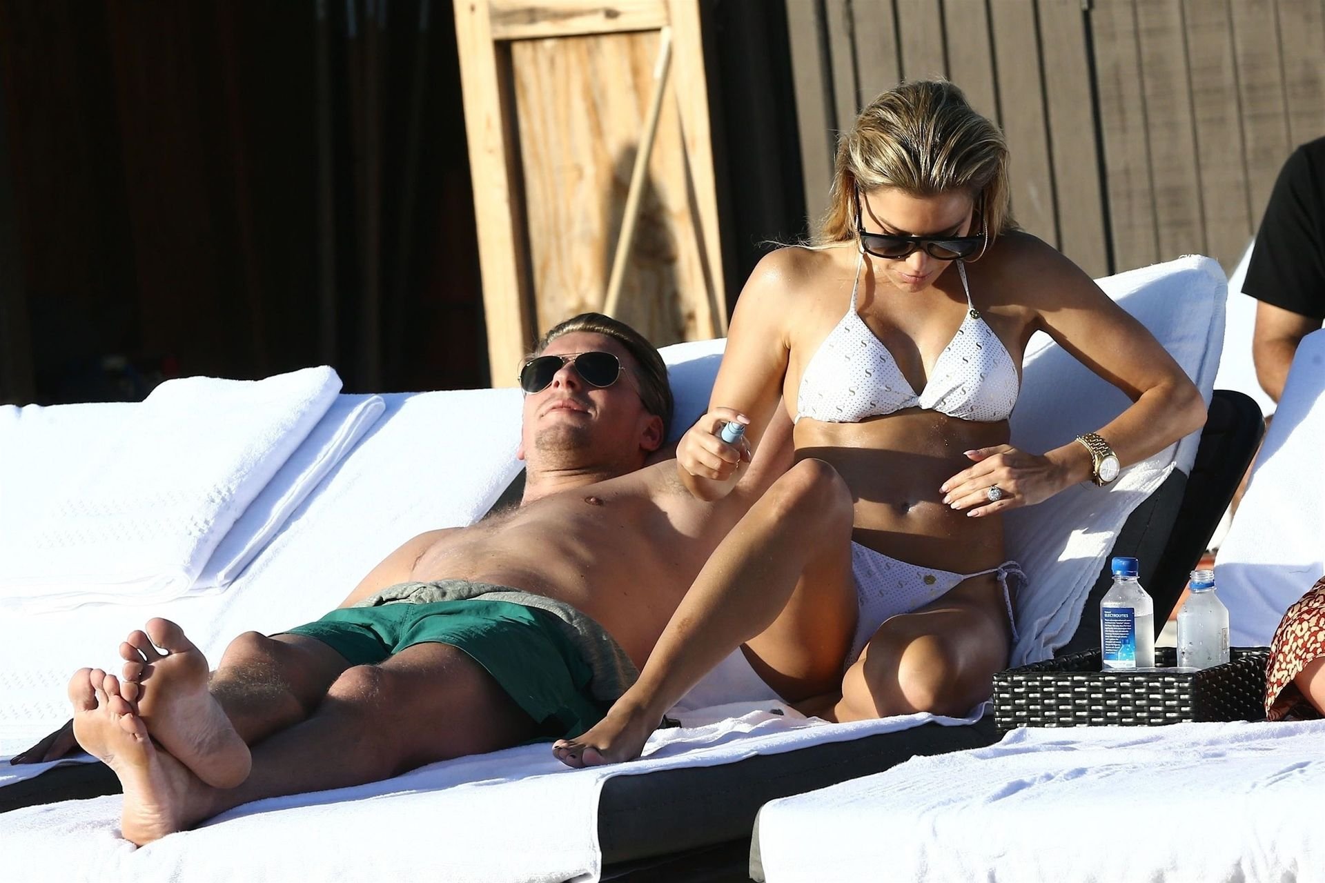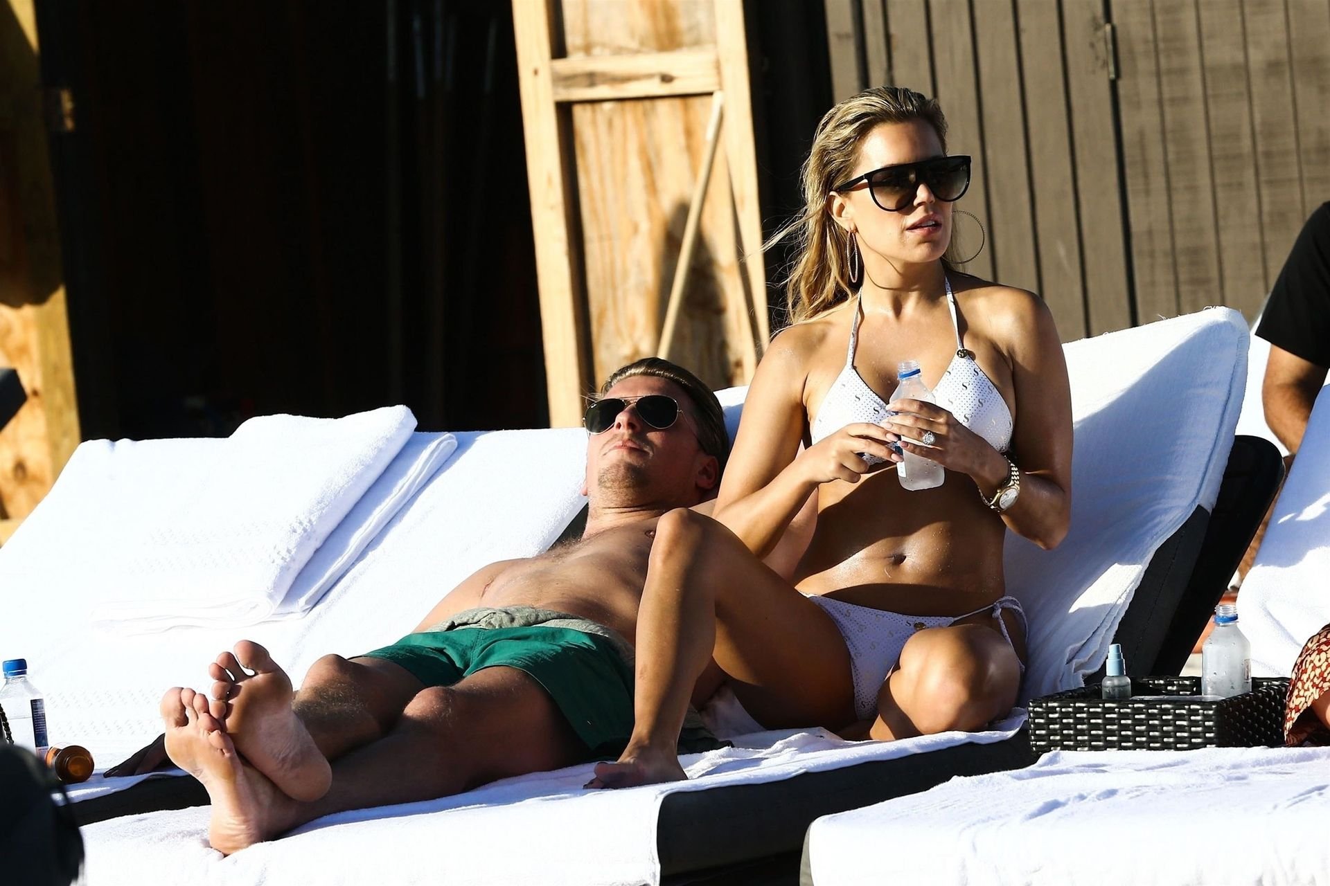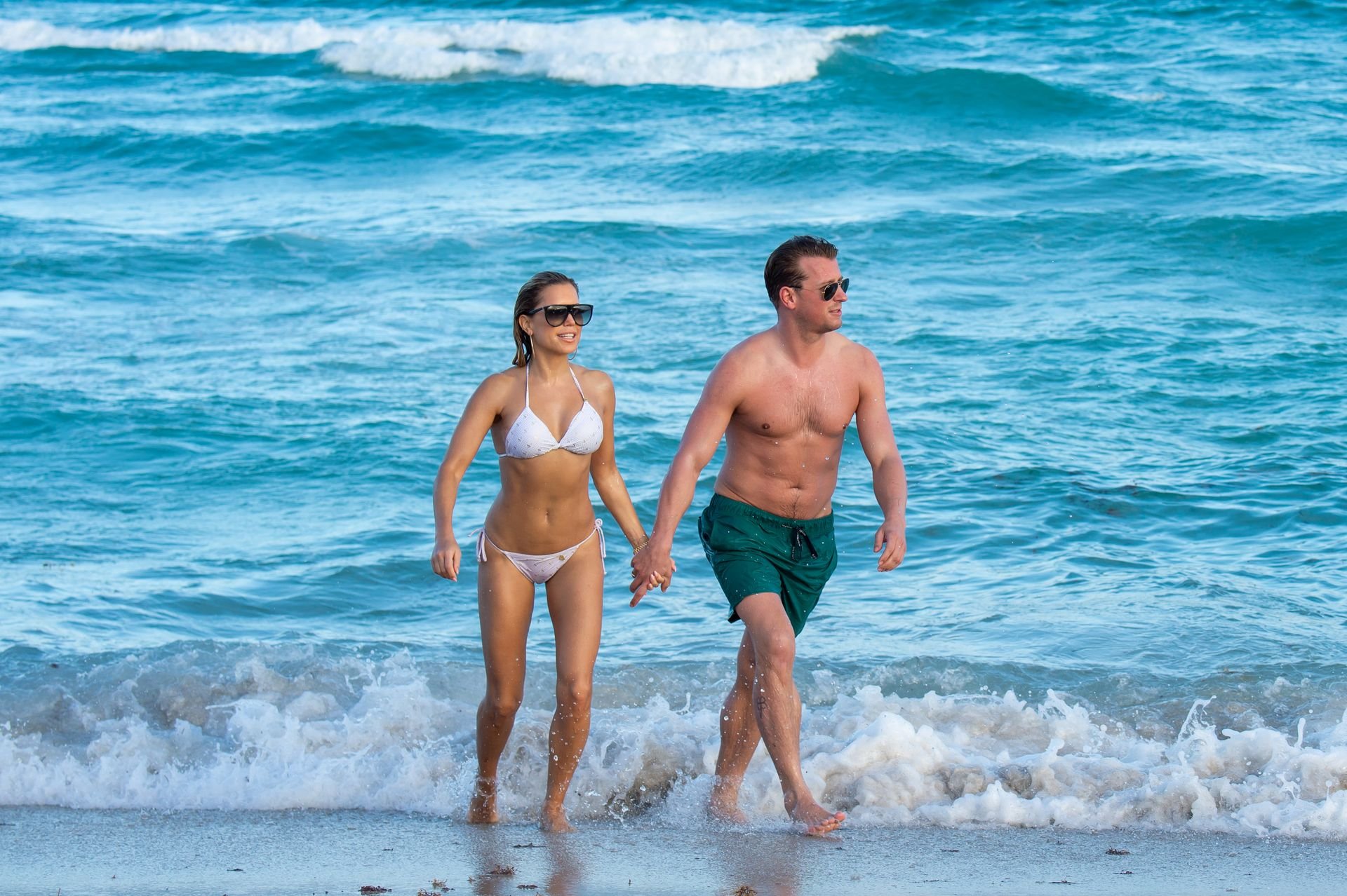 Sylvie Meis usa um biquíni branco revelador enquanto envolve suas pernas ao redor do namorado Bart Willemsen durante uma sessão de maquiagem quente na praia em Miami no Dia de Ano Novo, 01/01/2019.