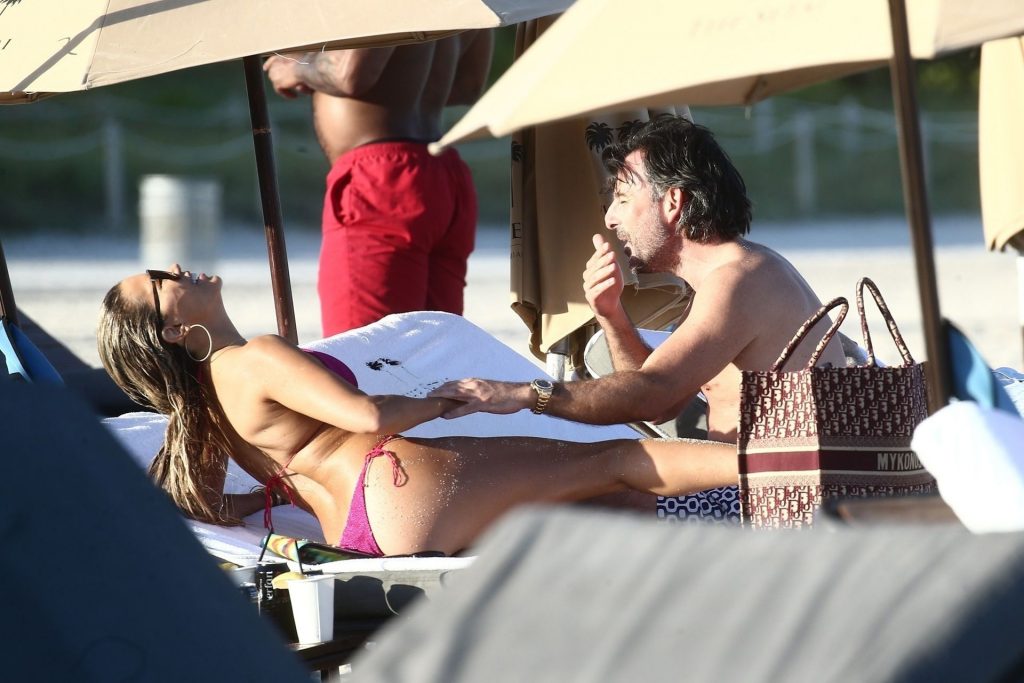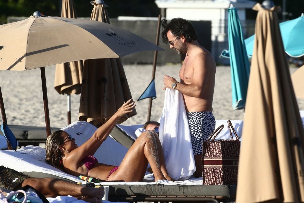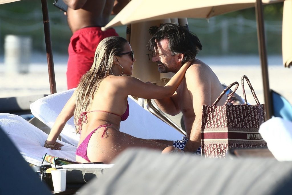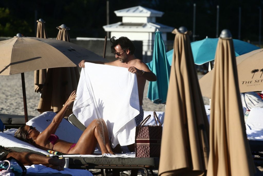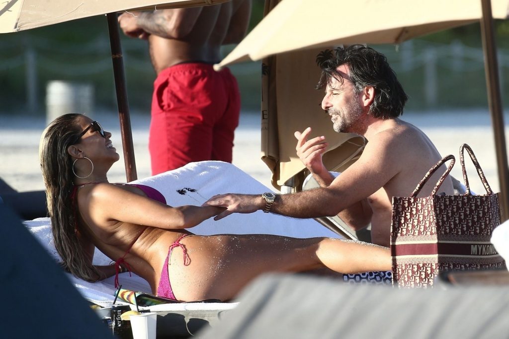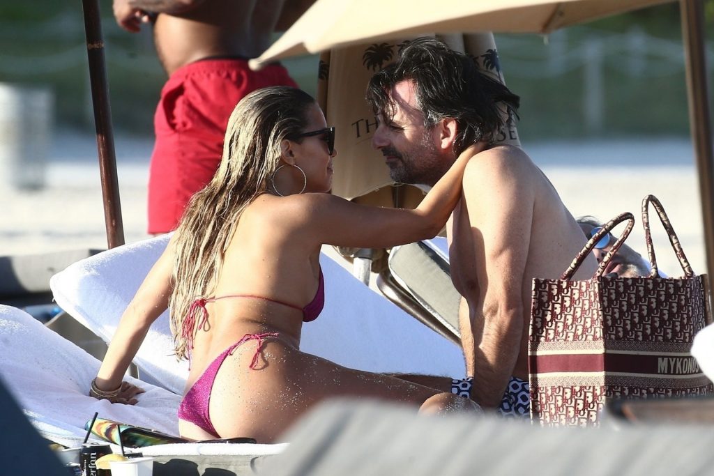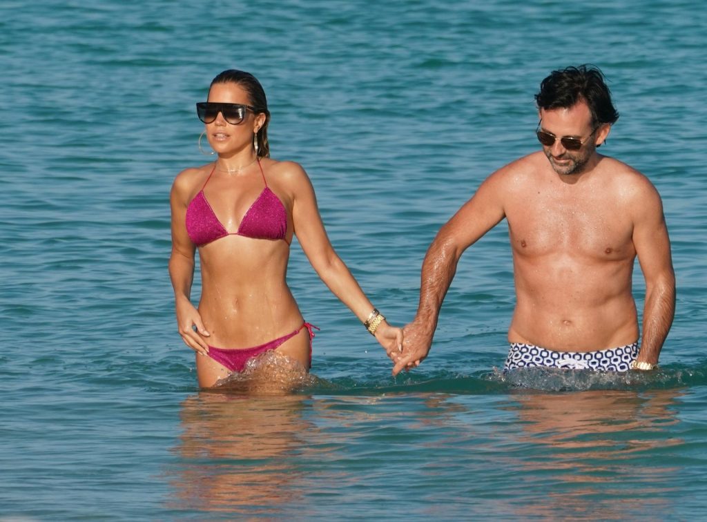 Sylvie Meis, 41, foi fotografada de biquíni roxo na praia em Miami Beach, 12/02/2019. Sylvie deu um mergulho no oceano com seu noivo e aproveitou o sol nas praias de Miami.