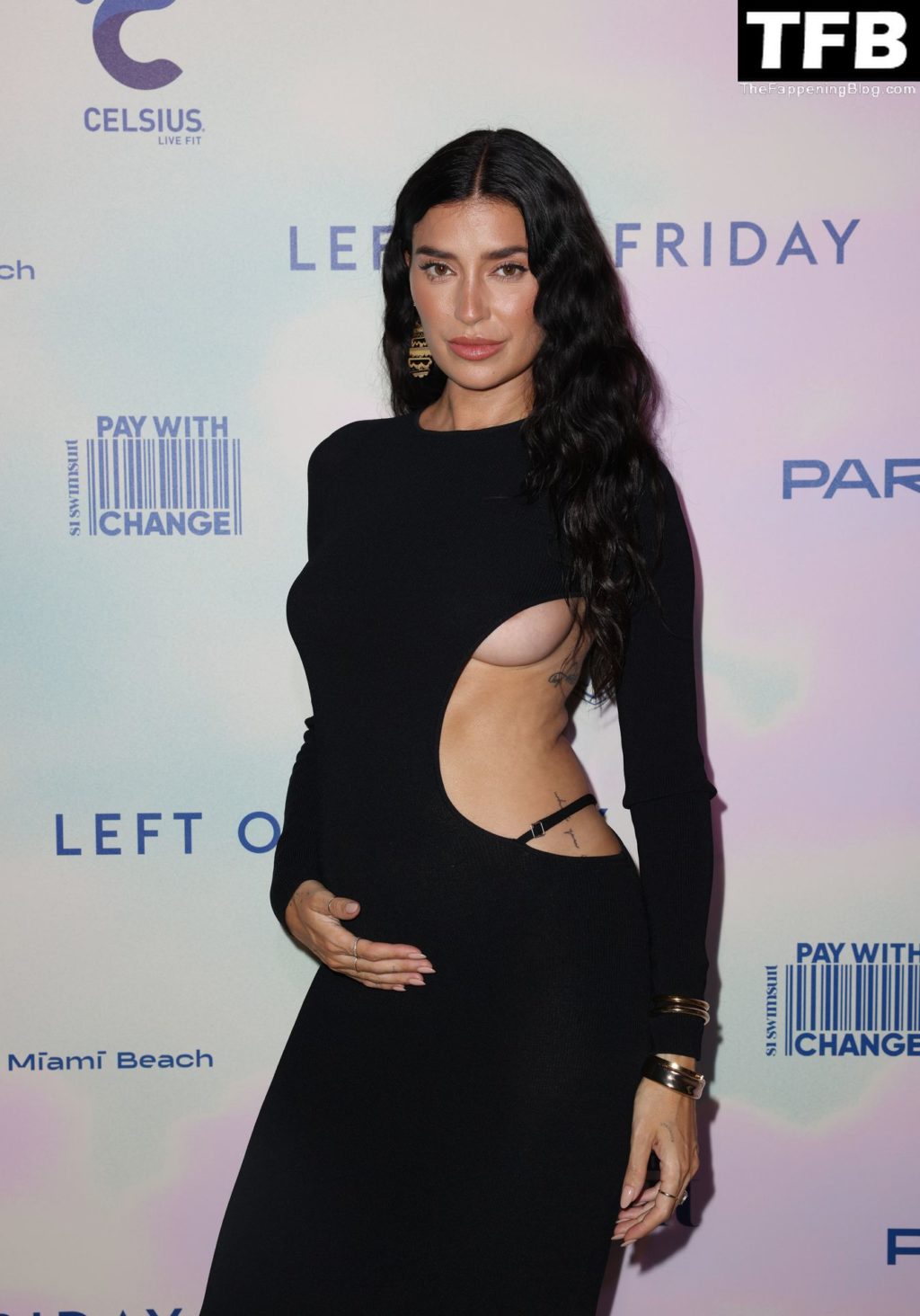 Modelo sem sutiã Nicole Williams English chega ao desfile de moda praia da Sports Illustrated durante o Paraiso Miami Beach em Miami Beach, Flórida, 16/07/2022.