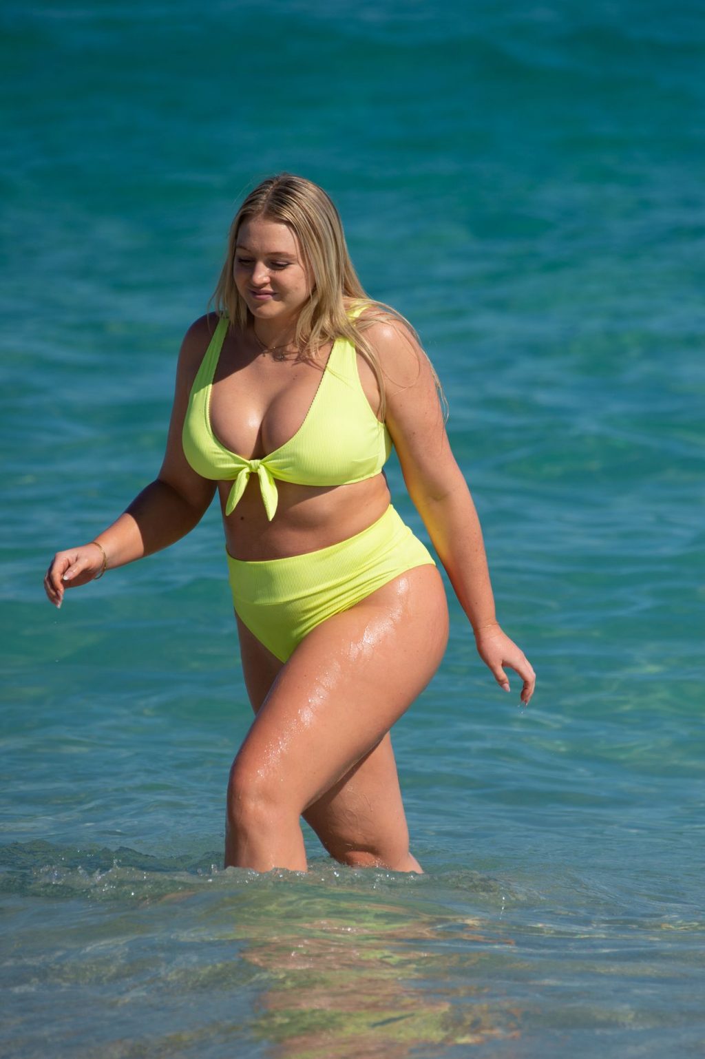 Grávida, Iskra Lawrence exibe sua crescente barriga de bebê em Miami Beach. A modelo curvilínea foi vista usando um biquíni amarelo chamativo enquanto se refrescava com um mergulho no oceano na sexta-feira.