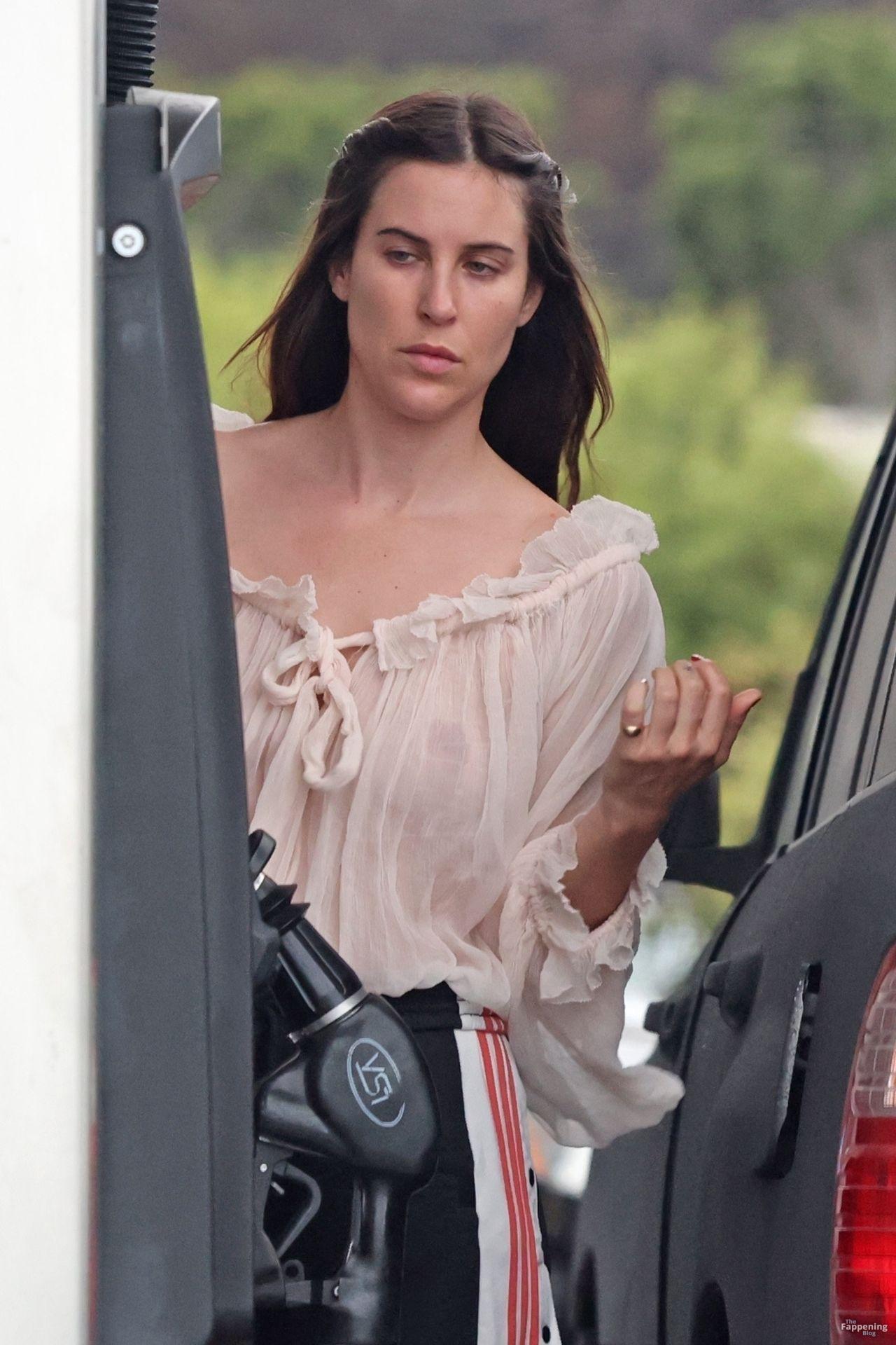 Scout LaRue Willis está aqui arrasando enquanto abastece o carro, vestindo uma blusa fluida chique e calças listradas, lidando com a tampa do combustível com facilidade.