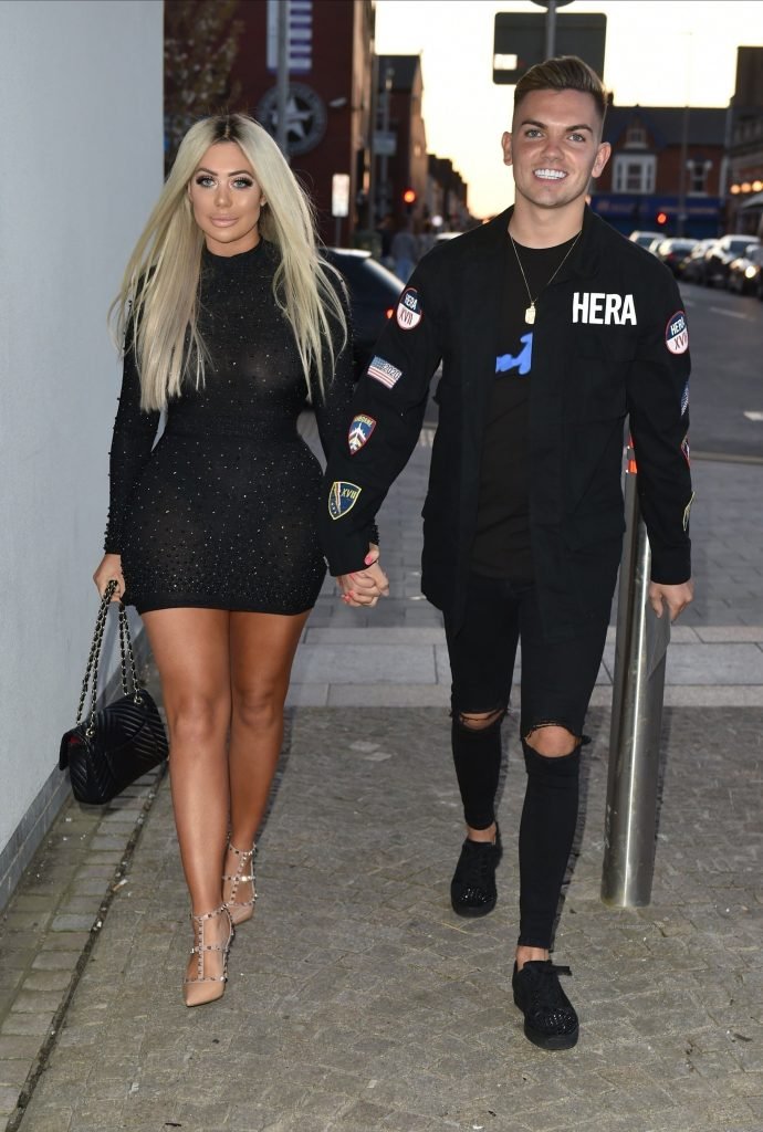 Braless estrela de TV Chloe Ferry, 22, usa um vestido preto transparente muito ousado durante uma noite em Middlesbrough com o namorado Sam Gowland, 21/04/2018. O casal participou da festa de noivado de seus amigos na Universidade Estudantil de Teesside antes de ir para Yarm em Teesside.