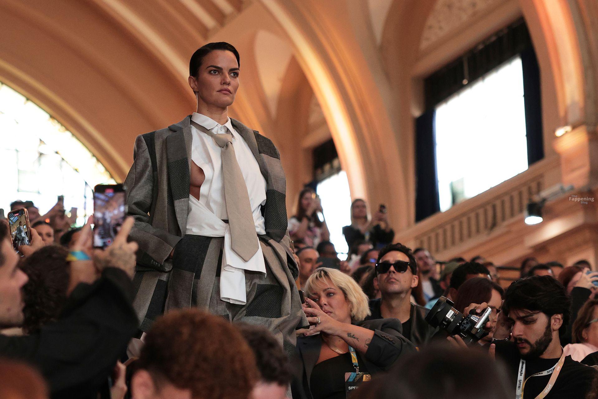 A modelo Barbara Fialho foi fotografada sem sutiã na passarela para João Pimenta na São Paulo Fashion Week.