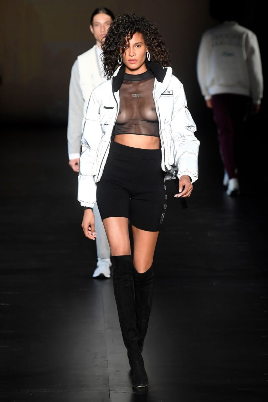 Model Cindy Bruna foi fotografada com uma blusa transparente sem sutiã na passarela do desfile Kith Primavera/Verão 2020 durante a New York Fashion Week, 05/09/2019.