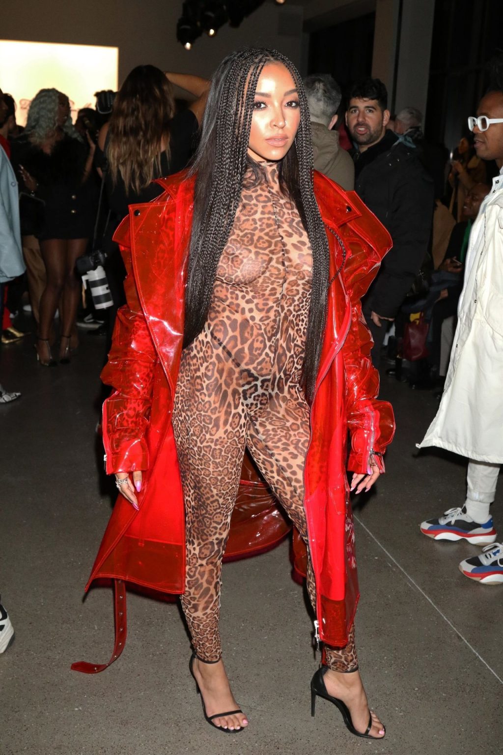 Tinashe foi fotografada usando um body transparente com estampa de oncinha ao chegar no desfile de moda LaQuan Smith durante o NYFW 2020 no Spring Studios em Nova York, 08/02/2020.