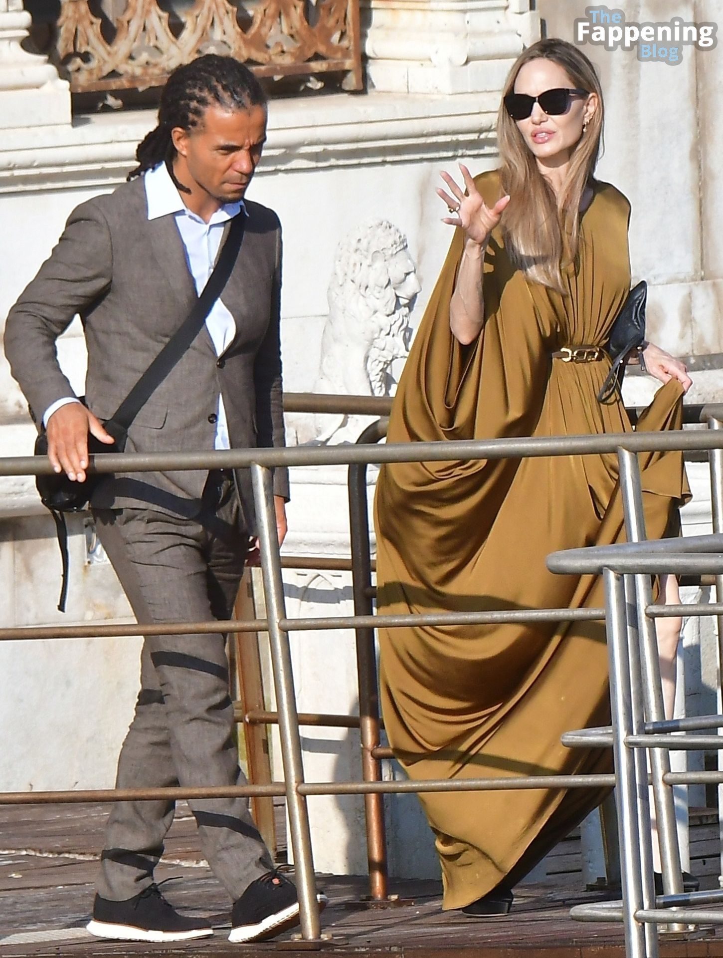 A atriz americana Angelina Jolie está deslumbrante em um vestido de estilo grego, curtindo ao lado do rapper Akala enquanto eles saem do hotel para ir à estreia de ‘Maria’ no Festival de Cinema de Veneza.