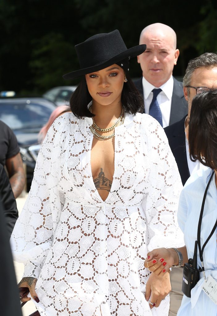 Rihanna mostra um pouco de decote enquanto está em Paris, 16/06/2017. Rihanna é uma cantora/compositora de R&B, atriz (Bates Motel) de St. Michael, Barbados. Idade – 29 anos.