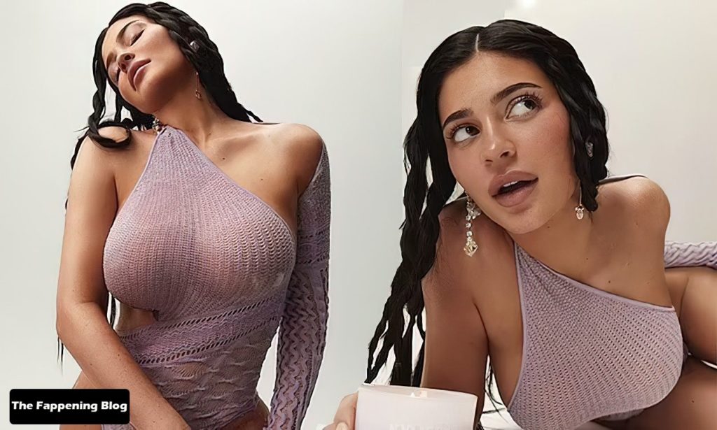 Modelo Kylie Jenner exibe curvas voluptuosas em body revelador enquanto promove sua nova coleção lavanda Kylie Skin (maio de 2022).